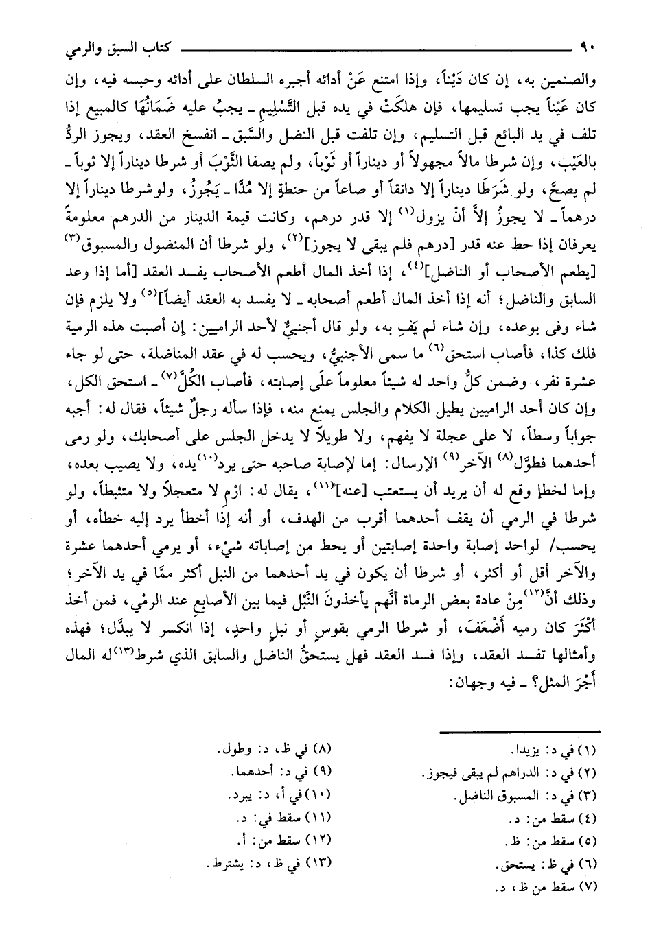 والصنمين به، إن كان ديناً، وإذا امتنع عن أدائه أجبره السلطان على أدائه وحبسه فيه، وإن كان عيناً يجب تسليمها، فإن هلكت في يده قبل التسليم- يجب عليه ضمانها كالمبيع إذا تلف في يد البائع قبل التسليم، وإن تلفت قبل النضل والسبق- انفسخ العقد، ويجوز الرد بالعيب، وإن شرطا مالاً مجهولاً أو ديناراً أو ثوباً، ولم يصفا الثوب أو شرطا ديناراً إلا ثوباً- لم يصح، ولو شرطا ديناراً إلا دانقاً أو صاعاً من حنطة إلا مداً- يجوز، ولو شرطا ديناراً إلا درهماً- لا يجوز إلا أن يزول إلا قدر درهم، وكانت قيمة الدينار من الدرهم معلومة يعرفان إذا حط عنه قدر [درهم فلم يبقى لا يجوز]، ولو شرطا أن المنضول والمسبوق [يطعم الأصحاب أو الناضل]، إذا أخذ المال أطعم الأصحاب يفسد العقد [أما إذا وعد السابق والناضل؛ أنه إذا أخذ المال أطعم أصحابه- لا يفسد به العقد أيضاً] ولا يلزم فإن شاء وفي بوعده، وإن شاء لم يف به، ولو قال أجنبي لأد الراميين: إن أصبت هذه الرمية فلك كذا، فأصاب استحق ما سمى الأجنبي، ويحسب له في عقد المناضلة، حتى لو جاء عشرة نفر، وضمن كل واحد له شيئاً معلوماً على إصابته، فأصاب الكل- ستحق الكل، وإن كان أحد الراميين يطيل الكلام والجلس يمنع منه، فإذا سأله رجل شيئاً، فقال له: أجبه جواباً وسطاً، لا على عجلة لا يفهم، ولا طويلاً لا يدخل الجلس على أصحابك، ولو رمى أحدهما فطول الآخر الإرسال: إما لإصابة صاحبه حتى يرد يده، ولا يصيب بعده، وإما لخطأ وقع له أن يريد أن يستعتب [عنه]، يقال له: ارم لا متعجلاً ولا متثبطاً، ولو شرطا في الرمي أن يقف أحدهما أقرب من الهدف، أو أنه إذا أخطأ يرد إليه خطأه، أو يحسب/ لواحد إصابة واحدة إصابتين أو يحط من إصاباته شيء، أو يرمي أحدهما عشرة والآخر أقل أو أكثر، أو شرطاً أن يكون في يد أحدهما من النبل أكثر مما في يد الآخر؛ وذلك أن من عادة بعض الرماة أنهم يأخذون النبل فيما بين الأصابع عند الرمي، فمن أخذ أكثر كان رميه أضعف، أو شرطا الرمي بقوس أو نبل واحد، إذا انكسر لا يبدل؛ فهذه وأمثالها تفسد العقد، وإذا فسد العقد فهل يستحق الناضل والسابق الذي شرط له المال أجر المثل؟ - فيه وجهان: