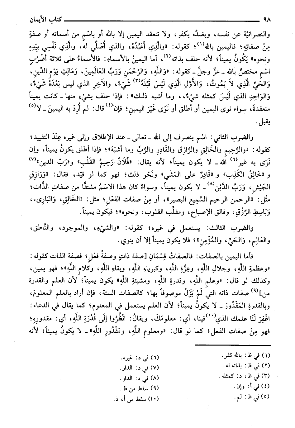 فأما اليمين بالصفات: فالصفات قسمان [صفة ذات وصفة فعل؛ فصفة الذات كقوله: "وعظمة الله، وجلال الله، وعزة الله، وكبرياء الله، وبقاء الله، وكلام الله"؛ فهو يمين، وكذلك لو قال: "وعلم الله، وقدرة الله، ومشيئة الله" يكون يميناً؛ لأن العلم والقدرة من] صفات ذاته التي لم يزل موصوفاً بها؛ كالصفات الستة، فإن أراد بالعلم المعلوم، وبالقدرة المقدور- لا يكون يميناً؛ لأن العلم يستعمل في المعلوم؛ كما يقال في الدعاء: اغفر لنا علمك الذي فينا، أي: معلومك، ويقال: "انظروا إلى قدرة الله، أي: مقدوره؛ فهو من صفات الفعل؛ كما لو قال: "ومعلوم الله، ومقدور الله"- لا يكون يميناً؛ لأنه