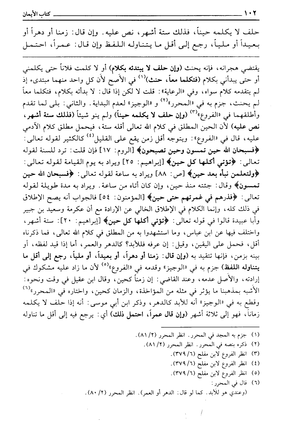 ـــــــــــــــــــــــــــــQيَقْتَضِي هِجْرَانَهُ، فَإِنَّهُ يَحْنَثُ (وَإِنْ حَلَفَ لَا يَبْتَدِئُهُ بِكَلَامٍ) أَوْ لَا كَلَّمْتُ فُلَانًا حَتَّى يُكَلِّمَنِي، أَوْ حَتَّى يَبْدَأَنِي بِكَلَامٍ، (فَتَكَلَّمَا مَعًا، حَنِثَ) فِي الْأَصَحِّ، لِأَنَّ كُلَّ وَاحِدٍ مِنْهُمَا مُبْتَدِئٌ، إِذْ لَمْ يَتَقَدَّمْهُ كَلَامٌ سِوَاهُ، وَفِي الرِّعَايَةِ: قُلْتُ: لَا، لَكِنْ إِذَا قَالَ: لَا بَدَأْتُهُ بِكَلَامٍ، فَتَكَلَّمَا مَعًا، لَمْ يَحْنَثْ، جَزَمَ بِهِ فِي الْمُحَرَّرِ وَالْوَجِيزِ، لِعَدَمِ الْبِدَايَةِ، وَالثَّانِي: بَلَى، لِمَا تَقَدَّمَ، وَأَطْلَقَهُمَا فِي الْفُرُوعِ (وَإِنْ حَلَفَ لَا يُكَلِّمُهُ حِينًا) وَلَمْ يَنْوِ شَيْئًا (فَذَلِكَ سِتَّةُ أَشْهُرٍ، نَصَّ عَلَيْهِ) لِأَنَّ الْحِينَ الْمُطْلَقَ فِي كَلَامِ اللَّهِ تَعَالَى أَقَلُّهُ سِتَّةٌ، فَيُحْمَلُ مُطْلَقُ كَلَامِ الْآدَمِيِّ عَلَيْهِ، قَالَ فِي الْفُرُوعِ، وَيَتَوَجَّهُ أَقَلُّ زَمَنٍ يَقَعُ عَلَى الْقَلِيلِ كَالْكَثِيرِ، لِقَوْلِهِ تَعَالَى: {فَسُبْحَانَ اللَّهِ حِينَ تُمْسُونَ وَحِينَ تُصْبِحُونَ} [الروم: 17] ، فَإِنْ قُلْتَ تَرِدُ لِلسَّنَةِ، لِقَوْلِهِ تَعَالَى: {تُؤْتِي أُكُلَهَا كُلَّ حِينٍ} [إبراهيم: 25] ، وَيُرَادُ بِهِ يَوْمُ الْقِيَامَةِ، لِقَوْلِهِ تَعَالَى: {وَلَتَعْلَمُنَّ نَبَأَهُ بَعْدَ حِينٍ} [ص: 88] ، وَيُرَادُ بِهِ سَاعَةٌ، لِقَوْلِهِ تَعَالَى: {فَسُبْحَانَ اللَّهِ حِينَ تُمْسُونَ} [الروم: 17] وقال: جِئْتُهُ مُنْذُ حِينٍ، وَإِنْ كَانَ أَتَاهُ مِنْ سَاعَةٍ، وَيُرَادُ بِهِ مُدَّةٌ طَوِيلَةٌ، لِقَوْلِهِ تَعَالَى: {فَذَرْهُمْ فِي غَمْرَتِهِمْ حَتَّى حِينٍ} [المؤمنون: 54] ، فَالْجَوَابُ: أَنَّهُ يَصِحُّ الْإِطْلَاقُ فِي ذَلِكَ كُلِّهِ، وَإِنَّمَا الْكَلَامُ فِي الْإِطْلَاقِ الْخَالِي عَنِ الْإِرَادَةِ، مَعَ أَنَّ عِكْرِمَةَ وَسَعِيدَ بْنَ جُبَيْرٍ وَأَبَا عُبَيْدَةَ قَالُوا فِي قَوْله تَعَالَى: {تُؤْتِي أُكُلَهَا كُلَّ حِينٍ} [إبراهيم: 25] ، سِتَّةَ أَشْهُرٍ، وَاخْتُلِفَ فِيهَا عَنِ ابْنِ عَبَّاسٍ، وَمَا اسْتُشْهِدُوا بِهِ مِنَ الْمُطْلَقِ فِي كَلَامِ اللَّهِ تَعَالَى، فَمَا ذَكَرْنَاهُ أَقَلُّ، فَحُمِلَ عَلَى الْيَقِينِ، وَقِيلَ: إِنْ عَرَّفَهُ فَلِلْأَبَدِ، كَالدَّهْرِ وَالْعُمُرِ، أَمَّا إِذَا قَيَّدَ لَفْظَهُ، أَوْ بَيَّنَهُ بِزَمَنٍ، فَإِنَّهَا تَتَقَيَّدُ بِهِ، (وَإِنْ قَالَ: زَمَنًا، أَوْ دَهْرًا، أَوْ بَعِيدًا، أَوْ مَلِيًّا، رَجَعَ إِلَى أَقَلِّ مَا يَتَنَاوَلُهُ اللَّفْظُ) جَزَمَ بِهِ فِي الْوَجِيزِ، وَقَدَّمَهُ فِي الْفُرُوعِ، لِأَنَّ مَا زَادَ عَلَيْهِ مَشْكُوكٌ فِي إِرَادَتِهِ، وَالْأَصْلُ عَدَمُهُ، وَعِنْدَ الْقَاضِي: إِنَّ زَمَنًا كَحِينٍ، وَقَالَ ابْنُ عَقِيلٍ: فِي وَقْتٍ وَنَحْوِهِ الْأَشْبَهُ بِمَذْهَبِنَا مَا يُؤَثِّرُ فِي مِثْلِهِ مِنَ الْمُؤَاخَذَةِ وَالزَّمَانِ كَحِينٍ، وَاخْتَارَه فِي الْمُحَرَّرِ، وَقَطَعَ بِهِ فِي الْوَجِيزِ أَنَّهُ لِلْأَبَدِ كَالدَّهْرِ، وَذَكَرَ ابْنُ أَبِي مُوسَى: أَنَّهُ إِذَا حَلَفَ لَا يُكَلِّمُهُ زَمَانًا، فَهُوَ إِلَى ثَلَاثَةِ أَشْهُرٍ، (وَإِنْ قَالَ: عُمُرًا، احْتَمَلَ ذَلِكَ) أَيْ: يَرْجِعُ فِيهِ إِلَى أَقَلِّ مَا تَنَاوَلَهُ