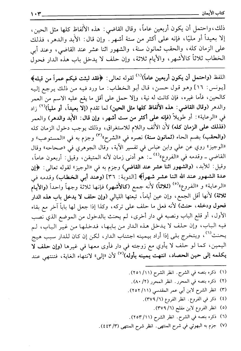 ذلك، واحتمل أَنْ يَكُونَ أَرْبَعِينَ عَامًا، وَقَالَ الْقَاضِي: هَذِهِ الْأَلْفَاظُ كُلُّهَا مِثْلَ الْحِينِ، إِلَّا بَعِيدًا أَوْ مَلِيًّا، فَإِنَّهُ عَلَى أَكْثَرِ مِنْ سِتَّةِ أَشْهُرٍ، وَإِنْ قَالَ: الْأَبَدَ، وَالدَّهْرَ، فَذَلِكَ عَلَى الزَّمَانِ كُلِّهِ، وَالْحُقْبُ: ثَمَانُونَ سَنَةً، وَالشُّهُورُ: اثْنَا عَشَرَ، عِنْدَ الْقَاضِي، وَعِنْدَ أَبِي الْخَطَّابِ ثَلَاثًا كَالْأَشْهُرِ، وَالْأَيَّامُ: ثَلَاثَةٌ، وَإِنْ حَلَفَ لَا يَدْخُلُ بَابَ هَذِهِ الدَّارِ فَحَوَّلَ