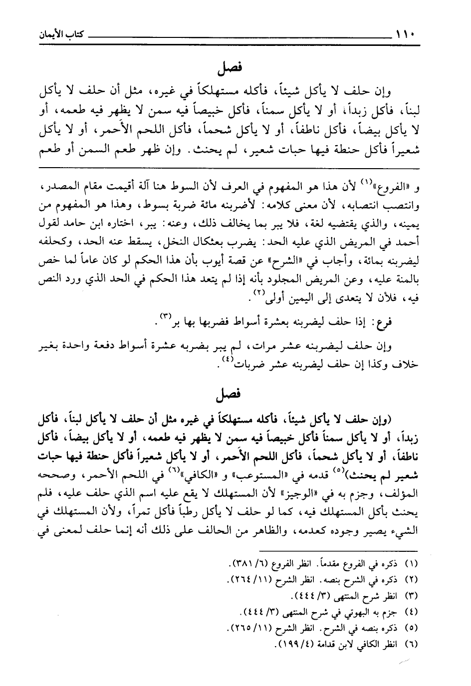 فَصْلٌ (وَإِنْ حَلَفَ لَا يَأْكُلُ شَيْئًا، فَأَكَلَهُ مُسْتَهْلَكًا فِي غَيْرِهِ، مِثْلَ أَنْ حَلَفَ لَا يَأْكُلُ لَبَنًا، فَأَكَلَ زُبْدًا، أَوْ لَا يَأْكُلُ سَمْنًا، فَأَكَلَ خَبِيصًا فِيهِ سَمْنٌ لَا يَظْهَرُ فِيهِ طَعْمُهُ، أَوْ لَا يَأْكُلُ بَيْضًا، فَأَكَلَ نَاطِفًا، أَوْ لَا يَأْكُلُ شَحْمًا، فَأَكَلَ اللَّحْمَ الْأَحْمَرَ، أَوْ لَا يَأْكُلُ شَعِيرًا، فَأَكَلَ حِنْطَةً فِيهَا حَبَّاتُ شَعِيرٍ، لَمْ يَحْنَثْ) قَدَّمَهُ فِي الْمُسْتَوْعِبِ وَالْكَافِي فِي اللَّحْمِ الْأَحْمَرِ، وَصَحَّحَهُ الْمُؤَلِّفُ، وَجَزَمَ بِهِ فِي الْوَجِيزِ، لِأَنَّ الْمُسْتَهْلَكَ لَا يَقَعُ عَلَيْهِ اسْمُ الَّذِي حُلِفَ عَلَيْهِ، فَلَمْ يَحْنَثْ بِأَكْلِ الْمُسْتَهْلَكِ فِيهِ، كَمَا لَوْ حَلَفَ لَا يَأْكُلُ رُطَبًا، فَأَكَلَ تَمْرًا، وَلِأَنَّ الْمُسْتَهْلَكَ فِي الشَّيْءِ يَصِيرُ وُجُودُهُ كَعَدَمِهِ، وَالظَّاهِرُ مِنَ الْحَالِفِ عَلَى ذَلِكَ أَنَّهُ إِنَّمَا حَلَفَ لِمَعْنًى في