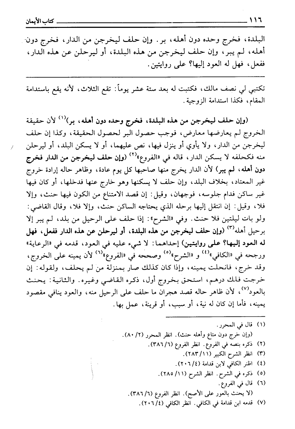 (وَإِنْ حَلَفَ لَيَخْرُجَنَّ مِنْ هَذِهِ الْبَلْدَةِ، فَخَرَجَ وَحْدَهُ دُونَ أَهْلِهِ بَرَّ) لِأَنَّ حَقِيقَةَ الْخُرُوجِ لَمْ يُعَارِضْهَا مُعَارِضٌ، فَوَجَبَ حُصُولُ الْبِرِّ لِحُصُولِ الْحَقِيقَةِ، وَكَذَا إِنْ حَلَفَ لَيَخْرُجَنَّ مِنَ الدَّارِ وَلَا يَأْوِي أَوْ يَنْزِلُ فِيهَا، نَصَّ عَلَيْهِمَا، أَوْ لَا يَسْكُنُ الْبَلَدَ، أَوْ لَيَرْحَلَنَّ مِنْهُ، فَكَحَلِفِهِ لَا يَسْكُنُ الدَّارَ، قَالَهُ فِي الْفُرُوعِ (وَإِنْ حَلَفَ لَيَخْرُجَنَّ مِنَ الدَّارِ، فَخَرَجَ دُونَ أَهْلِهِ لَمْ يَبِرَّ) لِأَنَّ الدَّارَ يَخْرُجُ مِنْهَا صَاحِبُهَا كُلَّ يَوْمٍ عَادَةً، وَظَاهِرُ حَالِهِ إِرَادَةُ خروج غير الْمُعْتَادِ، بِخِلَافِ الْبَلَدِ، وَإِنْ حَلَفَ لَا يَسْكُنُهَا وَهُوَ خَارِجٌ عَنْهَا فَدَخَلَهَا، أَوْ كَانَ فِيهَا غَيْرَ سَاكِنٍ فَدَامَ جُلُوسُهُ، فَوَجْهَانِ، وَقِيلَ: إِنْ قَصَدَ الِامْتِنَاعَ مِنَ الْكَوْنِ فِيهَا حَنِثَ، وَإِلَّا فَلَا، وَقِيلَ: إِنِ انْتَقَلَ إِلَيْهَا بِرَحْلِهِ الَّذِي يَحْتَاجُهُ السَّاكِنُ حَنِثَ، وَإِلَّا فَلَا، وَقَالَ الْقَاضِي: وَلَوْ بَاتَ لَيْلَتَيْنِ فَلَا حِنْثَ، وَفِي الشَّرْحِ: إِذَا حَلَفَ عَلَى الرَّحِيلِ منْ بَلَدٍ لَمْ يَبِرَّ إِلَّا بِرَحِيلِ أَهْلِهِ (وَإِنْ حَلَفَ لَيَخْرُجَنَّ مِنْ هَذِهِ الْبَلْدَةِ، أَوْ لَيَرْحَلَنَّ عَنْ هَذِهِ الدَّارِ فَفَعَلَ، فَهَلْ لَهُ الْعُودُ إِلَيْهَا؟ عَلَى رِوَايَتَيْنِ) .
