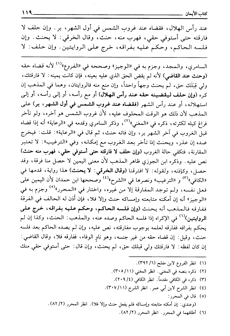 ـــــــــــــــــــــــــــــQالسَّامِرِيُّ وَالْمَجْدُ، وَجَزَمَ بِهِ فِي الْوَجِيزِ، وَصَحَّحَهُ فِي الْفُرُوعِ، لِأَنَّهُ قَضَاهُ حَقَّهُ (وَحَنِثَ عِنْدَ الْقَاضِي) لِأَنَّهُ لَمْ يَقْضِ الْحَقَّ الَّذِي عَلَيْهِ بِعَيْنِهِ، فَإِنْ كَانَتْ يَمِينُهُ: لَا فَارَقْتُكَ وَلِي قِبَلَكَ حَقٌّ، لَمْ يَحْنَثْ وَجْهًا وَاحِدًا، وَإِنْ مُنِعَ مِنْهُ فَالرِّوَايَتَانِ، وَهُمَا فِي الْمَذْهَبِ إِنْ كُرِهَ، (وَإِنْ حَلَفَ لَيَقْضِيَنَّهُ حَقَّهُ عِنْدَ رَأْسِ الْهِلَالِ) أَوْ مَعَ رَأْسِهِ، أَوْ إِلَى رَأْسِهِ، أَوْ إِلَى اسْتِهْلَالِهِ، أَوْ عِنْدَ رَأْسِ الشَّهْرِ، (فَقَضَاهُ عِنْدَ غُرُوبِ الشَّمْسِ فِي أَوَّلِ الشَّهْرِ بَرَّ) عَلَى الْمَذْهَبِ، لِأَنَّ ذَلِكَ هُوَ الوقت المحلوف عَلَيْهِ، لِأَنَّ غُرُوبَ الشَّمْسِ هُوَ آخِرُهُ، وَلَوْ تَأَخَّرَ فَرَاغُ كَيْلِهِ لِكَثْرَتِهِ، ذَكَرَهُ فِي الْمُغْنِي، وَذَكَرَ السَّامِرِيُّ، وَقَدَّمَهُ فِي الرِّعَايَةِ، أَنَّهُ إِذَا قَضَاهُ قَبْلَ الْغُرُوبِ فِي آخِرِ الشَّهْرِ بَرَّ، وَإِنْ فَاتَهُ حَنِثَ، ثُمَّ قَالَ فِي الرِّعَايَةِ: قُلْتُ: فَيَخْرُجُ ضِدُّهُ إِنْ عُذِرَ، وَيَحْنَثُ إِذَا تَأَخَّرَ بَعْدَ الْغُرُوبِ مَعَ إِمْكَانِهِ، وَفِي التَّرْغِيبِ: لَا تُعْتَبَرُ الْمُقَارَنَةُ، فَتَكْفِي حَالَةُ الْغُرُوبِ (وَإِنْ حَلَفَ: لَا فَارَقْتُهُ حَتَّى أَسْتَوْفِيَ حَقِّي، فَهَرَبَ مِنْهُ حَنِثَ) نَصَّ عَلَيْهِ، وَذَكَرَهُ ابْنُ الْجَوْزِيِّ ظَاهِرُ الْمَذْهَبِ، لِأَنَّ مَعْنَى الْيَمِينِ لَا حَصَلَ مِنَّا فُرْقَةٌ، وَقَدْ حَصَلَ، وَكَإِذْنِهِ، وَلِقَوْلِهِ: لَا افْتَرَقْنَا، (وَقَالَ الْخِرَقِيُّ: لَا يَحْنَثُ) هَذَا رِوَايَةٌ، قَدَّمَهَا فِي الْكَافِي وَالتَّرْغِيبِ، وَنَصَرَهَا فِي الشَّرْحِ، وَصَحَّحَهَا ابْنُ حَمْدَانَ، لِأَنَّ الْيَمِينَ عَلَى فِعْلِ نَفْسِهِ، وَلَمْ تُوجَدِ الْمُفَارَقَةُ إِلَّا مِنْ غَيْرِهِ، وَاخْتَارَ فِي الْمُحَرَّرِ، وَجَزَمَ بِهِ فِي الْوَجِيزِ: أَنَّهُ إِنْ أَمْكَنَهُ مُتَابَعَتُهُ وَإِمْسَاكُهُ حَنِثَ، وَإِلَّا فَلَا، فَإِنْ أَذِنَ لَهُ الْحَالِفُ فِي الْفُرْقَةِ فَفَارَقَهُ، فَالْمَذْهَبُ أَنَّهُ يَحْنَثُ (وَإِنْ فَلَّسَهُ الْحَاكِمُ، وَحَكَمَ عَلَيْهِ بِفِرَاقِهِ، خُرِّجَ عَلَى الرِّوَايَتَيْنِ) فِي الْإِكْرَاهِ إِذَا فَلَّسَهُ الْحَاكِمُ وَصَدَّهُ عَنْهُ، وَالْمَذْهَبُ الْحِنْثُ، وَكَذَا إِنْ لَمْ يَحْكُمْ بِفِرَاقِهِ، فَفَارَقَهُ لِعِلْمِهِ بِوُجُوبِ مُفَارَقَتِهِ، نَصَّ عَلَيْهِ، وَإِنْ لَمْ يَصُدَّهُ الْحَاكِمُ بَعْدَ فَلَسِهِ حَنِثَ، وَقِيلَ: إِنْ قَضَاهُ حَقَّهُ مِنْ غَيْرِ جِنْسِهِ وَهُوَ نَاوٍ الْوَفَاءَ، فَفَارَقَهُ، فَلَا، وَقَالَ الْقَاضِي: إِنْ كَانَ لَفْظُهُ: لَا فَارَقْتُكَ وَلِي قِبَلَكَ حَقٌّ، لَمْ يَحْنَثْ، وَإِنْ قَالَ: حَتَّى أَسْتَوْفِيَ حَقِّي مِنْكَ