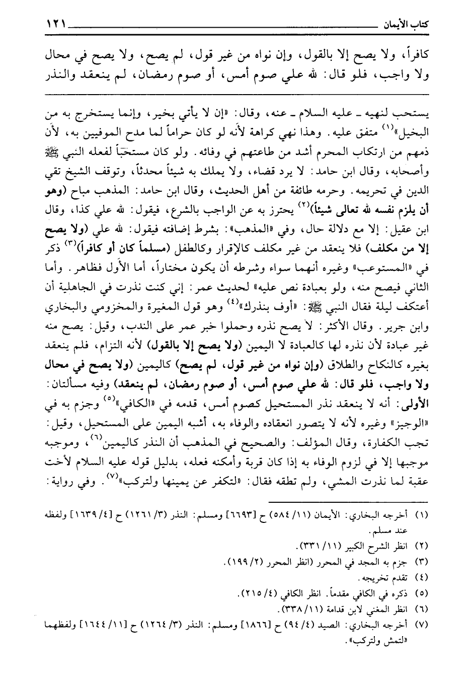ـــــــــــــــــــــــــــــQيُسْتَحَبُّ، لِنَهْيِهِ - عَلَيْهِ السَّلَامُ - عَنْهُ، وَقَالَ: «إِنَّهُ لَا يَأْتِي بِخَيْرٍ، وَإِنَّمَا يُسْتَخْرَجُ بِهِ مِنَ الْبَخِيلِ» . مُتَّفَقٌ عَلَيْهِ. وَهَذَا نَهْيُ كَرَاهَةٍ، لِأَنَّهُ لَوْ كَانَ حَرَامًا، لَمَا مَدَحَ الْمُوفِينَ بِهِ، لَأَنَّ ذَمَّهُمْ مِنَ ارْتِكَابِ الْمُحَرَّمِ أَشَدُّ مِنْ طَاعَتِهِمْ فِي وَفَائِهِ، وَلَوْ كَانَ مُسْتَحَبًّا لَفَعَلَهُ النَّبِيُّ - صَلَّى اللَّهُ عَلَيْهِ وَسَلَّمَ - وَأَصْحَابُهُ، وَقَالَ ابْنُ حَامِدٍ: لَا يَرُدُّ قَضَاءً، وَلَا يَمْلِكُ بِهِ شَيْئًا مُحْدَثًا، وَتَوَقَّفَ الشَّيْخُ تَقِيُّ الدِّينِ فِي تَحْرِيمِهِ، وَحَرَّمَهُ طَائِفَةٌ مِنْ أَهْلِ الْحَدِيثِ، وَقَالَ ابْنُ حَامِدٍ: الْمَذْهَبُ مُبَاحٌ (وَهُوَ: أَنْ يُلْزِمَ نَفْسَهُ لِلَّهِ تَعَالَى شَيْئًا) يَحْتَرِزُ بِهِ عَنِ الْوَاجِبِ بِالشَّرْعِ، فَيَقُولُ: لِلَّهِ عَلَيَّ كَذَا، وَقَالَ ابْنُ عَقِيلٍ: إِلَّا مَعَ دَلَالَةِ حَالٍ، وَفِي الْمَذْهَبِ: بِشَرْطِ إِضَافَتِهِ، فَيَقُولُ: لِلَّهِ عَلَيَّ (وَلَا يَصِحُّ إِلَّا مِنْ مُكَلَّفٍ) فَلَا يَنْعَقِدُ مِنْ غَيْرِ مُكَلَّفٍ، كَالْإِقْرَارِ وَكَالطِّفْلِ، (مُسْلِمًا كَانَ أَوْ كَافِرًا) ذَكَرَ فِي الْمُسْتَوْعِبِ وَغَيْرِهِ: أَنَّهُمَا سَوَاءٌ، وَشَرْطُهُ: أَنْ يَكُونَ مُخْتَارًا، أَمَّا الْأَوَّلُ، فَظَاهِرٌ، وَأَمَّا الثَّانِي فَيَصِحُّ مِنْهُ، وَلَوْ بِعِبَادَةٍ، نَصَّ عَلَيْهِ، لِحَدِيثِ عُمَرَ: إِنِّي كُنْتُ نَذَرْتُ فِي الْجَاهِلِيَّةِ أَنْ أَعْتَكِفَ لَيْلَةً، فَقَالَ النَّبِيُّ - صَلَّى اللَّهُ عَلَيْهِ وَسَلَّمَ -: «أَوْفِ بِنَذْرِكَ.» وَهُوَ قَوْلُ الْمُغِيرَةِ، وَالْمَخْزُومِيِّ، وَالْبُخَارِيِّ، وَابْنِ جَرِيرٍ، وَقَالَ الْأَكْثَرُ: لَا يَصِحُّ نَذْرُهُ، وَحَمَلُوا خَبَرَ عُمَرَ عَلَى النَّدْبِ، وَقِيلَ: يَصِحُّ مِنْهُ غَيْرَ عِبَادَةٍ، لِأَنَّ نَذْرَهُ لَهَا كَالْعِبَادَةِ لَا الْيَمِينِ (وَلَا يَصِحُّ إِلَّا بِالْقَوْلِ) لِأَنَّهُ الْتِزَامٌ، فَلَمْ يَنْعَقِدْ بِغَيْرِهِ، كَالنِّكَاحِ وَالطَّلَاقِ، (وَإِنْ نَوَاهُ مِنْ غَيْرِ قَوْلٍ لَمْ يَصِحَّ) كَالْيَمِينِ (وَلَا يَصِحُّ فِي مُحَالٍ وَلَا وَاجِبٍ، فَلَوْ قَالَ: لِلَّهِ عَلَيَّ صَوْمُ أَمْسِ، أَوْ صَوْمُ رَمَضَانَ، لَمْ يَنْعَقِدْ) وَفِيهِ مَسْأَلَتَانِ: الْأُولَى: أَنَّهُ لَا يَنْعَقِدُ نَذْرُ الْمُسْتَحِيلِ، كَصَوْمِ أَمْسِ، قَدَّمَهُ فِي الْكَافِي، وَجَزَمَ بِهِ فِي الْوَجِيزِ وَغَيْرِهِ، لِأَنَّهُ لَا يُتَصَوَّرُ انْعِقَادُهُ، وَالْوَفَاءُ بِهِ أَشْبَهَ الْيَمِينَ عَلَى الْمُسْتَحِيلِ، وَقِيلَ: تَجِبُ الْكَفَّارَةُ، قَالَ الْمُؤَلِّفُ: وَالصَّحِيحُ فِي الْمَذْهَبِ أَنَّ النَّذْرَ كَالْيَمِينِ، وَمُوجِبُهُ مُوجِبُهَا، إِلَّا فِي لُزُومِ الْوَفَاءِ بِهِ إِذَا كَانَ قُرْبَةً، وَأَمْكَنَهُ فِعْلُهُ، بِدَلِيلِ قَوْلِهِ - عَلَيْهِ السَّلَامُ - لِأُخْتِ عُقْبَةَ، لَمَّا نَذَرَتِ الْمَشْيَ، وَلَمْ تُطِقْهُ، فَقَالَ: «لِتُكَفِّرْ عَنْ يَمِينِهَا، وَلْتَرْكَبْ» ، وَفِي رِوَايَةٍ: