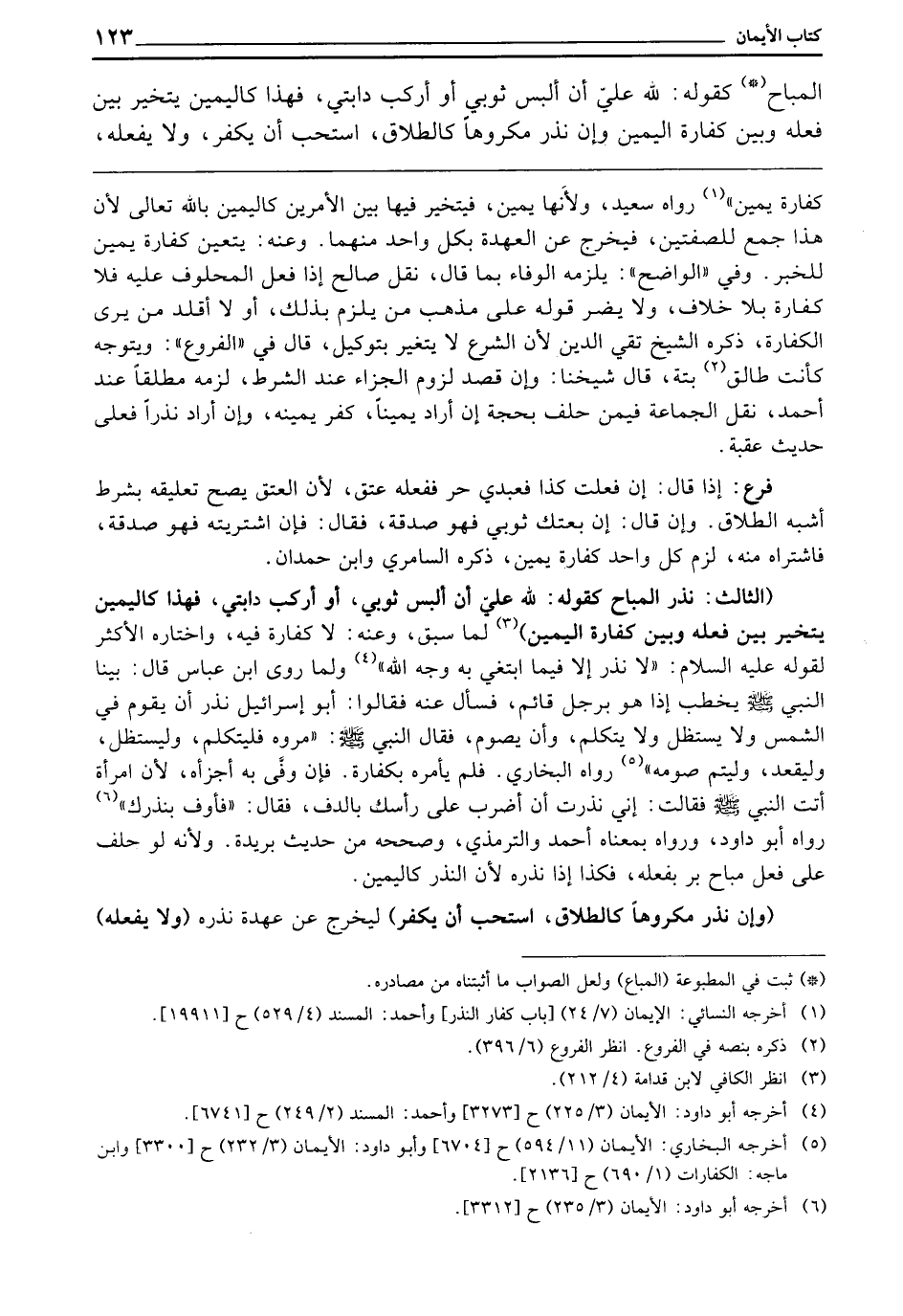 الْمُبَاحِ، كَقَوْلِهِ: لِلَّهِ عَلَيَّ أَنْ أَلْبَسَ ثَوْبِي، أَوْ أَرْكَبَ دَابَّتِي، فَهَذَا كَالْيَمِينِ يَتَخَيَّرُ بَيْنَ فِعْلِهِ وَبَيْنَ كَفَّارَةِ الْيَمِينِ. وَإِنْ نَذَرَ مَكْرُوهًا كَالطَّلَاقِ اسْتُحِبَّ أَنْ يُكَفِّرَ وَلَا يَفْعَلَهُ.
