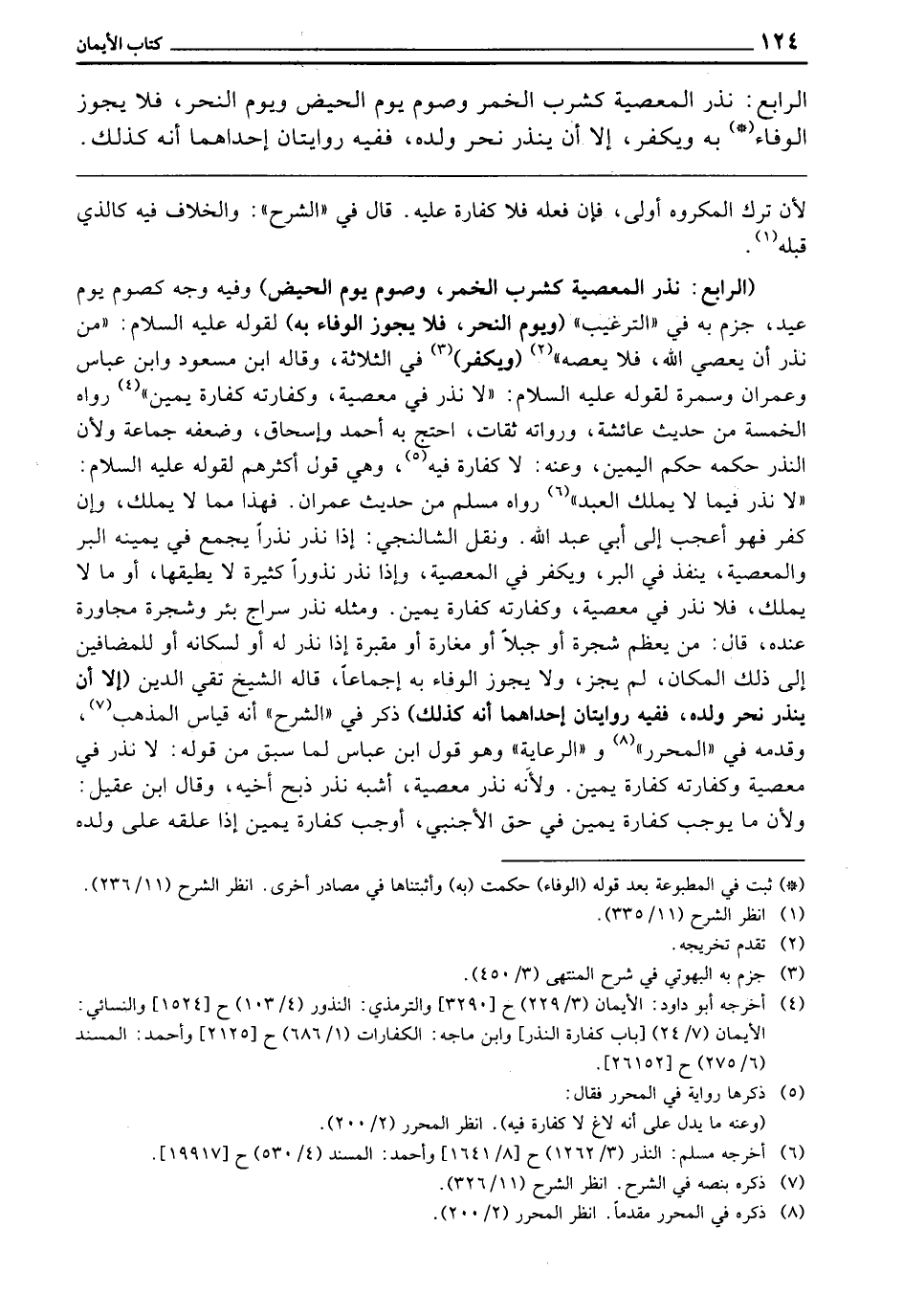 (الرَّابِعُ: نَذْرُ الْمَعْصِيَةِ، كَشُرْبِ الْخَمْرِ، وَصَوْمِ يَوْمِ الْحَيْضِ) وَفِيهِ وَجْهٌ، كَصَوْمِ يَوْمِ عِيدٍ، جَزَمَ بِهِ فِي التَّرْغِيبِ (وَيَوْمِ النَّحْرِ، فَلَا يَجُوزُ الْوَفَاءُ بِهِ) لِقَوْلِهِ - عَلَيْهِ السَّلَامُ -: «مَنْ نَذَرَ أَنْ يَعْصِيَ اللَّهَ فَلَا يَعْصِهِ.» (وَيُكَفِّرُ) فِي الثَّلَاثَةِ، وَقَالَهُ ابْنُ مَسْعُودٍ، وَابْنُ عَبَّاسٍ، وَعِمْرَانُ، وَسَمُرَةُ، لِقَوْلِهِ - عَلَيْهِ السَّلَامُ -: «لَا نَذْرَ فِي مَعْصِيَةٍ، وَكَفَّارَتُهُ كَفَّارَةُ يَمِينٍ» . رَوَاهُ الْخَمْسَةُ مِنْ حَدِيثِ عَائِشَةَ، وَرُوَاتُهُ ثِقَاتٌ، احْتَجَّ بِهِ أَحْمَدُ، وَإِسْحَاقُ، وَضَعَّفَهُ جَمَاعَةٌ، وَلِأَنَّ النَّذْرَ حُكْمُهُ حُكْمُ الْيَمِينِ، وَعَنْهُ: لَا كَفَّارَةَ فِيهِ، وَهِيَ قَوْلُ أَكْثَرِهِمْ، لِقَوْلِهِ - عَلَيْهِ السَّلَامُ -: «لَا نَذْرَ فِيمَا لَا يَمْلِكُ الْعَبْدُ» . رَوَاهُ مُسْلِمٌ مِنْ حَدِيثِ عِمْرَانَ، فَهَذَا مِمَّا لَا يَمْلِكُ، وَإِنْ كَفَّرَ فَهُوَ أَعْجَبُ إِلَى أَبِي عَبْدِ اللَّهِ، وَنَقَلَ الشَّالَنْجِيُّ: إِذَا نَذَرَ نَذْرًا يَجْمَعُ فِي يَمِينِهِ الْبِرَّ وَالْمَعْصِيَةَ، يُنَفِّذُ فِي الْبِرِّ، وَيُكَفِّرُ فِي الْمَعْصِيَةِ، وَإِذَا نَذَرَ نُذُورًا كَثِيرَةً لَا يُطِيقُهَا، أَوْ مَا لَا يَمْلِكُ، فَلَا نَذْرَ فِي مَعْصِيَةٍ، وَكَفَّارَتُهُ كَفَّارَةُ يَمِينٍ، وَمِثْلُهُ نَذْرُ سِرَاجِ بِئْرٍ وَشَجَرَةٍ مُجَاوِرَةٍ عِنْدَهُ، قَالَ: مَنْ يُعَظِّمُ شَجَرَةً، أَوْ جَبَلًا، أَوْ مَغَارَةً، أَوْ مَقْبَرَةً، إِذَا نَذَرَ لَهُ، أَوْ لِسُكَّانِهِ، أَوْ لِلْمُضَافِينَ إِلَى ذَلِكَ الْمَكَانِ، لَمْ يَجُزْ، وَلَا يَجُوزُ الْوَفَاءُ بِهِ إِجْمَاعًا، قَالَهُ الشَّيْخُ تَقِيُّ الدِّينِ (إِلَّا أَنْ يَنْذُرَ نَحْرَ وَلَدِهِ، فَفِيهِ رِوَايَتَانِ، إِحْدَاهُمَا أَنَّهُ كَذَلِكَ) ذَكَرَ فِي الشَّرْحِ: أَنَّهُ قِيَاسُ الْمَذْهَبِ، وَقَدَّمَهُ فِي الْمُحَرَّرِ وَالرِّعَايَةِ، وَهُوَ قَوْلُ ابْنِ عَبَّاسٍ، لِمَا سَبَقَ مِنْ قَوْلِهِ: «لَا نَذْرَ فِي مَعْصِيَةٍ، وَكَفَّارَتُهُ كَفَّارَةُ يَمِينٍ» . وَلِأَنَّهُ نَذْرُ مَعْصِيَةٍ، أَشْبَهَ نَذْرَ ذَبْحِ أَخِيهِ، وَقَالَ ابْنُ عَقِيلٍ: وَلِأَنَّ مَا يُوجِبُ كَفَّارَةَ يَمِينٍ فِي حَقِّ الْأَجْنَبِيِّ أَوْجَبَ كَفَّارَةَ يَمِينٍ إِذَا عَلَّقَهُ عَلَى وَلَدِهِ