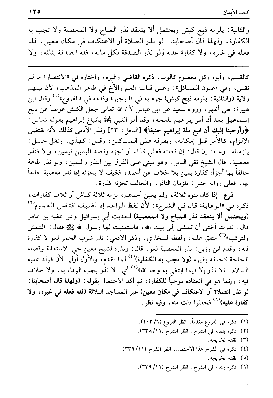 فَرْعٌ: إِذَا كَانَ بَنُوهُ ثَلَاثَةً، وَلَمْ يُعَيِّنْ أَحَدَهُمْ، لَزِمَهُ ثَلَاثَةُ كِبَاشٍ، أَوْ ثَلَاثُ كَفَّارَاتٍ، ذَكَرَهُ فِي الرِّعَايَةِ، قَالَ فِي الشَّرْحِ: لِأَنَّ لَفْظَ الْوَاحِدِ إِذَا أُضِيفَ اقْتَضَى الْعُمُومَ (وَيُحْتَمَلُ أَلَّا يَنْعَقِدَ نَذْرُ الْمُبَاحِ وَلَا الْمَعْصِيَةِ) لِحَدِيثِ أَبِي إِسْرَائِيلَ وَعَنْ عُقْبَةَ بْنِ عَامِرٍ، قَالَ: نَذَرَتْ «أُخْتِي أَنْ تَمْشِيَ إِلَى بَيْتِ اللَّهِ، فَاسْتَفْتَيْتُ لَهَا رَسُولَ اللَّهِ - صَلَّى اللَّهُ عَلَيْهِ وَسَلَّمَ -، فَقَالَ: لِتَمْشِ، وَلْتَرْكَبْ» . مُتَّفَقٌ عَلَيْهِ. وَلَفْظُهُ لِلْبُخَارِيِّ. وَذَكَرَ الْآدَمِيُّ: نَذْرُ شُرْبِ الْخَمْرِ لَغْوٌ لَا كَفَّارَةَ فِيهِ، وَقَدَّمَ ابْنُ رَزِينٍ: نَذْرُ الْمَعْصِيَةِ لَغْوٌ، قَالَ: وَنَذْرُهُ لِشَيْخٍ مُعَيَّنٍ حَيٍّ لِلِاسْتِعَانَةِ وَقَضَاءِ الْحَاجَةِ كَحَلِفِهِ بِغَيْرِهِ (وَلَا تَجِبُ بِهِ الْكَفَّارَةُ) لِمَا تَقَدَّمَ، وَالْأَوَّلُ أَوْلَى، لِأَنَّ قَوْلَهُ - عَلَيْهِ السَّلَامُ -: «لَا نَذْرَ إِلَّا فِيمَا ابْتُغِيَ بِهِ وَجْهُ اللَّهِ» . أَيْ: لَا نَذْرَ يَجِبُ الْوَفَاءُ بِهِ، وَلَا خِلَافَ فِيهِ، وَإِنَّمَا هُوَ فِي انْعِقَادِهِ مُوجِبًا لِلْكَفَّارَةِ، ثُمَّ أَكَّدَ الِاحْتِمَالَ بِقَوْلِهِ: (وَلِهَذَا قَالَ أَصْحَابُنَا: لَوْ نَذَرَ الصَّلَاةَ أَوْ الِاعْتِكَافَ فِي مَكَانٍ مُعَيَّنٍ) غَيْرِ الْمَسَاجِدِ الثَّلَاثَةِ (فَلَهُ فِعْلُهُ فِي غَيْرِهِ، وَلَا كَفَّارَةَ عَلَيْهِ) فَجَعَلُوا ذَلِكَ مِنْهُ، وَفِيهِ نَظَرٌ.