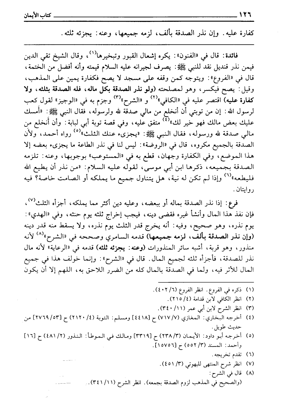 ـــــــــــــــــــــــــــــQفَائِدَةٌ: قَالَ فِي الْفُنُونِ: يُكْرَهُ إِشْعَالُ الْقُبُورِ وَتَبْخِيرُهَا، وَقَالَ الشَّيْخُ تَقِيُّ الدِّينِ فِيمَنْ نَذَرَ قِنْدِيلَ نَقْدٍ لِلنَّبِيِّ - صَلَّى اللَّهُ عَلَيْهِ وَسَلَّمَ -: يَصْرِفُ لِجِيرَانِهِ - عَلَيْهِ السَّلَامُ - قِيمَتَهُ، وَأَنَّهُ أَفْضَلُ مِنَ الْخَتْمَةِ، قَالَ فِي الْفُرُوعِ: وَيَتَوَجَّهُ كَمَنْ وَقَفَهُ عَلَى مَسْجِدٍ لَا يَصِحُّ فَكَفَّارَةُ يَمِينٍ عَلَى الْمَذْهَبِ، وَقِيلَ: يَصِحُّ فَيَكْسِرُ، وَهُوَ لِمَصْلَحَتِهِ، (وَلَوْ نَذَرَ الصَّدَقَةَ بِكُلِّ مَالِهِ، فَلَهُ الصَّدَقَةُ بِثُلُثِهِ، وَلَا كَفَّارَةَ عَلَيْهِ) اقْتَصَرَ عَلَيْهِ فِي الْكَافِي وَالشَّرْحِ، وَجَزَمَ بِهِ فِي الْوَجِيزِ، لِقَوْلِ كَعْبٍ لِرَسُولِ اللَّهِ - صَلَّى اللَّهُ عَلَيْهِ وَسَلَّمَ -: «إِنَّ مِنْ تَوْبَتِي أَنْ أَنْخَلِعَ مِنْ مَالِي صَدَقَةً لِلَّهِ وَلِرَسُولِهِ، فَقَالَ النَّبِيُّ - صَلَّى اللَّهُ عَلَيْهِ وَسَلَّمَ -: أَمْسِكْ عَلَيْكَ بَعْضَ مَالِكَ فَهُوَ خَيْرٌ لَكَ» . مُتَّفَقٌ عَلَيْهِ. وَفِي قِصَّةِ تَوْبَةِ أَبِي لُبَابَةَ: «وَأَنْ أَنْخَلِعَ مِنْ مَالِي صَدَقَةً لِلَّهِ وَرَسُولِهِ، فَقَالَ النَّبِيُّ - صَلَّى اللَّهُ عَلَيْهِ وَسَلَّمَ -: يُجْزِئُ عَنْكَ الثُّلُثُ» . رَوَاهُ أَحْمَدُ، وَلِأَنَّ الصَّدَقَةَ بِالْجَمِيعِ مَكْرُوهٌ، قَالَ فِي الرَّوْضَةِ: لَيْسَ لَنَا فِي نَذْرِ الطَّاعَةَ مَا يُجْزِئُ بَعْضُهُ إِلَّا هَذَا الْمَوْضِعُ، وَفِي الْكَفَّارَةِ وَجْهَانِ، قَطَعَ بِهِ فِي الْمُسْتَوْعِبِ بِوُجُوبِهَا، وَعَنْهُ: تَلْزَمُهُ الصَّدَقَةُ بِجَمِيعِهِ، ذَكَرَهَا ابْنُ أَبِي مُوسَى، لِقَوْلِهِ - عَلَيْهِ السَّلَامُ -: «مَنْ نَذَرَ أَنْ يُطِيعَ اللَّهَ فَلْيُطِعْهُ» . وَإِذَا لَمْ تَكُنْ لَهُ نِيَّةٌ، هَلْ يَتَنَاوَلُ جَمِيعَ مَا يَمْلِكُهُ أَوِ الصَّامِتَ خَاصَّةً؟ فِيهِ رِوَايَتَانِ.