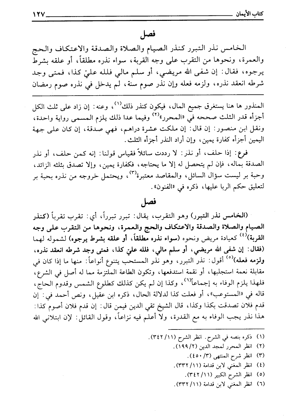 (الْخَامِسُ: 1 نَذْرُ التَّبَرُّرِ) وَهُوَ التَّقَرُّبُ، يُقَالُ: تَبَرَّرَ تَبَرُّرًا، أَيْ: تَقَرَّبَ تَقَرُّبًا (كَنَذْرِ الصِّيَامِ، وَالصَّلَاةِ، وَالصَّدَقَةِ، وَالِاعْتِكَافِ، وَالْحَجِّ، وَالْعُمْرَةِ، وَنَحْوِهَا مِنَ التَّقَرُّبِ عَلَى وَجْهِ الْقُرْبَةِ) كَعِيَادَةِ مَرِيضٍ وَنَحْوِهِ (سَوَاءٌ نَذَرَهُ مُطْلَقًا، أَوْ عَلَّقَهُ بِشَرْطٍ يَرْجُوهُ) لِشُمُولِهِ لَهُمَا (فَقَالَ: إِنْ شَفَى اللَّهُ مَرِيضِي، أَوْ سَلَّمَ مَالِي، فَلِلَّهِ عَلَيَّ كَذَا، فَمَتَى وُجِدَ شَرْطُهُ انْعَقَدَ نَذْرُهُ، وَلَزِمَهُ فِعْلُهُ) أَقُولُ: نَذْرُ التَّبَرُّرِ، وَهُوَ نَذْرُ الْمُسْتَحَبِّ، يَتَنَوَّعُ أَنْوَاعًا، مِنْهَا: مَا إِذَا كَانَ فِي مُقَابَلَةِ نِعْمَةٍ اسْتَجْلَبَهَا، أَوْ نِقْمَةٍ اسْتَدْفَعَهَا، وَتَكُونُ الطَّاعَةُ الْمُلْتَزِمَةُ مِمَّا لَهُ أَصْلٌ فِي الشَّرْعِ، فَلِهَذَا يَلْزَمُ الْوَفَاءُ بِهِ إِجْمَاعًا، وَكَذَا إِنْ لَمْ يَكُنْ كَذَلِكَ كَطُلُوعِ الشَّمْسِ، وَقُدُومِ الْحَاجِّ، قَالَهُ فِي الْمُسْتَوْعِبِ، أَوْ فَعَلْتُ كَذَا لِدَلَالَةِ الْحَالِ، ذَكَرَهُ ابْنُ عَقِيلٍ، وَنَصَّ أَحْمَدُ فِي: إِنْ قَدِمَ فُلَانٌ تَصَدَّقْتُ بِكَذَا وَكَذَا، قَالَ الشَّيْخُ تَقِيُّ الدِّينِ فِيمَنْ قَالَ: إِنْ قَدِمَ فُلَانٌ أَصُومُ كَذَا: هَذَا نَذْرٌ يَجِبُ الْوَفَاءُ بِهِ مَعَ الْقُدْرَةِ، وَلَا أَعْلَمُ فِيهِ نِزَاعًا، وَقَوْلُ الْقَائِلِ: لَإِنِ ابْتَلَانِي اللَّهُ