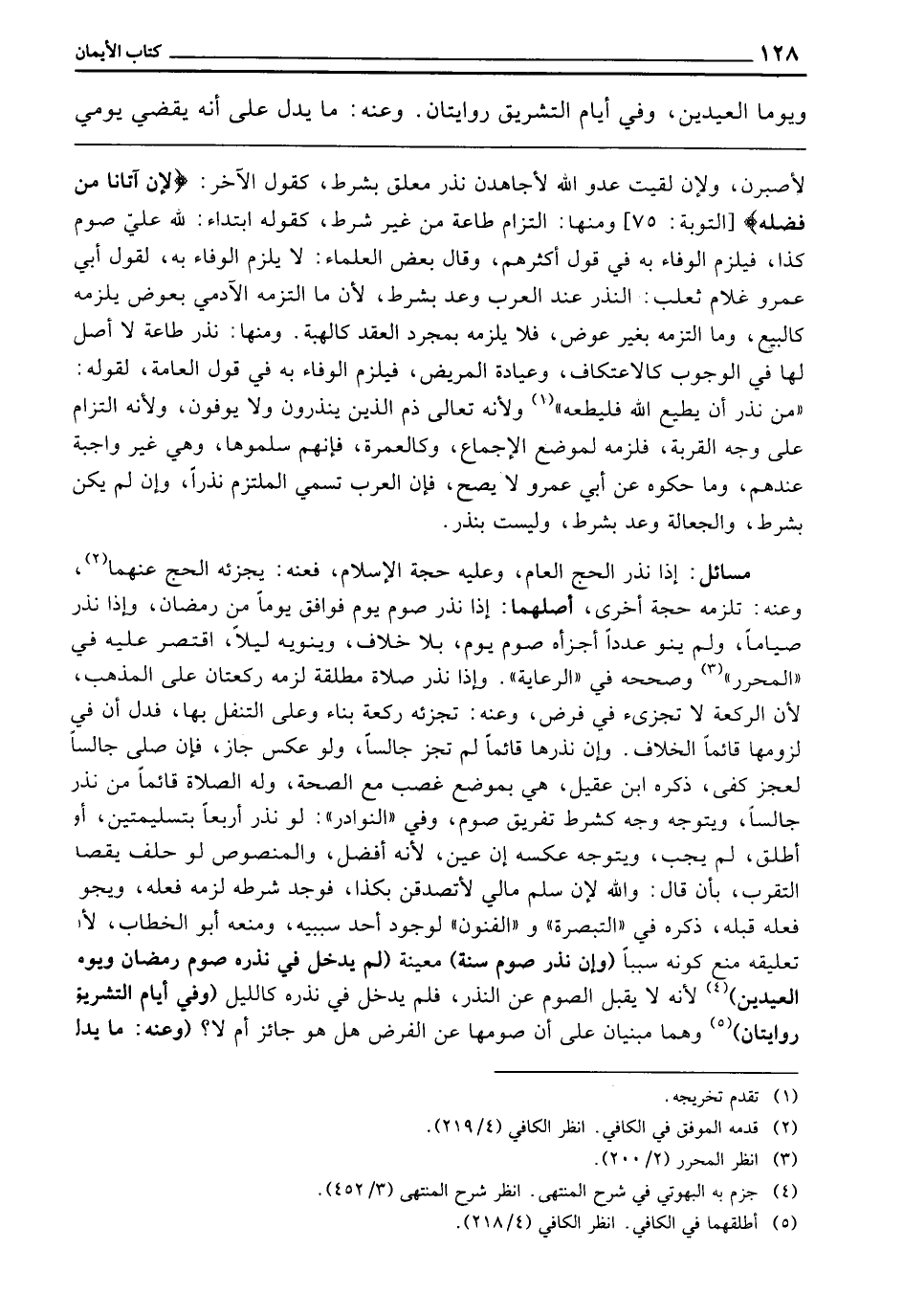 (وَإِنْ نَذَرَ صَوْمَ سَنَةٍ) مُعَيَّنَةٍ (لَمْ يَدْخُلْ فِي نَذْرِهِ صَوْمُ رَمَضَانَ وَيَوْمَا الْعِيدَيْنِ) لِأَنَّهُ لَا يُقْبَلُ الصَّوْمُ عَنِ النَّذْرِ، فَلَمْ يَدْخُلْ فِي نَذْرِهِ كَاللَّيْلِ (وَفِي أَيَّامِ التَّشْرِيقِ رِوَايَتَانِ) وَهُمَا مَبْنِيَّانِ عَلَى أَنَّ صَوْمَهَا عَنِ الْفَرْضِ هَلْ هُوَ جَائِزٌ، أَمْ لَا؟ (وَعَنْهُ: مَا يَدُلُّ