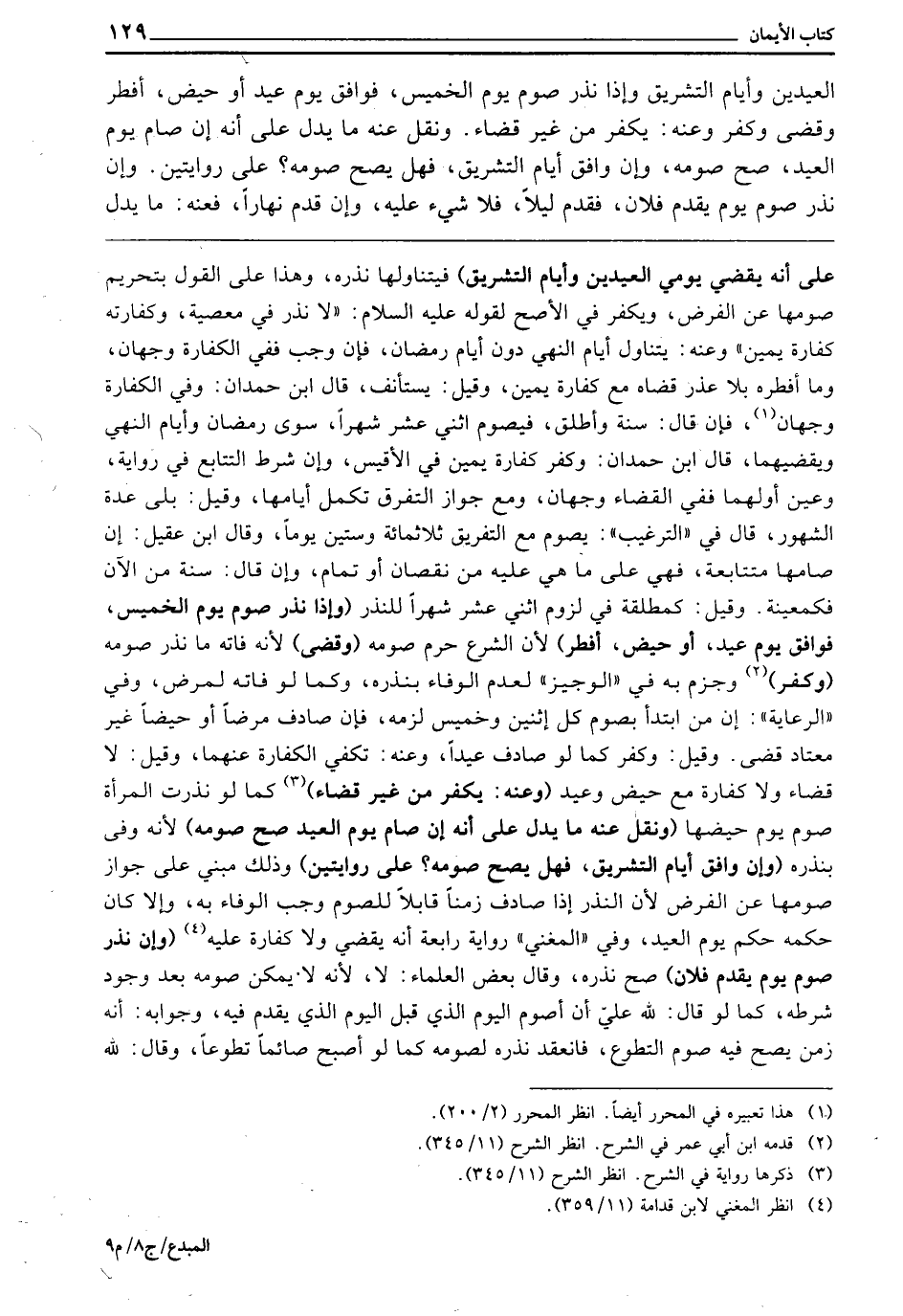الْعِيدَيْنِ وَأَيَّامَ التَّشْرِيقِ، وَإِذَا نَذَرَ صَوْمَ يَوْمِ الْخَمِيسِ، فَوَافَقَ يَوْمَ عِيدٍ أَوْ حَيْضٍ، أَفْطَرَ وَقَضَى وَكَفَّرَ، وَعَنْهُ: يُكَفِّرُ مِنْ غَيْرِ قَضَاءٍ، وَنُقِلَ عَنْهُ مَا يَدُلُّ عَلَى أَنَّهُ إِنْ صَامَ يَوْمَ الْعِيدِ صَحَّ صَوْمُهُ، وَإِنْ وَافَقَ أَيَّامَ التَّشْرِيقِ، فَهَلْ يَصِحُّ صَوْمُهُ؟ عَلَى رِوَايَتَيْنِ. وَإِنْ نَذَرَ صَوْمَ يَوْمِ يَقْدَمُ فُلَانٌ فَقَدِمَ لَيْلًا، فَلَا شَيْءَ عَلَيْهِ، وَإِنْ قَدِمَ نَهَارًا، فَعَنْهُ: مَا يَدُلُّ