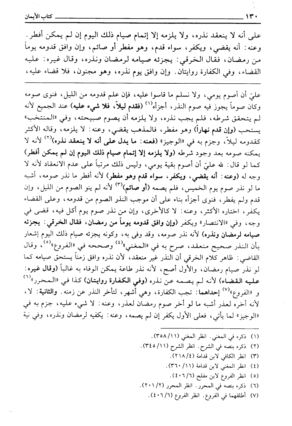 ـــــــــــــــــــــــــــــQعَلَيَّ أَنْ أَصُومَ يَوْمِي، وَلَا نُسَلِّمُ مَا قَاسُوا عَلَيْهِ، فَإِنْ عَلِمَ قُدُومَهُ مِنَ اللَّيْلِ فَنَوَى صَوْمَهُ، وَكَانَ صَوْمًا يَجُوزُ فِيهِ صَوْمُ النَّذْرِ أَجْزَأَهُ (فَقَدِمَ لَيْلًا، فَلَا شَيْءَ عَلَيْهِ) عِنْدَ الْجَمِيعِ، لِأَنَّهُ لَمْ يَتَحَقَّقْ شَرْطُهُ، فَلَمْ يَجِبْ نَذْرُهُ، وَلَا يَلْزَمْهُ أَنْ يَصُومَ صَبِيحَتَهُ، وَفِي الْمُنْتَخَبِ: يُسْتَحَبُّ (وَإِنْ قَدِمَ نَهَارًا) وَهُوَ مُفْطِرٌ، فَالْمَذْهَبُ يَقْضِي، وَعَنْهُ: لَا يَلْزَمُهُ، وَقَالَهُ الْأَكْثَرُ كَقُدُومِهِ لَيْلًا، وَجَزَمَ بِهِ فِي الْوَجِيزِ (فَعَنْهُ: مَا يَدُلُّ عَلَى أَنَّهُ لَا يَنْعَقِدُ نَذْرُهُ) لِأَنَّهُ لَا يُمْكِنُهُ صَوْمُهُ بَعْدَ وُجُودِ شَرْطِهِ (وَلَا يَلْزَمُهُ إِلَّا إِتْمَامُ صِيَامِ ذَلِكَ الْيَوْمِ إِنْ لَمْ يَكُنْ أَفْطَرَ) كَمَا لَوْ قَالَ: لِلَّهِ عَلَيَّ أَنْ أَصُومَ بَقِيَّةَ يَوْمِي، وَلَيْسَ ذَلِكَ مُرَتَّبًا عَلَى عَدَمِ الِانْعِقَادِ، لِأَنَّهُ لَا وَجْهَ لَهُ (وَعَنْهُ: أَنَّهُ يَقْضِي وَيُكَفِّرُ، سَوَاءٌ قَدِمَ وَهُوَ مُفْطِرٌ) لِأَنَّهُ أَفَطَرَ مَا نَذَرَ صَوْمَهُ، أَشْبَهَ مَا لَوْ نَذَرَ صَوْمَ يَوْمِ الْخَمِيسِ فَلَمْ يَصُمْهُ، (أَوْ صَائِمٌ) لِأَنَّهُ لَمْ يَنْوِ الصَّوْمَ مِنَ اللَّيْلِ، وَإِنْ قَدِمَ وَلَمْ يُفْطِرْ، فَنَوَى، أَجْزَأَهُ، بِنَاءً عَلَى أَنَّ مُوجَبَ النَّذْرِ الصَّوْمُ مِنْ قُدُومِهِ، وَعَلَى الْقَضَاءِ يُكَفِّرُ، اخْتَارَهُ الْأَكْثَرُ، وَعَنْهُ: لَا، كَالْأُخْرَى، وَإِنَّ مَنْ نَذَرَ صَوْمَ يَوْمٍ أَكَلَ فِيهِ قَضَى فِي وَجْهٍ، وَفِي الِانْتِصَارِ: وَيُكَفِّرُ (وَإِنْ وَافَقَ قُدُومُهُ يَوْمًا مِنْ رَمَضَانَ، فَقَالَ الْخِرَقِيُّ: يُجْزِئُهُ صِيَامُهُ لِرَمَضَانَ وَنَذْرِهِ) لِأَنَّهُ نَذَرَ صَوْمَهُ، وَقَدْ وَفَى بِهِ، وَكَوْنُهُ يُجْزِئُهُ صِيَامُ ذَلِكَ الْيَوْمِ إِشْعَارٌ بِأَنَّ النَّذْرَ صَحِيحٌ مُنْعَقِدٌ، صَرَّحَ بِهِ فِي الْمُغْنِي، وَصَحَّحَهُ فِي الْفُرُوعِ، وَقَالَ الْقَاضِي: ظَاهِرُ كَلَامِ الْخِرَقِيِّ: أَنَّ النَّذْرَ غَيْرُ مُنْعَقِدٍ، لِأَنَّ نَذْرَهُ وَافَقَ زَمَنًا يَسْتَحِقُّ صِيَامُهُ، كَمَا لَوْ نَذَرَ صِيَامَ رَمَضَانَ، وَالْأَوَّلُ أَصَحُّ، لِأَنَّهُ نَذْرُ طَاعَةٍ يُمْكِنُ الْوَفَاءُ بِهِ غَالِبًا (وَقَالَ غَيْرُهُ: عَلَيْهِ الْقَضَاءُ) لِأَنَّهُ لَمْ يَصُمْهُ عَنْ نَذْرِهِ (وَفِي الْكَفَّارَةِ رِوَايَتَانِ) كَذَا فِي الْمُحَرَّرِ وَالْفُرُوعِ.