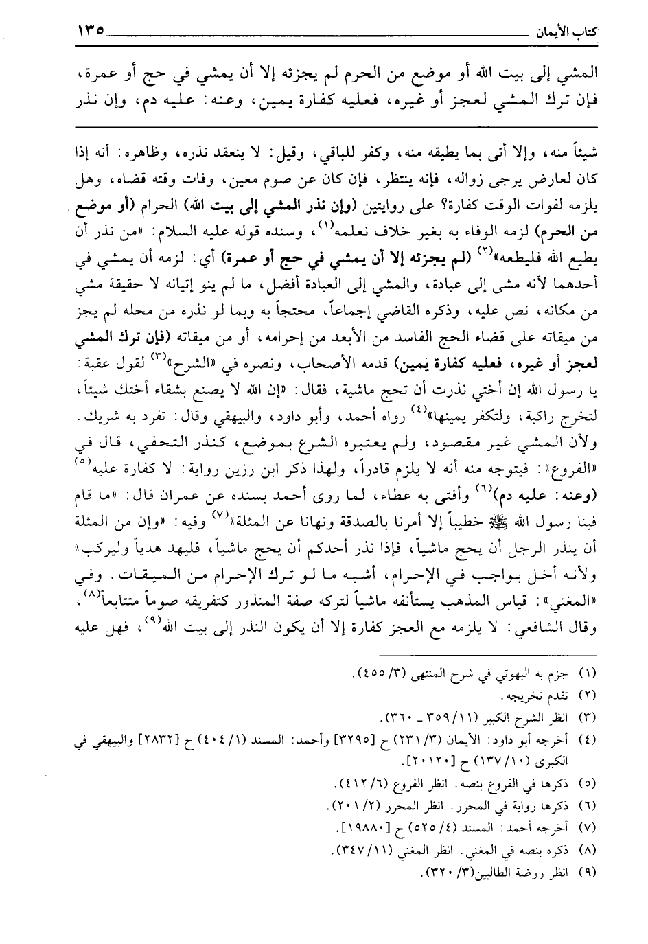 (وَإِنْ نَذَرَ الْمَشْيَ إِلَى بَيْتِ اللَّهِ) الْحَرَامِ (أَوْ مَوْضِعٍ مِنَ الْحَرَمِ) لَزِمَهُ الْوَفَاءُ بِهِ بِغَيْرِ خِلَافٍ نَعْلَمُهُ، وَسَنَدُهُ قَوْلُهُ - عَلَيْهِ السَّلَامُ -: «مَنْ نَذَرَ أَنْ يُطِيعَ اللَّهَ فَلْيُطِعْهُ» . (لَمْ يُجْزِئْهُ إِلَّا أَنْ يَمْشِيَ فِي حَجٍّ أَوْ عُمْرَةٍ) أَيْ: لَزِمَهُ أَنْ يَمْشِيَ فِي أَحَدِهِمَا، لِأَنَّهُ مَشى إِلَى عِبَادَةِ، وَالْمَشْيُ إِلَى الْعِبَادَةِ أَفْضَلُ، مَا لَمْ يَنْوِ إِتْيَانَهُ لَا حَقِيقَةَ مَشْيٍ مِنْ مَكَانِهِ، نَصَّ عَلَيْهِ، وَذَكَرَهُ الْقَاضِي إِجْمَاعًا، مُحْتَجًّا بِهِ وَبِمَا لَوْ نَذَرَهُ مِنْ مَحَلِّهِ لَمْ يَجُزْ مِنْ مِيقَاتِهِ عَلَى قَضَاءِ الْحَجِّ الْفَاسِدِ مِنَ الْأَبْعَدِ مِنْ إِحْرَامِهِ، أَوْ مِنْ مِيقَاتِهِ (فَإِنْ تَرَكَ الْمَشْيَ لِعَجْزٍ أَوْ غَيْرِهِ، فَعَلَيْهِ كَفَّارَةُ يَمِينٍ) قَدَّمَهُ الْأَصْحَابُ، وَنَصَرَهُ فِي الشَّرْحِ، «لِقَوْلِ عُقْبَةَ: يَا رَسُولَ اللَّهِ، إِنْ أُخْتِي نَذَرَتْ أَنْ تَحُجَّ مَاشِيَةً، فَقَالَ: إِنَّ اللَّهَ لَا يَصْنَعُ بِشَقَاءِ أُخْتِكَ شَيْئًا، لِتَخْرُجْ رَاكِبَةً، وَلْتَكْفُرْ يَمِينَهَا» . رَوَاهُ أَحْمَدُ، وَأَبُو دَاوُدَ، وَالْبَيْهَقِيُّ، وَقَالَ: تَفَرَّدَ بِهِ شَرِيكٌ، وَلِأَنَّ الْمَشْيَ غَيْرُ مَقْصُودٍ، وَلَمْ يَعْتَبِرْهُ الشَّرْعُ بِمَوْضِعٍ، كَنَذْرِ التَّحَفِّي، قَالَ فِي الْفُرُوعِ: فَيَتَوَجَّهُ مِنْهُ أَنَّهُ لَا يَلْزَمُ قَادِرًا، وَلِهَذَا ذَكَرَ ابْنُ رَزِينٍ رِوَايَةً: لَا كَفَّارَةَ عَلَيْهِ، (وَعَنْهُ: عَلَيْهِ دَمٌ) وَأَفْتَى بِهِ عَطَاءٌ لِمَا رَوَى أَحْمَدُ بِسَنَدِهِ عَنْ عِمْرَانَ، قَالَ: مَا «قَامَ فِينَا رَسُولُ اللَّهِ - صَلَّى اللَّهُ عَلَيْهِ وَسَلَّمَ - خَطِيبًا، إِلَّا أَمَرَنَا بِالصَّدَقَةِ، وَنَهَانَا عَنِ الْمُثْلَةِ، وَفِيهِ: وَإِنَّ مِنَ الْمُثْلَةِ أَنْ يَنْذُرَ الرَّجُلُ أَنْ يَحُجَّ مَاشِيًا، فَإِذَا نَذَرَ أَحَدُكُمْ أَنْ يَحُجَّ مَاشِيًا فَلْيُهْدِ هَدْيًا، وَلِيَرْكَبْ» ، وَلِأَنَّهُ أَخَلَّ بِوَاجِبٍ فِي الْإِحْرَامِ، أَشْبَهَ مَا لَوْ تَرَكَ الْإِحْرَامَ مِنَ الْمِيقَاتِ، وَفِي الْمُغْنِي: قِيَاسُ الْمَذْهَبِ يَسْتَأْنِفُهُ مَاشِيًا، لِتَرْكِهِ صِفَةَ الْمَنْذُورِ، كَتَفْرِيقِهِ صَوْمًا مُتَتَابِعًا، وَقَالَ الشَّافِعِيُّ: لَا يَلْزَمُهُ مَعَ الْعَجْزِ كَفَّارَةٌ، إِلَّا أَنْ يَكُونَ النَّذْرُ إِلَى بَيْتِ اللَّهِ، فَهَلْ عَلَيْهِ