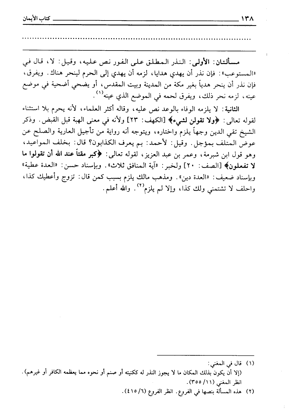 ـــــــــــــــــــــــــــــQمَسْأَلَتَانِ: الْأُولَى: النَّذْرُ الْمُطْلَقُ عَلَى الْفَوْرِ، نَصَّ عَلَيْهِ، وَقِيلَ: لَا، قَالَ فِي الْمُسْتَوْعِبِ: فَإِنْ نَذَرَ أَنْ يَهْدِيَ هَدَايَا، لَزِمَهُ أَنْ يَهْدِيَ إِلَى الْحَرَمِ لِيَنْحَرَ هُنَاكَ وَيُفَرِّقَ، فَإِنْ نَذَرَ أَنْ يَنْحَرَ هَدْيًا بِغَيْرِ مَكَّةَ مِنَ الْمَدِينَةِ وَبَيْتِ الْمَقْدِسِ، أَوْ يُضَحِّيَ أُضْحِيَّةً فِي مَوْضِعٍ عَيَّنَهُ، لَزِمَهُ نَحْرُ ذَلِكَ، وَيُفَرِّقُ لَحْمَهُ فِي الْمَوْضِعِ الَّذِي عَيَّنَهُ.
