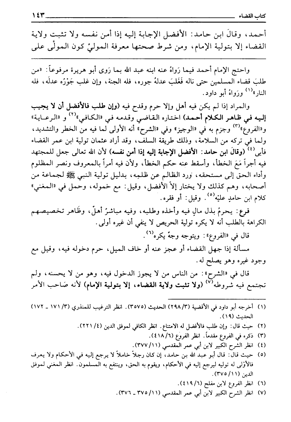 ـــــــــــــــــــــــــــــQ، وَاحْتَجَّ الْإِمَامُ أَحْمَدُ فِيمَا رَوَاهُ عَنْهُ ابْنُهُ عَبْدُ اللَّهِ بِمَا رَوَى أَبُو هُرَيْرَةَ مَرْفُوعًا: «مَنْ طَلَبَ قَضَاءَ الْمُسْلِمِينَ حَتَّى نَالَهُ فَغَلَبَ عَدْلُهُ جَوْرَهُ فَلَهُ الْجَنَّةُ، وَإِنْ غَلَبَ جَوْرُهُ عَدْلَهُ فَلَهُ النَّارُ» وَرَوَاهُ أَبُو دَاوُدَ. وَالْمُرَادُ إِذَا لَمْ يَكُنْ فِيهِ أَهْلٌ، وَإِلَّا حُرِمَ وَقُدِحَ فِيهِ (وَإِنْ طُلِبَ فَالْأَفْضَلُ أَنْ لَا يُجِيبَ إِلَيْهِ فِي ظَاهِرِ الْكَلَامِ أَحْمَدُ) اخْتَارَهُ الْقَاضِي، وَقَدَّمَهُ فِي الْكَافِي وَالرِّعَايَةِ وَالْفُرُوعِ، وَجَزَمَ بِهِ فِي الْوَجِيزِ، وَفِي الشَّرْحِ: أَنَّهُ الْأَوْلَى لِمَا فِيهِ مِنَ الْخَطَرِ وَالتَّشْدِيدِ، وَلِمَا فِي تَرْكِهِ مِنَ السَّلَامَةِ، وَذَلِكَ طَرِيقَةُ السَّلَفِ، وَقَدْ أَرَادَ عُثْمَانُ تَوْلِيَةَ ابْنِ عُمَرَ الْقَضَاءَ فَأَبَى. (وَقَالَ ابْنُ حَامِدٍ: الْأَفْضَلُ الْإِجَابَةُ إِلَيْهِ إِذَا أَمِنَ نَفْسَهُ) لِأَنَّ اللَّهَ - تَعَالَى - جَعَلَ لِلْمُجْتَهِدِ فِيهِ أَجْرًا مَعَ الْخَطَأِ، وَأَسْقَطَ عَنْهُ حُكْمَ الْخَطَأِ، وَلِأَنَّ فِيهِ أَمْرًا بِالْمَعْرُوفِ وَنَصْرَ الْمَظْلُومِ وَأَدَاءَ الْحَقِّ إِلَى مُسْتَحَقِّهِ، وَرَدَّ الظَّالِمِ عَنْ ظُلْمِهِ، بِدَلِيلِ تَوْلِيَةِ النَّبِيِّ - صَلَّى اللَّهُ عَلَيْهِ وَسَلَّمَ - لِجَمَاعَةٍ مِنْ أَصْحَابِهِ وَهُمْ كَذَلِكَ. وَلَا يَخْتَارُ إِلَّا الْأَفْضَلَ، وَقِيلَ: مَعَ خُمُولِهِ، وَحَمَلَ فِي الْمُغْنِي كَلَامَ ابْنِ حَامِدٍ عَلَيْهِ. وَقِيلَ: أَوْ فَقْرِهِ. فَرْعٌ: يَحْرُمُ بَذْلُ مَالٍ فِيهِ وَأَخْذُهُ وَطَلَبُهُ، وَفِيهِ مُبَاشِرٌ أَهْلٌ، وَظَاهِرُ تَخْصِيصِهِمُ الْكَرَاهَةَ بِالطَّلَبِ أَنَّهُ لَا يُكْرَهُ تَوْلِيَةُ الْحَرِيصِ لَا يَنْفِي أَنَّ غَيْرَهُ أَوْلَى. قَالَ فِي الْفُرُوعِ: وَيَتَوَجَّهُ وَجْهٌ، يُكْرَهُ. مَسْأَلَةٌ إِذَا جَهِلَ الْقَضَاءَ أَوْ عَجَزَ عَنْهُ أَوْ خَافَ الْمَيْلَ حُرِمَ دُخُولُهُ فِيهِ، وَقِيلَ: مَعَ وُجُودِ غَيْرِهِ وَهُوَ يَصْلُحُ لَهُ. قَالَ فِي الشَّرْحِ: مِنَ النَّاسِ مَنْ لَا يُجَوِّزُ الدُّخُولَ فِيهِ، وَهُوَ مَنْ لَا يُحْسِنُهُ وَلَمْ تَجْتَمِعْ فِيهِ شُرُوطُهُ.