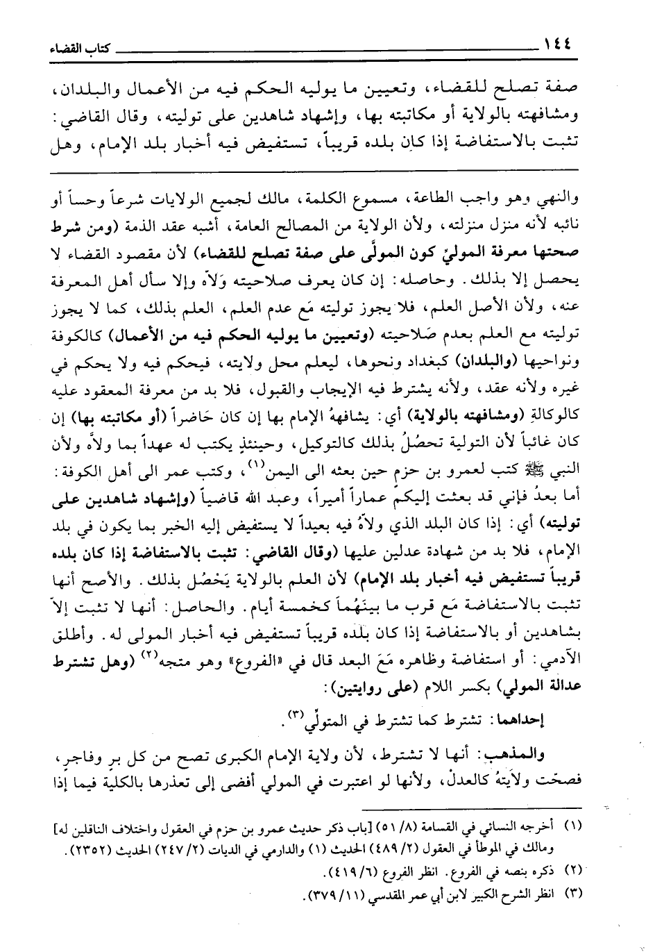 (وَمِنْ شَرْطِ صِحَّتِهَا مَعْرِفَةُ الْمُوَلِّي كَوْنَ الْمُوَلَّى عَلَى صِفَةٍ تَصْلُحُ لِلْقَضَاءِ) لِأَنَّ مَقْصُودَ الْقَضَاءِ لَا يَحْصُلُ إِلَّا بِذَلِكَ. وَحَاصِلُهُ: إِنْ كَانَ يَعْرِفُ صَلَاحِيَتَهُ وَلَّاهُ، وَإِلَّا سَأَلَ أَهْلَ الْمَعْرِفَةِ عَنْهُ، وَلِأَنَّ الْأَصْلَ الْعِلْمُ، فَلَا يَجُوزُ تَوْلِيَتُهُ مَعَ عَدَمِ الْعِلْمِ، الْعِلْمُ بِذَلِكَ، كَمَا لَا يَجُوزُ تَوْلِيَتُهُ مَعَ الْعِلْمِ بِعَدَمِ صَلَاحِيَتِهِ. (وَتعَيين مَا يُوَلِّيهِ الْحُكْمَ فِيهِ مِنَ الْأَعْمَالِ) كَالْكُوفَةِ وَنَوَاحِيهَا. (وَالْبُلْدَانِ) كَبَغْدَادَ وَنَحْوِهَا، لِيَعْلَمَ مَحَلَّ وِلَايَتِهِ فَيَحْكُمَ فِيهِ وَلَا يَحْكُمَ فِي غَيْرِهِ، وَلِأَنَّهُ عَقْدٌ وَلِأَنَّهُ يُشْتَرَطُ فِيهِ الْإِيجَابُ وَالْقَبُولُ، فَلَا بُدَّ مِنْ مَعْرِفَةِ الْمَعْقُودِ عَلَيْهِ كَالْوِكَالَةِ. (وَمُشَافَهَتُهُ بِالْوِلَايَةِ) ، أَيْ: يُشَافِهُهُ الْإِمَامُ بِهَا إِنْ كَانَ حَاضِرًا. (أَوْ مُكَاتَبَتُهُ بِهَا) إِنْ كَانَ غَائِبًا؛ لِأَنَّ التَّوْلِيَةَ تَحْصُلُ بِذَلِكَ، كَالتَّوْكِيلِ، وَحِينَئِذٍ يَكْتُبُ لَهُ عَهْدًا بِمَا وَلَّاهُ؛ وَلِأَنَّ «النَّبِيَّ - صَلَّى اللَّهُ عَلَيْهِ وَسَلَّمَ - كَتَبَ لِعَمْرِو بْنِ حَزْمٍ حِينَ بَعَثَهُ إِلَى الْيَمَنِ،» وَكَتَبَ عُمَرُ إِلَى أَهْلِ الْكُوفَةِ: أَمَّا بَعْدُ، فَإِنِّي قَدْ بَعَثْتُ إِلَيْكُمْ عَمَّارًا أَمِيرًا، وَعَبْدَ اللَّهِ قَاضِيًا. (وَإِشْهَادُ شَاهِدَيْنِ عَلَى تَوْلِيَتِهِ) أَيْ: إِذَا كَانَ الْبَلَدُ الَّذِي وَلَّاهُ فِيهِ بَعِيدًا لَا يَسْتَفِيضُ إِلَيْهِ الْخَبَرُ بِمَا يَكُونُ فِي بَلَدِ الْإِمَامِ فَلَا بُدَّ مِنْ شَهَادَةِ عَدْلَيْنِ عَلَيْهَا. (وَقَالَ الْقَاضِي: تَثْبُتُ بِالِاسْتِفَاضَةِ إِذَا كَانَ بَلَدُهُ قَرِيبًا تَسْتَفِيضُ فِيهِ أَخْبَارُ بَلَدِ الْإِمَامِ) لِأَنَّ الْعِلْمَ بِالْوِلَايَةِ يَحْصُلُ بِذَلِكَ. وَالْأَصَحُّ أَنَّهَا تَثْبُتُ بِالِاسْتِفَاضَةِ مَعَ قُرْبِ مَا بَيْنَهُمَا، كَخَمْسَةِ أَيَّامٍ. وَالْحَاصِلُ أَنَّهَا لَا تَثْبُتُ إِلَّا بِشَاهِدَيْنِ أَوْ بِالِاسْتِفَاضَةِ إِذَا كَانَ بَلَدُهُ قَرِيبًا تَسْتَفِيضُ فِيهِ أَخْبَارُ الْمُوَلَّى لَهُ. وَأَطْلَقَ الْآدَمِيُّ: أَوِ اسْتِفَاضَةٌ، وَظَاهِرُهُ مَعَ الْبُعْدِ، قَالَ فِي الْفُرُوعِ وَهُوَ مُتَّجِهٌ (وَهَلْ تُشْتَرَطُ عَدَالَةُ الْمُوَلِّي؟) بِكَسْرِ اللَّامِ (عَلَى رِوَايَتَيْنِ) : إِحْدَاهُمَا: تُشْتَرَطُ كَمَا تُشْتَرَطُ فِي الْمُتَوَلِّي.