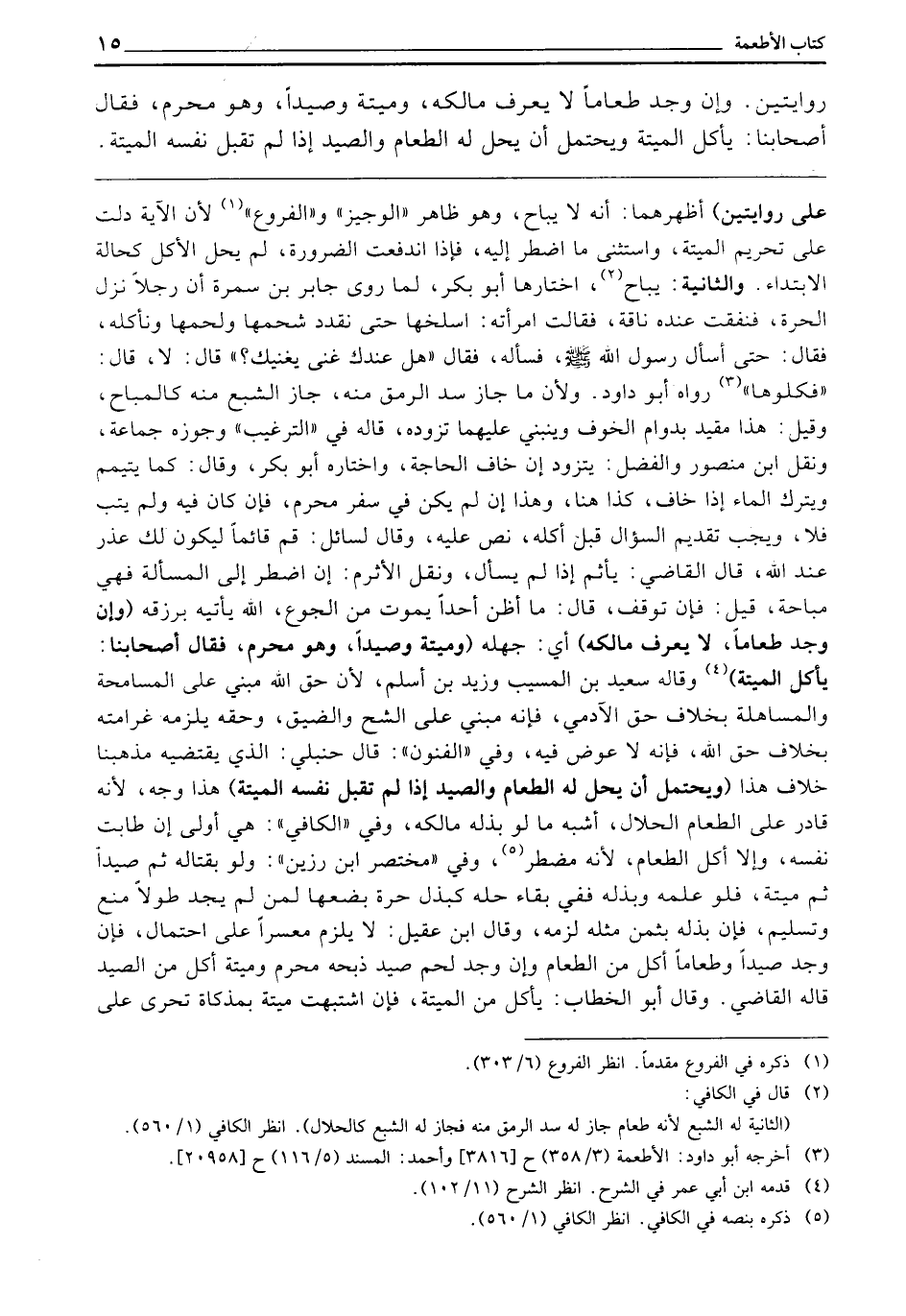 وَالثَّانِيَةُ: يُبَاحُ، اخْتَارَهَا أَبُو بَكْرٍ، لِمَا رَوَى جَابِرُ بْنُ سَمُرَةَ: «أَنَّ رَجُلًا نَزَلَ الْحَرَّةَ فَنَفَقَتْ عِنْدَهُ نَاقَةٌ، فَقَالَتِ امْرَأَتُهُ: اسْلُخْهَا حَتَّى نُقَدِّدَ شَحْمَهَا وَلَحْمَهَا وَنَأْكُلَهُ، فَقَالَ: حَتَّى أَسْأَلَ رَسُولَ اللَّهِ - صَلَّى اللَّهُ عَلَيْهِ وَسَلَّمَ - فَسَأَلَهُ، فَقَالَ: هَلْ عِنْدَكَ غِنًى يُغْنِيكَ؟ قَالَ: لَا، قَالَ: فَكُلُوهَا» . رَوَاهُ أَبُو دَاوُدَ. وَلِأَنَّ مَا جَازَ سَدُّ الرَّمَقِ مِنْهُ جَازَ الشِّبَعُ مِنْهُ كَالْمُبَاحِ، وَقِيلَ: هَذَا مُقَيَّدٌ بِدَوَامِ الْخَوْفِ، وَيَنْبَنِي عَلَيْهِمَا تَزَوُّدُهُ، قَالَهُ فِي التَّرْغِيبِ، وَجَوَّزَهُ جَمَاعَةٌ، وَنَقَلَ ابْنُ مَنْصُورٍ، وَالْفَضْلُ: يَتَزَوَّدُ إِنْ خَافَ الْحَاجَةَ، وَاخْتَارَهُ أَبُو بَكْرٍ، قَالَ: كَمَا يَتَيَمَّمُ، وَيَتْرُكُ الْمَاءَ إِذَا خَافَ، كَذَا هُنَا، وَهَذَا إِنْ لَمْ يَكُنْ فِي سَفَرٍ مُحَرَّمٍ، فَإِنْ كَانَ فِيهِ، وَلَمْ يَتُبْ فَلَا، وَيَجِبُ تَقْدِيمُ السُّؤَالِ قَبْلَ أَكْلِهِ، نَصَّ عَلَيْهِ، وَقَالَ لِسَائِلٍ: قُمْ قَائِمًا لِيَكُونَ لَكَ عُذْرٌ عِنْدَ اللَّهِ. قَالَ الْقَاضِي: يَأْثَمُ إِذَا لَمْ يَسْأَلْ، وَنَقَلَ الْأَثْرَمُ: إِنِ اضْطُرَّ إِلَى الْمَسْأَلَةِ فَهِيَ مُبَاحَةٌ، قِيلَ: فَإِنْ تَوَقَّفَ، قَالَ: مَا أَظُنُّ أَحَدًا يَمُوتُ مِنَ الْجُوعِ، اللَّهُ يَأْتِيهِ بِرِزْقِهِ، (وَإِنْ وَجَدَ طَعَامًا لَا يَعْرِفُ مَالِكَهُ) أَيْ: جَهِلَهُ (وَمَيْتَةً وَصَيْدًا، وَهُوَ مُحَرَّمٌ، فَقَالَ أَصْحَابُنَا: يَأْكُلُ الْمَيْتَةَ) ، وَقَالَهُ سَعِيدُ بْنُ الْمُسَيَّبِ، وَزَيْدُ بْنُ أَسْلَمَ، لِأَنَّ حَقَّ اللَّهِ مَبْنِيٌّ عَلَى الْمُسَامَحَةِ وَالْمُسَاهَلَةِ، بِخِلَافِ حَقِّ الْآدَمِيِّ، فَإِنَّهُ مَبْنِيٌّ عَلَى الشُّحِّ، وَالضِّيقِ، وَحَقُّهُ يُلْزِمُهُ غَرَامَتَهُ، بِخِلَافِ حَقِّ اللَّهِ، فَإِنَّهُ لَا عِوَضَ فِيهِ، وَفِي الْفُنُونِ قَالَ حَنْبَلِيٌّ: الَّذِي يَقْتَضِيهِ مَذْهَبُنَا خِلَافَ هَذَا، (وَيُحْتَمَلُ أَنْ يَحِلَّ لَهُ الطَّعَامُ، وَالصَّيْدُ، إِذَا لَمْ تَقْبَلْ نَفْسُهُ الْمَيْتَةَ) هَذَا وَجْهٌ، لِأَنَّهُ قَادِرٌ عَلَى الطَّعَامِ الْحَلَالِ، أَشْبَهَ مَا لَوْ بَذَلَهُ مَالِكُهُ، وَفِي الْكَافِي: هِيَ أَوْلَى إِنْ طَابَتْ نَفْسُهُ، وَإِلَّا أَكَلَ الطَّعَامَ، لِأَنَّهُ مُضْطَرٌّ، وَفِي مُخْتَصَرِ ابْنِ رَزِينٍ، وَلَوْ بِقِتَالِهِ، ثُمَّ صَيْدًا، ثُمَّ مَيْتَةً، فَلَوْ عَلِمَهُ، وَبَذَلَهُ فَفِي بَقَاءِ حِلِّهِ - كَبَذْلِ حُرَّةٍ بُضْعَهَا لِمَنْ لَمْ يَجِدْ طَوْلًا - مَنْعٌ وَتَسْلِيمٌ، فَإِنْ بَذَلَهُ بِثَمَنِ مِثْلِهِ لَزِمَهُ، وَقَالَ ابْنُ عَقِيلٍ: لَا يَلْزَمُ مُعْسِرًا عَلَى احْتِمَالٍ، فَإِنْ وَجَدَ صَيْدًا وَطَعَامًا أَكَلَ مِنَ الطَّعَامِ، وَإِنْ وَجَدَ لَحْمَ صَيْدٍ ذَبَحَهُ مُحْرِمٌ، وَمَيْتَةً أَكَلَ مِنَ الصَّيْدِ، قَالَهُ الْقَاضِي، وَقَالَ أَبُو الْخَطَّابِ: يَأْكُلُ مِنَ الْمَيْتَةِ، فَإِنِ اشْتَبَهَتْ مَيْتَةٌ بِمُذَكَّاةٍ تَحَرَّى عَلَى