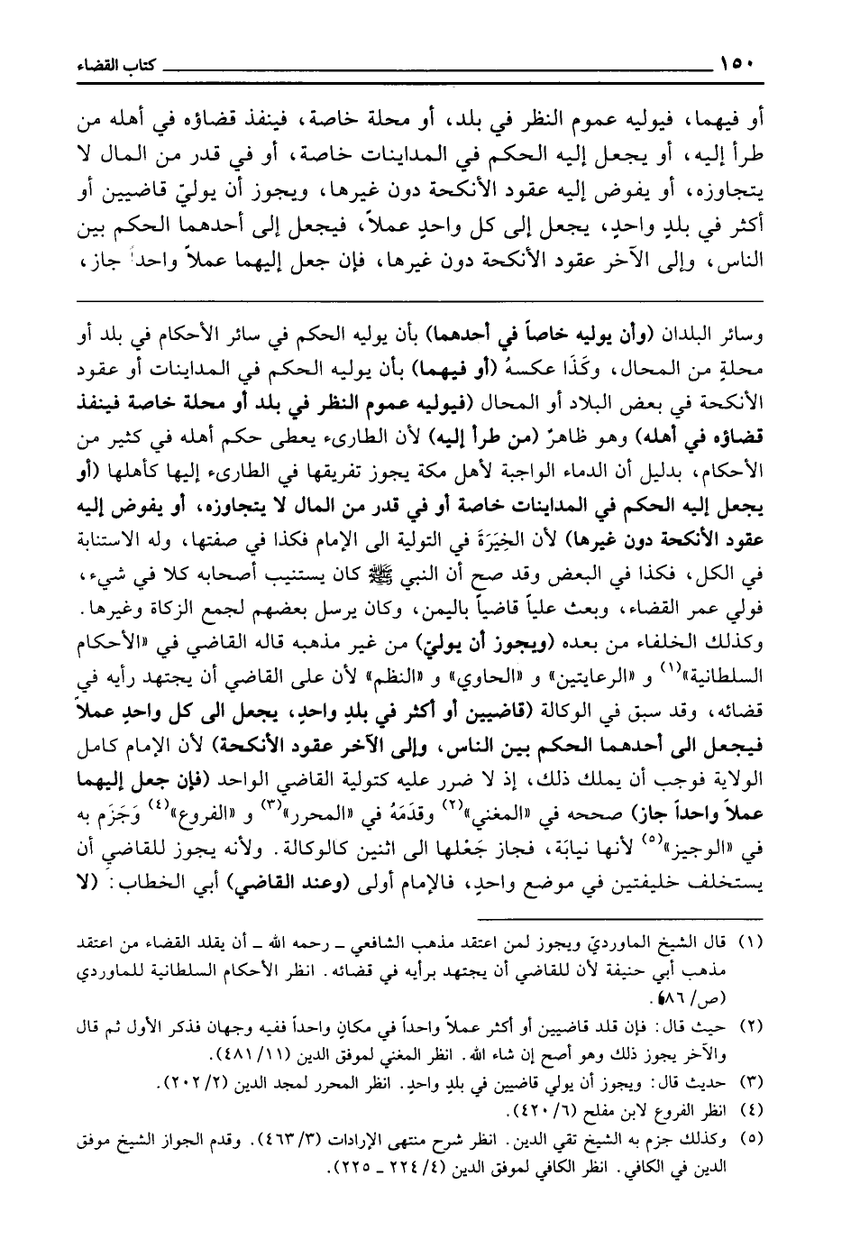 أَوْ فِيهِمَا. فَيُوَلِّيهِ عُمُومَ النَّظَرِ فِي بَلَدٍ أَوْ مَحَلَّةٍ خَاصَّةً فَيَنْفُذُ قَضَاؤُهُ فِي أَهْلِهِ، مَنْ طَرَأَ إِلَيْهِ أَوْ يَجْعَلُ إِلَيْهِ الْحُكْمَ فِي الْمُدَايَنَاتِ خَاصَّةً، أَوْ فِي قَدْرٍ مِنَ الْمَالِ لَا يَتَجَاوَزُهُ، أَوْ يُفَوِّضُ إِلَيْهِ عُقُودَ الْأَنْكِحَةِ دُونَ غَيْرِهَا. وَيَجُوزُ أَنْ يُوَلِّيَ قَاضِيَيْنِ أَوْ أَكْثَرَ فِي بَلَدٍ وَاحِدٍ، يَجْعَلُ إِلَى كُلِّ وَاحِدٍ عَمَلًا، فَيَجْعَلُ إِلَى أَحَدِهِمَا الْحُكْمَ بَيْنَ النَّاسِ، وَإِلَى الْآخَرِ عُقُودَ الْأَنْكِحَةِ دُونَ غَيْرِهَا. فَإِنْ جَعَلَ إِلَيْهِمَا عَمَلًا وَاحِدًا جَازَ.