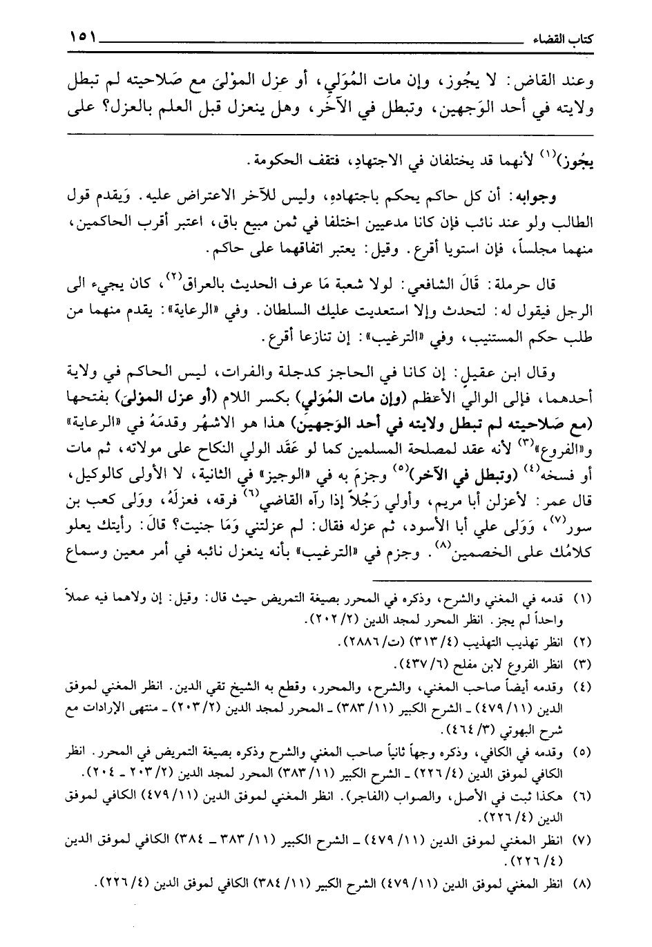 وَقَالَ ابْنُ عَقِيلٍ: إِنْ كَانَا فِي الْحَاجِزِ كَدِجْلَةَ وَالْفُرَاتِ، لَيْسَ الْحَاكِمُ فِي وِلَايَةِ أَحَدِهِمَا، فَإِلَى الْوَالِي الْأَعْظَمِ. (وَإِنْ مَاتَ الْمُوَلِّي) بِكَسْرِ اللَّامِ (أَوْ عُزِلَ الْمُوَلَّى) بِفَتْحِهَا (مَعَ صَلَاحِيَتِهِ لَمْ تَبْطُلْ وِلَايَتُهُ فِي أَحَدِ الْوَجْهَيْنِ) هَذَا هُوَ الْأَشْهَرُ، وَقَدَّمَهُ فِي الرِّعَايَةِ وَالْفُرُوعِ؛ لِأَنَّهُ عَقْدٌ لِمَصْلَحَةِ الْمُسْلِمِينَ، كَمَا لَوْ عَقَدَ الْوَلِيُّ النِّكَاحَ عَلَى مَوْلَاتِهِ ثُمَّ مَاتَ أَوْ فَسَخَهُ. (وَتَبْطُلُ فِي الْآخَرِ) وَجَزَمَ بِهِ فِي الْوَجِيزِ، فِي الثَّانِيَةِ: لَا، الْأُولَى: كَالْوَكِيلِ، قَالَ عُمَرُ: لَأَعْزِلَنَّ أَبَا مَرْيَمَ، وَأُوَلِّي رَجُلًا إِذَا رَآهُ الْفَاجِرُ فَرِقَهُ. فَعَزَلَهُ وَوَلَّى كَعْبَ بْنَ سُورٍ، وَوَلَّى عَلِيٌّ أَبَا الْأَسْوَدِ ثُمَّ عَزَلَهُ، فَقَالَ: لِمَ عَزَلْتَنِي وَمَا جَنَيْتُ؛ قَالَ: رَأَيْتُكَ يَعْلُو كَلَامُكَ عَلَى الْخَصْمَيْنِ. وَجَزَمَ فِي التَّرْغِيبِ: بِأَنَّهُ يَنْعَزِلُ نَائِبُهُ فِي أَمْرٍ مُعَيَّنٍ، وَسَمَاعِ