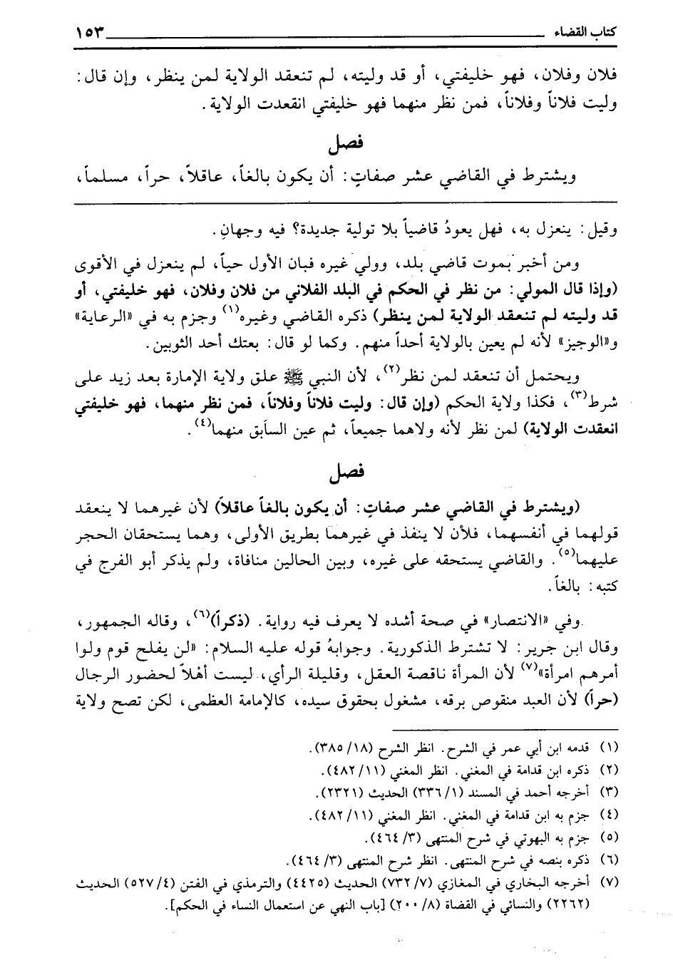 وَيُشْتَرَطُ فِي الْقَاضِي عَشْرُ صِفَاتٍ: أَنْ يَكُونَ بَالِغًا، عَاقِلًا، حُرًّا، مُسْلِمًا،