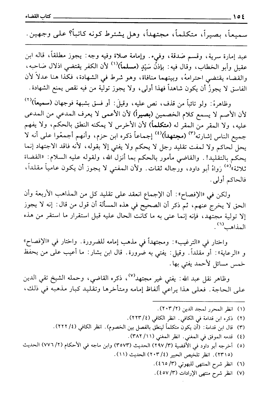 وَظَاهِرُهُ: وَلَوْ تَائِبًا مِنْ قَذْفٍ، نَصَّ عَلَيْهِ، وَقِيلَ: أَوْ فِسْقٍ بِشُبْهَةٍ، فَوَجْهَانِ. (سَمِيعًا) لِأَنَّ الْأَصَمَّ لَا يَسْمَعُ كَلَامَ الْخَصْمَيْنِ. (بَصِيرًا) لِأَنَّ الْأَعْمَى لَا يَعْرِفُ الْمُدَّعِيَ مِنَ الْمُدَّعَى عَلَيْهِ، وَلَا الْمُقِرَّ مِنَ الْمُقَرِّ لَهُ. (مُتَكَلِّمًا) لِأَنَّ الْأَخْرَسَ لَا يُمْكِنُهُ النُّطْقُ بِالْحُكْمِ، وَلَا يَفْهَمُ جَمِيعُ النَّاسِ إِشَارَتَهُ. (مُجْتَهِدًا) إِجْمَاعًا، ذَكَرَهُ ابْنُ حَزْمٍ، وَأَنَّهُمْ أَجْمَعُوا عَلَى أَنَّهُ لَا يَحِلُّ لِحَاكِمٍ وَلَا لِمُفْتٍ تَقْلِيدُ رَجُلٍ لَا يَحْكُمُ وَلَا يُفْتِي إِلَّا بِقَوْلِهِ؛ لِأَنَّهُ فَاقِدُ الِاجْتِهَادِ، إِنَّمَا يَحْكُمُ بِالتَّقْلِيدِ! وَالْقَاضِي مَأْمُورٌ بِالْحُكْمِ بِمَا أَنْزَلَ اللَّهُ، وَلِقَوْلِهِ - عَلَيْهِ السَّلَامُ -: «الْقُضَاةُ ثَلَاثَةٌ» رَوَاهُ أَبُو دَاوُدَ، وَرِجَالُهُ ثِقَاتٌ. وَلِأَنَّ الْمُفْتِيَ لَا يَجُوزُ أَنْ يَكُونَ عَامِّيًّا مُقَلِّدًا، فَالْحَاكِمُ أَوْلَى.