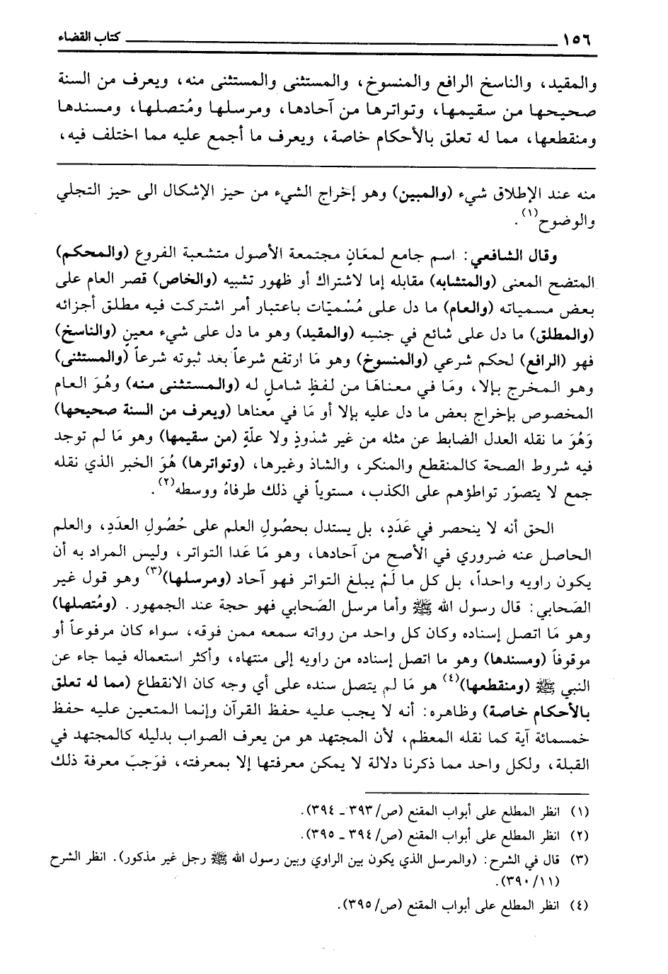 وَقَالَ الشَّافِعِيُّ: اسْمٌ جَامِعٌ لِمَعَانٍ مُجْتَمِعَةِ الْأُصُولِ مُتَشَعِّبَةِ الْفُرُوعِ. (وَالْمُحْكَمَ) الْمُتَّضِحَ الْمَعْنَى. (وَالْمُتَشَابِهَ) مُقَابِلُهُ: إِمَّا لِاشْتِرَاكٍ، أَوْ ظُهُورِ تَشْبِيهٍ. (وَالْخَاصَّ) قَصْرُ الْعَامِّ عَلَى بَعْضِ مُسَمَّيَاتِهِ. (وَالْعَامَّ) مَا دَلَّ عَلَى مُسَمَّيَاتٍ بِاعْتِبَارِ أَمْرٍ اشْتَرَكَتْ فِيهِ مُطْلَقُ أَجْزَائِهِ. (وَالْمُطْلَقَ) مَا دَلَّ عَلَى شَائِعٍ فِي جِنْسِهِ. (وَالْمُقَيَّدَ) وَهُوَ مَا دَلَّ عَلَى شَيْءٍ مُعَيَّنٍ. (وَالنَّاسِخَ وَالْمَنْسُوخَ) فَهُوَ: الرَّافِعُ لِحُكْمٍ شَرْعِيٍّ. (وَالْمَنْسُوخَ) وَهُوَ: مَا ارْتَفَعَ شَرْعًا بَعْدَ ثُبُوتِهِ شَرْعًا. (وَالْمُسْتَثْنَى) وَهُوَ الْمُخْرَجُ بِإِلَّا، وَمَا فِي مَعْنَاهَا مِنْ لَفْظٍ شَامِلٍ لَهُ. (وَالْمُسْتَثْنَى مِنْهُ) وَهُوَ: الْعَامُّ الْمَخْصُوصُ بِإِخْرَاجِ بَعْضِ مَا دُلَّ عَلَيْهِ بِإِلَّا، أَوْ مَا فِي مَعْنَاهَا.