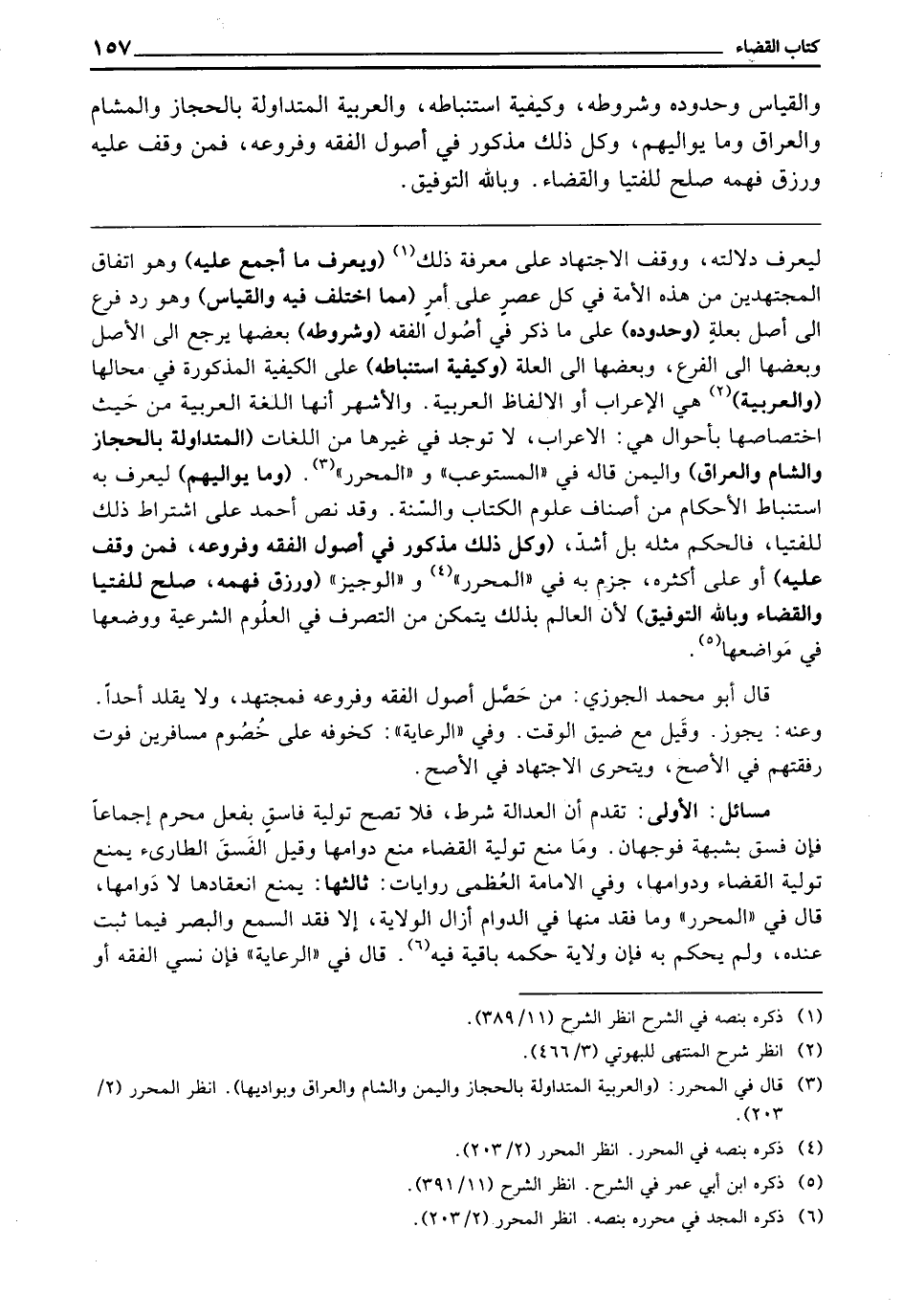 وَالْقِيَاسَ وَحُدُودَهُ وَشُرُوطَهُ، وَكَيْفِيَّةَ اسْتِنْبَاطِهِ، وَالْعَرَبِيَّةَ الْمُتَدَاوَلَةَ بِالْحِجَازِ وَالشَّامِ وَالْعِرَاقِ وَمَا يُوَالِيهِمْ. وَكُلُّ ذَلِكَ مَذْكُورٌ فِي أُصُولِ الْفِقْهِ وَفُرُوعِهِ، فَمَنْ وَقَفَ عَلَيْهِ وَرُزِقَ فَهْمُهُ، صَلَحَ للفتيا والْقَضَاءِ، وَبِاللَّهِ التَّوْفِيقُ.