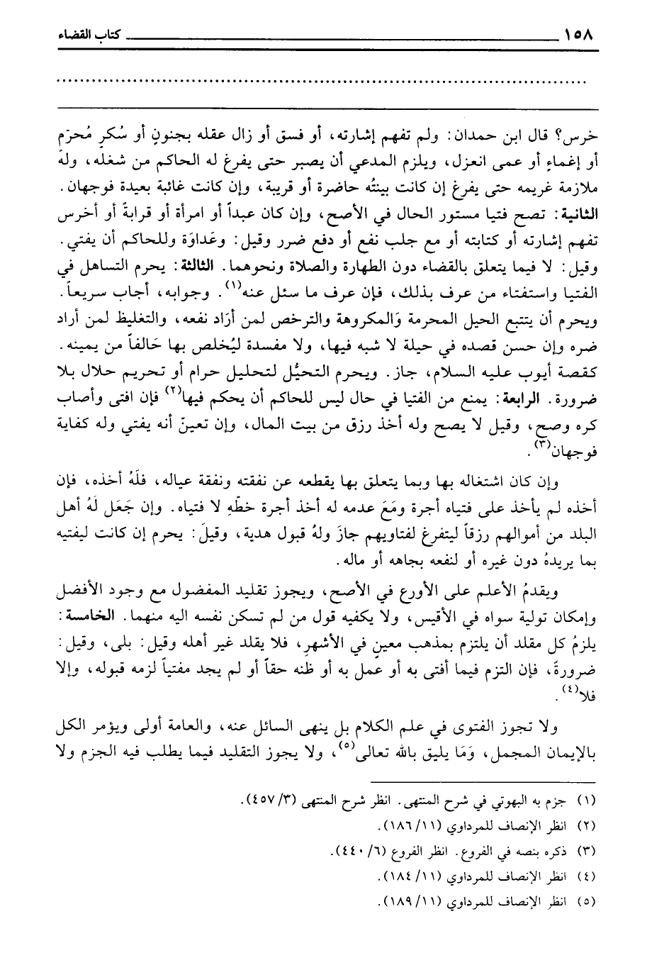 الرَّابِعَةُ: يُمْنَعُ مِنَ الْفُتْيَا فِي حَالٍ لَيْسَ لِلْحَاكِمِ أَنْ يَحْكُمَ فِيهَا فَإِنْ أَفْتَى وَأَصَابَ كُرِهَ وَصَحَّ، وَقِيلَ: لَا يَصِحُّ، وَلَهُ أَخْذُ رِزْقٍ مِنْ بَيْتِ الْمَالِ، وَإِنْ تَعَيَّنَ أَنَّهُ يُفْتِي وَلَهُ كِفَايَةٌ فَوَجْهَانِ. وَإِنْ كَانَ اشْتِغَالُهُ بِهَا وَبِمَا يَتَعَلَّقُ بِهَا يَقْطَعُهُ عَنْ نَفَقَتِهِ وَنَفَقَةِ عِيَالِهِ، فَلَهُ أَخْذُهُ، فَإِنْ أَخَذَهُ لَمْ يَأْخُذْ عَلَى فُتْيَاهُ أُجْرَةً، وَمَعَ عَدَمِهِ لَهُ أَخْذُ أُجْرَةِ خَطِّهِ لَا فُتْيَاهُ. وَإِنْ جَعَلَ لَهُ أَهْلُ الْبَلَدِ مِنْ أَمْوَالِهِمْ رِزْقًا لِيَتَفَرَّغَ لِفَتَاوِيهِمْ جَازَ. وَلَهُ قَبُولُ هَدِيَّةٍ، وَقِيلَ: يَحْرُمُ إِنْ كَانَتْ لِيُفْتِيَهُ بِمَا يُرِيدُهُ دُونَ غَيْرِهِ أَوْ لِنَفْعِهِ بِجَاهِهِ أَوْ مَالِهِ.