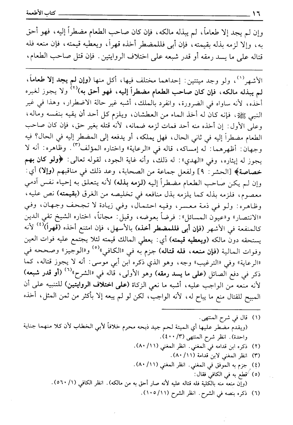 ـــــــــــــــــــــــــــــQالْأَشْهَرِ، وَلَوْ وَجَدَ مَيْتَتَيْنِ إِحْدَاهُمَا مُخْتَلَفٌ فِيهَا أَكَلَ مِنْهَا، (وَإِنْ لَمْ يَجِدْ إِلَّا طَعَامًا لَمْ يَبْذُلْهُ مَالِكُهُ، فَإِنْ كَانَ صَاحِبُ الطَّعَامِ مُضْطَرًّا إِلَيْهِ فَهُوَ أَحَقُّ بِهِ) وَلَا يَجُوزُ لِغَيْرِهِ أَخْذُهُ، لِأَنَّهُ سَاوَاهُ فِي الضَّرُورَةِ، وَانْفَرَدَ بِالْمِلْكِ، أَشْبَهَ غَيْرَ حَالَةِ الِاضْطِرَارِ، وَهَذَا فِي غَيْرِ النَّبِيِّ - صَلَّى اللَّهُ عَلَيْهِ وَسَلَّمَ -، فَإِنَّهُ كَانَ لَهُ أَخْذُ الْمَاءِ مِنَ الْعَطْشَانِ، وَيَلْزَمُ كُلُّ أَحَدٍ أَنْ يَقِيَهُ بِنَفْسِهِ وَمَالِهِ، وَعَلَى الْأَوَّلِ: إِنْ أَخَذَهُ مِنْهُ أَحَدٌ فَمَاتَ لَزِمَهُ ضمانه، لِأَنَّهُ قَتَلَهُ بِغَيْرِ حَقٍّ، فَإِنْ كَانَ صَاحِبُ الطَّعَامِ مُضْطَرًّا إِلَيْهِ فِي ثَانِي الْحَالِ، فَهَلْ يَمْلِكُهُ، أَوْ يَدْفَعُهُ إِلَى الْمُضْطَرِّ إِلَيْهِ فِي الْحَالِ؛ فِيهِ وَجْهَانِ، أَظْهَرُهُمَا: لَهُ إِمْسَاكُهُ، قَالَهُ فِي الرِّعَايَةِ، وَاخْتَارَهُ الْمُؤَلِّفُ، وَظَاهِرُهُ أَنَّهُ لَا يَجُوزُ لَهُ إِيثَارُهُ، وَفِي الْهَدْيِ: لَهُ ذَلِكَ، وَأَنَّهُ غَايَةُ الْجُودِ، لِقَوْلِهِ تَعَالَى: {وَلَوْ كَانَ بِهِمْ خَصَاصَةٌ} [الحشر: 9] ، وَلِفِعْلِ جَمَاعَةٍ مِنَ الصَّحَابَةِ، وَعُدَّ ذَلِكَ فِي مَنَاقِبِهِمْ، (وَإِلَّا) أَيْ: وَإِنْ لَمْ يَكُنْ صَاحِبُ الطَّعَامِ مُضْطَرًّا إِلَيْهِ (لَزِمَهُ بَذْلُهُ) لِأَنَّهُ يَتَعَلَّقُ بِهِ إِحْيَاءُ نَفْسِ آدَمِيٍّ مَعْصُومٍ فَلَزِمَهُ بَذْلُهُ كَمَا يَلْزَمُهُ بَذْلُ مَنَافِعِهِ فِي تَخْلِيصِهِ مِنَ الْغَرَقِ، (بِقِيمَتِهِ) نَصَّ عَلَيْهِ، وَظَاهِرُهُ: وَلَوْ فِي ذِمَّةِ مُعْسِرٍ، وَفِيهِ احْتِمَالٌ، وَفِي زِيَادَةٍ لَا تُجْحِفُ وَجْهَانِ، وَفِي الِانْتِصَارِ، وَعُيُونِ الْمَسَائِلِ: فَرْضًا بِعِوَضِهِ، وَقِيلَ: مَجَّانًا، اخْتَارَهُ الشَّيْخُ تَقِيُّ الدِّينِ كَالْمَنْفَعَةِ فِي الْأَشْهَرِ، (فَإِنْ أَبَى فلِلْمُضْطَرِّ أَخْذُهُ) بِالْأَسْهَلِ، فَإِنِ امْتَنَعَ أَخَذَهُ (قَهْرًا) لِأَنَّهُ يَسْتَحِقُّهُ دُونَ مَالِكِهِ، (وَيُعْطِيهِ قِيمَتَهُ) أَيْ: يُعْطِي الْمَالِكَ قِيمَتَهُ، لِئَلَّا يَجْتَمِعَ عَلَيْهِ فَوَاتُ الْعَيْنِ، وَفَوَاتُ الْمَالِيَّةِ، (فَإِنْ مَنَعَهُ فَلَهُ قِتَالُهُ) جَزَمَ بِهِ فِي الْكَافِي وَالْوَجِيزِ، وَصَحَّحَهُ فِي الرِّعَايَةِ، وَفِي التَّرْغِيبِ وَجْهٌ، وَهُوَ الَّذِي ذَكَرَهُ ابْنُ أَبِي مُوسَى: أَنَّهُ لَا يَجُوزُ قِتَالُهُ، كَمَا ذَكَرَ فِي دَفْعِ الصَّائِلِ (عَلَى مَا يَسُدُّ رَمَقَهُ) وَهُوَ الْأَوْلَى، قَالَهُ فِي الشَّرْحِ (أَوْ قَدْرِ شِبَعِهِ) لِأَنَّهُ مَنَعَهُ مِنَ الْوَاجِبِ عَلَيْهِ، أَشْبَهَ مَانِعِي الزَّكَاةِ، (عَلَى اخْتِلَافِ الرِّوَايَتَيْنِ) لِلتَّنْبِيهِ عَلَى أَنَّ الْمُبِيحَ لِلْقِتَالِ مَنْعُ مَا يُبَاحُ لَهُ، لِأَنَّهُ الْوَاجِبُ، لَكِنْ لَوْ لَمْ يَبِعْهُ إِلَّا بِأَكْثَرَ مِنْ ثَمَنِ الْمِثْلِ أَخَذَهُ
