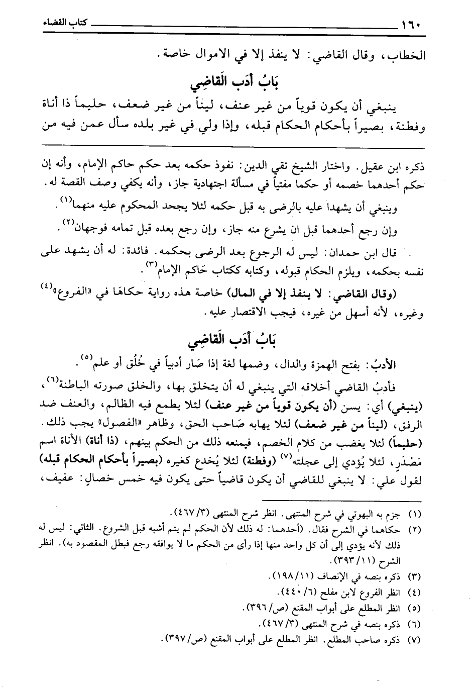 بَابُ أَدَبِ الْقَاضِي الْأَدَبُ: بِفَتْحِ الْهَمْزَةِ وَالدَّالِ وَضَمِّهَا، لُغَةً: إِذَا صَارَ أَدَبِيًّا فِي خُلُقٍ أَوْ عِلْمٍ. فَأَدَبُ الْقَاضِي: أَخْلَاقُهُ الَّتِي يَنْبَغِي لَهُ أَنْ يَتَخَلَّقَ بِهَا، وَالْخُلُقُ صُورَتُهُ الْبَاطِنَةُ. (يَنْبَغِي) أَيْ: يُسَنُّ. (أَنْ يَكُونَ قَوِيًّا مِنْ غَيْرِ عُنْفٍ) لِئَلَّا يَطْمَعَ فِيهِ الظَّالِمُ، وَالْعُنْفُ ضِدُّ الرِّفْقِ. (لَيِّنًا مِنْ غَيْرِ ضَعْفٍ) لِئَلَّا يَهَابَهُ صَاحِبُ الْحَقِّ، وَظَاهِرُ الْفُصُولِ يَجِبُ ذَلِكَ. (حَلِيمًا) لِئَلَّا يَغْضَبَ مِنْ كَلَامِ الْخَصْمِ، فَيَمْنَعَهُ ذَلِكَ مِنَ الْحُكْمِ بَيْنَهُمْ، (ذَا أَنَاةٍ) ، الْأَنَاةُ: اسْمُ مَصْدَرٍ، لِئَلَّا يُؤَدِّيَ إِلَى عَجَلَتِهِ. (وَفِطْنَةٍ) لِئَلَّا يُخْدَعَ كَغَيْرِهِ. (بَصِيرًا بِأَحْكَامِ الْحُكَّامِ قَبْلَهُ) لِقَوْلِ عَلِيٍّ: لَا يَنْبَغِي لِلْقَاضِي أَنْ يَكُونَ قَاضِيًا حَتَّى يَكُونَ فِيهِ خَمْسُ خِصَالٍ: عَفِيفٌ،
