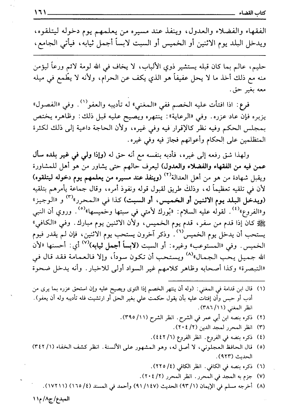 الْفُقَهَاءِ وَالْفُضَلَاءِ وَالْعُدُولِ. وَيُنْفِذُ عِنْدَ مُسِيرِهِ مَنْ يَعْلَمُهُمْ يَوْمَ دُخُولِهِ لِيَتَلَقَّوْهُ. وَيَدْخُلُ الْبَلَدَ يَوْمَ الِاثْنَيْنِ أَوِ الْخَمِيسِ أَوِ السَّبْتِ، لَابِسًا أَجْمَلَ ثِيَابِهِ، فَيَأْتِي الْجَامِعَ