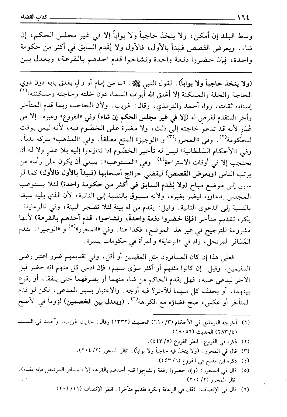 (وَلَا يَتَّخِذُ حَاجِبًا وَلَا بَوَّابًا) لِقَوْلِ النَّبِيِّ - صَلَّى اللَّهُ عَلَيْهِ وَسَلَّمَ -: «مَا مِنْ إِمَامٍ أَوْ وَالٍ يَغْلِقُ بَابَهُ دُونَ ذَوِي الْحَاجَةِ وَالْخَلَّةِ وَالْمَسْكَنَةِ، إِلَّا أَغْلَقَ اللَّهُ أَبْوَابَ السَّمَاءِ دُونَ خَلَّتِهِ وَحَاجَتِهِ وَمَسْكَنَتِهِ» . إِسْنَادُهُ ثِقَاتٌ، رَوَاهُ أَحْمَدُ وَالتِّرْمِذِيُّ، وَقَالَ: غَرِيبٌ. وَلِأَنَّ الْحَاجِبَ رُبَّمَا قَدَّمَ الْمُتَأَخِّرَ وَأَخَّرَ الْمُتَقَدِّمَ لِغَرَضٍ لَهُ. (إِلَّا فِي غَيْرِ مَجْلِسِ الْحُكْمِ إِنْ شَاءَ) وَفِي الْفُرُوعِ وَغَيْرِهِ: إِلَّا مِنْ عُذْرٍ؛ لِأَنَّهُ قَدْ تَدْعُو حَاجَتُهُ إِلَى ذَلِكَ، وَلَا مَضَرَّةَ عَلَى الْخُصُومِ فِيهِ، لِأَنَّهُ لَيْسَ بِوَقْتٍ لِلْحُكُومَةِ. وَفِي الْمُحَرَّرِ وَالْوَجِيزِ: الْمَنْعُ مُطْلَقًا. وَفِي الْمَذْهَبِ: يَتْرُكُهُ نَدْبًا. وَفِي الْأَحْكَامِ السُّلْطَانِيَّةِ: لَيْسَ لَهُ تَأْخِيرُ الْخُصُومِ إِذَا تَنَازَعُوا إِلَيْهِ بِلَا عُذْرٍ، وَلَا لَهُ أَنْ يَحْتَجِبَ إِلَّا فِي أَوْقَاتِ الِاسْتِرَاحَةِ. وَفِي الْمُسْتَوْعِبِ: يَنْبَغِي أَنْ يَكُونَ عَلَى رَأْسِهِ مَنْ يُرَتِّبُ النَّاسَ. (وَيُعْرَضُ الْقَصَصُ) لِيَقْضِيَ حَوَائِجَ أَصْحَابِهَا. (فَيَبْدَأُ بِالْأَوَّلِ فَالْأَوَّلِ) كَمَا لَوْ سَبَقَ إِلَى مَوْضِعٍ مُبَاحٍ. (وَلَا يُقَدِّمُ السَّابِقَ فِي أَكْثَرَ مِنْ حُكُومَةٍ وَاحِدَةٍ) لِئَلَّا يَسْتَوْعِبَ الْمَجْلِسَ بِدَعَاوِيهِ فَيَضُرَّ بِغَيْرِهِ، وَلِأَنَّهُ مَسْبُوقٌ بِالنِّسْبَةِ إِلَى الثَّانِيَةِ؛ لِأَنَّ الَّذِي يَلِيهِ سَبَقَهُ بِالنِّسْبَةِ إِلَى الدَّعْوَى الثَّانِيَةِ. وَقِيلَ: يُقَدِّمُ مَنْ لَهُ بَيِّنَةٌ لِئَلَّا تَضْجَرَ الْبَيِّنَةُ، وَفِي الرِّعَايَةِ يُكْرَهُ تَقْدِيمُ مُتَأَخِّرٍ (فَإِذَا حَضَرُوا دُفْعَةً وَاحِدَةً وَتَشَاحُّوا، قَدَّمَ أَحَدَهُمْ بِالْقُرْعَةِ) لِأَنَّهَا مَشْرُوعَةٌ لِلتَّرْجِيحِ فِي غَيْرِ هَذَا الْمَوْضِعِ، فَكَذَا هُنَا. وَفِي الْمُحَرَّرِ وَالْوَجِيزِ: يُقَدِّمُ الْمُسَافِرَ الْمُرْتَحِلَ. زَادَ فِي الرِّعَايَةِ: وَالْمَرْأَةَ فِي حُكُومَاتٍ يَسِيرَةٍ. فَعَلَى هَذَا إِنْ كَانَ الْمُسَافِرُونَ مِثْلَ الْمُقِيمِينَ أَوْ أَقَلَّ وَفِي تَقْدِيمِهِمْ ضَرَرٌ اعْتُبِرَ رِضَى الْمُقِيمِينَ، وَقِيلَ: إِنْ كَانُوا مِثْلَهُمْ أَوْ أَكْثَرَ سَوَّى بَيْنَهُمْ، فَإِنِ ادَّعَى كُلٌّ مِنْهُمْ أَنَّهُ حَضَرَ قَبْلَ الْآخَرِ لِيَدَّعِيَ عَلَيْهِ، فَهَلْ يُقَدِّمُ الْحَاكِمُ مَنْ شَاءَ مِنْهُمَا، أَوْ يَصْرِفُهُمَا حَتَّى يَتَّفِقَا، أَوْ يُقْرِعُ بَيْنَهُمَا، أَوْ يَحْلِفُ كُلٌّ مِنْهُمَا لِلْآخَرِ؛ فِيهِ أَوْجُهٌ. وَالِاعْتِبَارُ بِسَبْقِ الْمُدَّعِي، لَكِنْ لَوْ قَدَّمَ الْمُتَأَخِّرَ أَوْ عَكَسَ، صَحَّ قَضَاؤُهُ مَعَ الْكَرَاهَةِ.