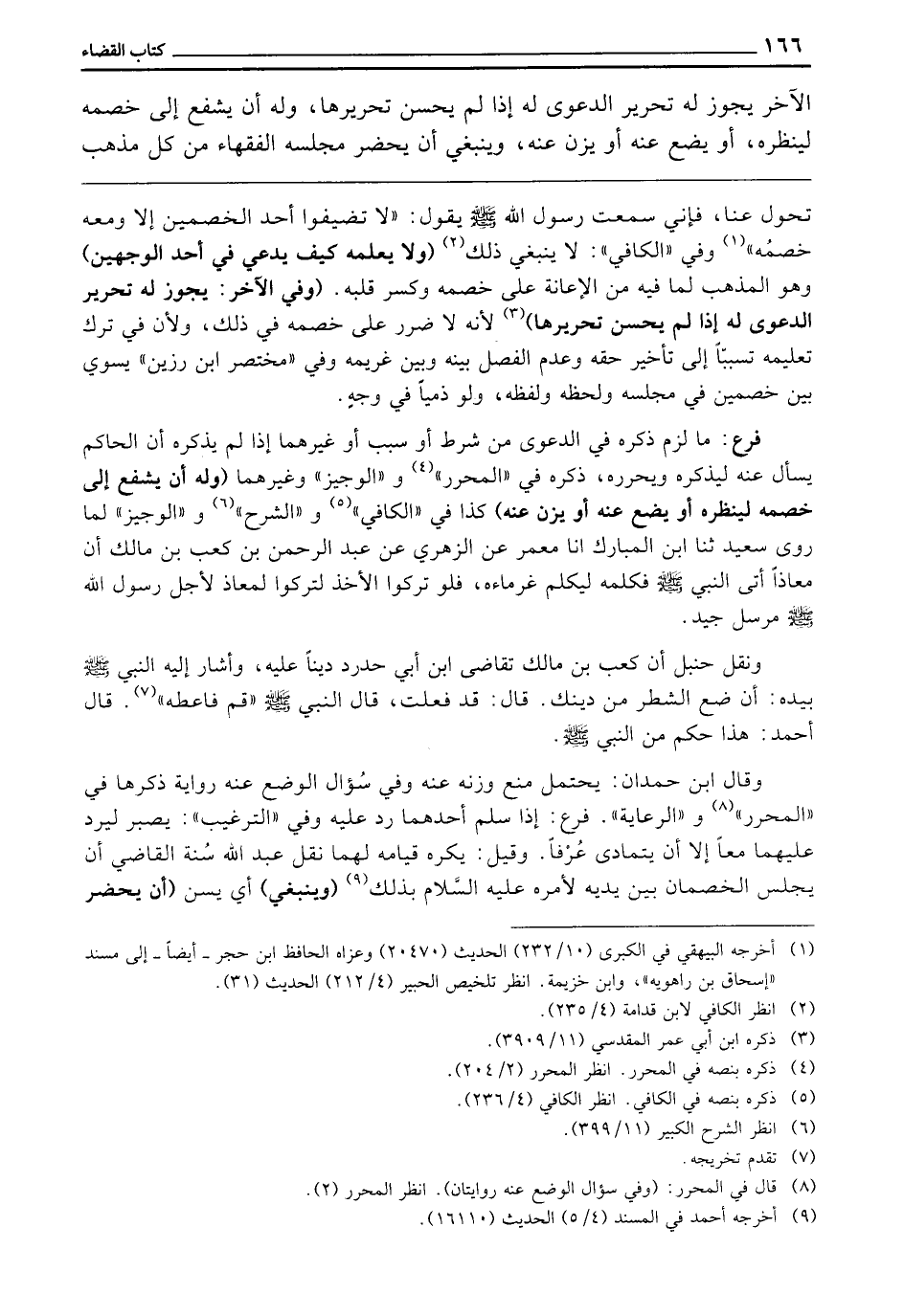 فَرْعٌ: مَا لَزِمَ ذِكْرُهُ فِي الدَّعْوَى مِنْ شَرْطٍ أَوْ سَبَبٍ أَوْ غَيْرِهِمَا إِذَا لَمْ يَذْكُرْهُ أَنَّ الْحَاكِمَ يَسْأَلُ عَنْهُ لِيَذْكُرَهُ وَيُحَرِّرَهُ، ذَكَرَهُ فِي الْمُحَرَّرِ وَالْوَجِيزِ وَغَيْرِهِمَا. (وَلَهُ أَنْ يَشْفَعَ إِلَى خَصْمِهِ لِيُنْظِرَهُ، أَوْ يَضَعَ عَنْهُ، أَوْ يَزِنَ عَنْهُ) كَذَا فِي الْكَافِي وَالشَّرْحِ وَالْوَجِيزِ، لِمَا رَوَى سَعِيدٌ، ثَنَا ابْنُ الْمُبَارَكِ، أَنَا مَعْمَرٌ، عَنِ الزُّهْرِيِّ، عَنْ عَبْدِ الرَّحْمَنِ بْنِ كَعْبِ بْنِ مَالِكٍ، «أَنَّ مُعَاذًا أَتَى النَّبِيَّ - صَلَّى اللَّهُ عَلَيْهِ وَسَلَّمَ - فَكَلَّمَهُ لِيُكَلِّمَ غُرَمَاءَهُ، فَلَوْ تَرَكُوا الْأَخْذَ لَتَرَكُوا لِمُعَاذٍ لِأَجْلِ رَسُولِ اللَّهِ - صَلَّى اللَّهُ عَلَيْهِ وَسَلَّمَ -» -. مُرْسَلٌ جَيِّدٌ. وَنَقَلَ حَنْبَلٌ «أَنَّ كَعْبَ بْنَ مَالِكٍ تَقَاضَى ابْنَ أَبِي حَدْرَدٍ دَيْنًا عَلَيْهِ، وَأَشَارَ إِلَيْهِ النَّبِيُّ - صَلَّى اللَّهُ عَلَيْهِ وَسَلَّمَ - بِيَدِهِ أَنْ ضَعِ الشَّطْرَ مِنْ دَيْنِكَ. قَالَ: قَدْ فَعَلْتُ. قَالَ النَّبِيُّ - صَلَّى اللَّهُ عَلَيْهِ وَسَلَّمَ -: قُمْ فَاعْطِهِ» . قَالَ أَحْمَدُ: هَذَا حُكْمٌ مِنَ النَّبِيِّ - صَلَّى اللَّهُ عَلَيْهِ وَسَلَّمَ -. وَقَالَ ابْنُ حَمْدَانَ: يَحْتَمِلُ مَنْعَ وَزْنِهِ عَنْهُ. وَفِي سُؤَالِ الْوَضْعِ عَنْهُ رِوَايَةٌ، ذَكَرَهَا فِي الْمُحَرَّرِ وَالرِّعَايَةِ.