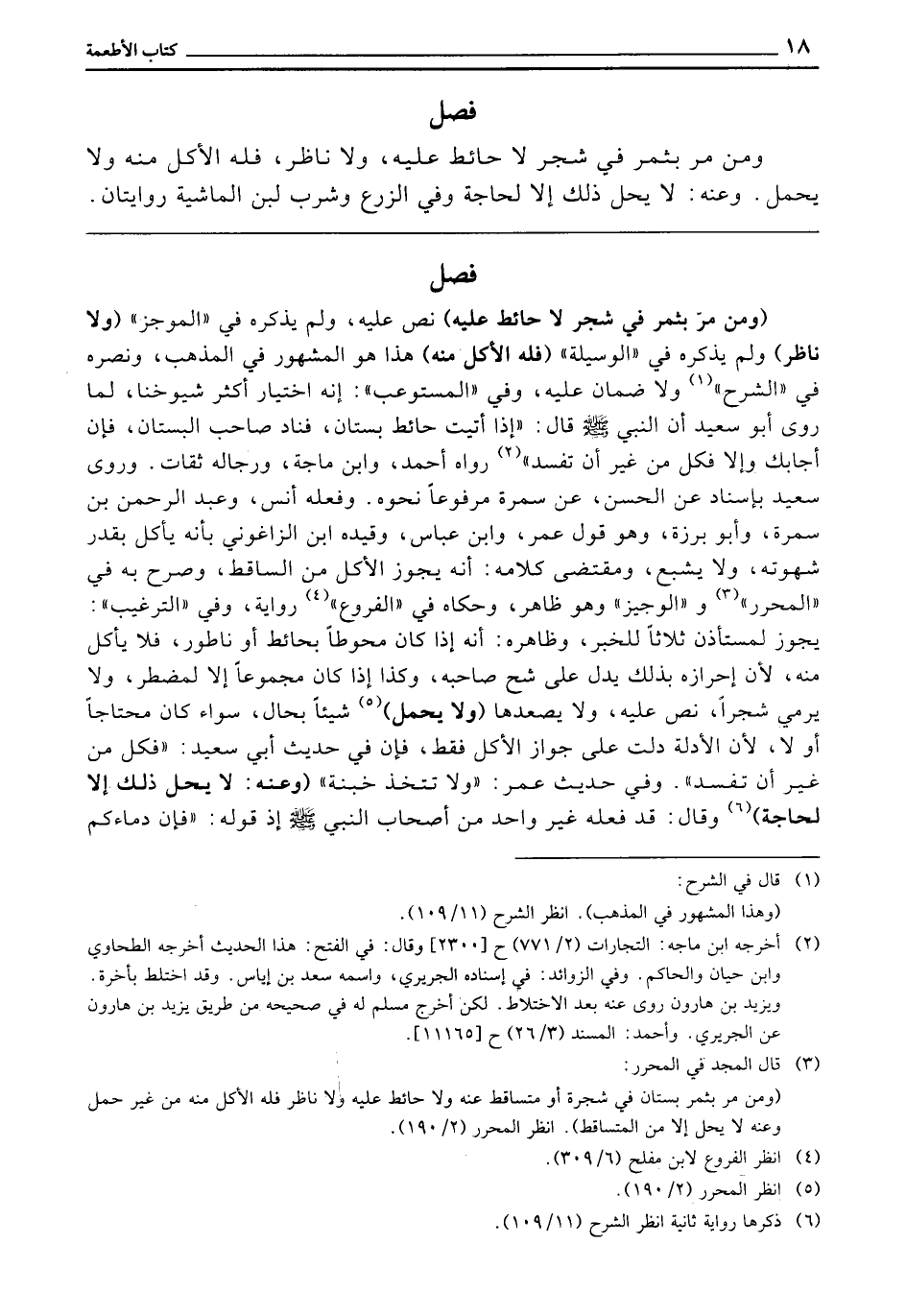 (وَمَنْ مَرَّ بِثَمَرٍ فِي شَجَرٍ لَا حَائِطَ عَلَيْهِ) نَصَّ عَلَيْهِ، وَلَمْ يَذْكُرْهُ فِي الْمُوجَزِ، (وَلَا نَاظِرَ) وَلَمْ يَذْكُرْهُ فِي الْوَسِيلَةِ، (فَلَهُ الْأَكْلُ مِنْهُ) هَذَا هُوَ الْمَشْهُورُ فِي الْمَذْهَبِ، وَنَصَرَهُ فِي الشَّرْحِ، وَلَا ضَمَانَ عَلَيْهِ، وَفِي الْمُسْتَوْعِبِ: إِنَّهُ اخْتِيَارُ أَكْثَرِ شُيُوخِنَا، لِمَا رَوَى أَبُو سَعِيدٍ أَنَّ النَّبِيَّ - صَلَّى اللَّهُ عَلَيْهِ وَسَلَّمَ - قَالَ: «إِذَا أَتَيْتَ حَائِطَ بُسْتَانٍ فَنَادِ صَاحِبَ الْبُسْتَانِ، فَإِنْ أَجَابَكَ، وَإِلَّا فَكُلْ مِنْ غَيْرِ أَنْ تُفْسِدَ.» رَوَاهُ أَحْمَدُ وَابْنُ مَاجَهْ، وَرِجَالُهُ ثِقَاتٌ. وَرَوَى سَعِيدٌ بِإِسْنَادٍ عَنِ الْحَسَنِ، عَنْ سَمُرَةَ مَرْفُوعًا نَحْوَهُ، وَفَعَلَهُ أَنَسٌ، وَعَبْدُ الرَّحْمَنِ بْنُ سَمُرَةَ، وَأَبُو بَرْزَةَ، وَهُوَ قَوْلُ عُمَرَ، وَابْنِ عَبَّاسٍ، وَقَيَّدَهُ ابْنُ الزَّاغُونِيِّ بِأَنَّهُ يَأْكُلُ بِقَدْرِ شَهْوَتِهِ، وَلَا يَشْبَعُ، ومقتضى كَلَامُهُ أَنَّهُ يَجُوزُ الْأَكْلُ مِنَ السَّاقِطِ، وَصَرَّحَ بِهِ فِي الْمُحَرَّرِ وَالْوَجِيزِ، وَهُوَ ظَاهِرٌ، وَحَكَاهُ فِي الْفُرُوعِ رِوَايَةً، وَفِي التَّرْغِيبِ: يَجُوزُ لِمُسْتَأْذِنٍ ثَلَاثًا لِلْخَبَرِ، وَظَاهِرُهُ: أَنَّهُ إِذَا كَانَ مُحَوَّطًا بِحَائِطٍ، أَوْ نَاطُورٍ فَلَا يَأْكُلُ مِنْهُ، لِأَنَّ إِحْرَازَهُ بِذَلِكَ يَدُلُّ عَلَى شُحِّ صَاحِبِهِ، وَكَذَا إِذَا كَانَ مَجْمُوعًا، إِلَّا لِمُضْطَرٍّ، وَلَا يَرْمِي شَجَرًا، نَصَّ عَلَيْهِ، وَلَا يَصْعَدُهَا، (وَلَا يَحْمِلُ) شَيْئًا بِحَالٍ، سَوَاءٌ كَانَ مُحْتَاجًا أَوْ لَا، لِأَنَّ الْأَدِلَّةَ دَلَّتْ عَلَى جَوَازِ الْأَكْلِ فَقَطْ، فَإِنَّ فِي حَدِيثِ أَبِي سَعِيدٍ: «فَكُلْ مِنْ غَيْرِ أَنْ تُفْسِدَ» ، وَفِي حَدِيثِ عُمَرَ: «وَلَا تَتَّخِذْ خُبْنَةً» (وَعَنْهُ: لَا يَحِلُّ ذَلِكَ إِلَّا لِحَاجَةٍ) وَقَالَ: قَدْ فَعَلَهُ غَيْرُ وَاحِدٍ مِنْ أَصْحَابِ النَّبِيِّ - صَلَّى اللَّهُ عَلَيْهِ وَسَلَّمَ - إِذْ قَوْلُهُ: «فَإِنَّ دِمَاءَكُمْ