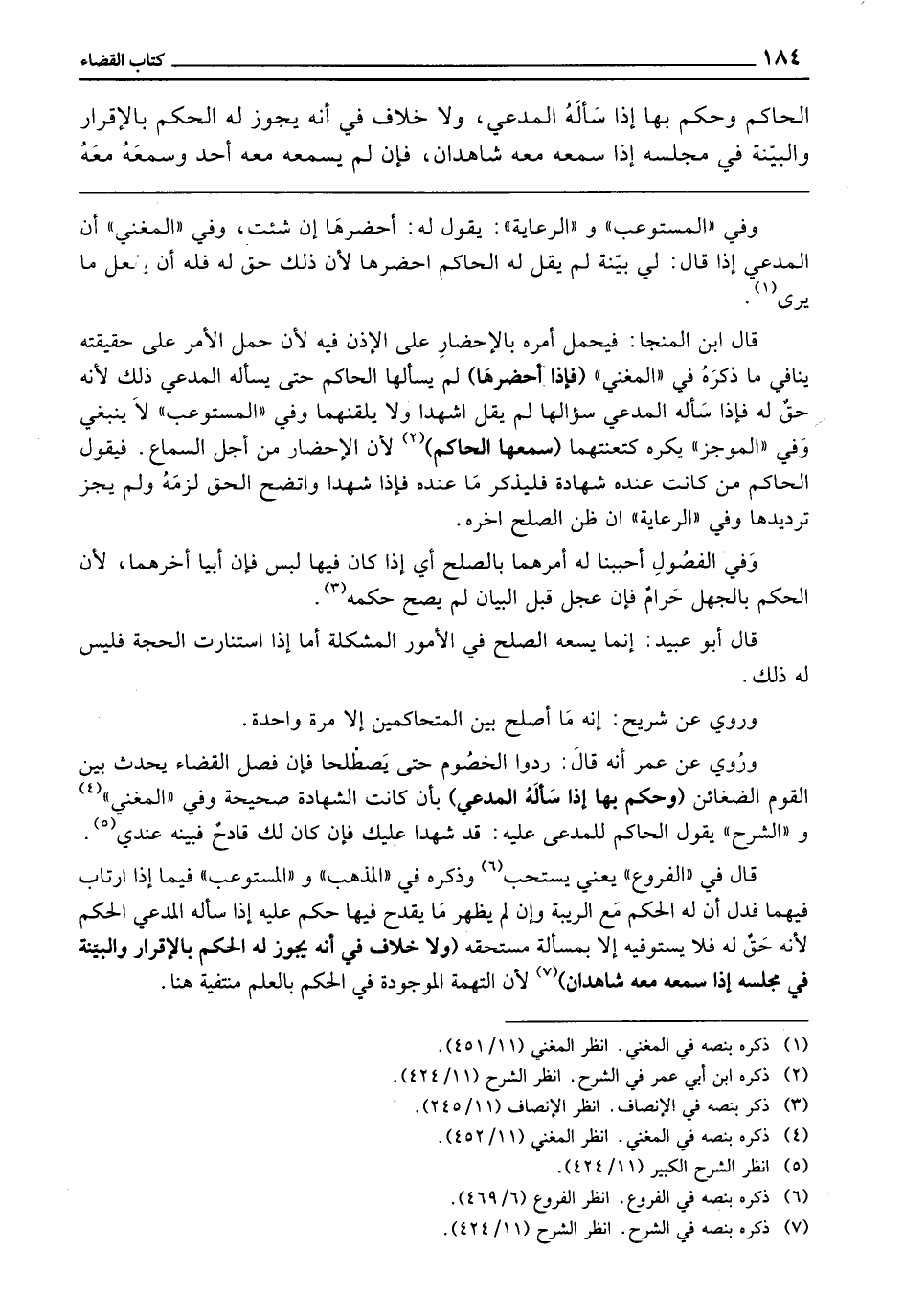 قَالَ فِي الْفُرُوعِ: يَعْنِي يُسْتَحَبُّ. وَذَكَرَهُ فِي الْمَذْهَبِ وَالْمُسْتَوْعِبِ فِيمَا إِذَا ارْتَابَ فِيهِمَا، فَدَلَّ أَنَّ لَهُ الْحُكْمَ مَعَ الرِّيبَةِ. وَإِنْ لَمْ يَظْهَرْ مَا يَقْدَحُ فِيهَا حَكَمَ عَلَيْهِ إِذَا سَأَلَهُ الْمُدَّعِي الْحُكْمَ ; لِأَنَّهُ حَقٌّ لَهُ فَلَا يَسْتَوْفِيهِ إِلَّا بِمَسْأَلَة مُسْتَحَقّه. (وَلَا خِلَافَ فِي أَنَّهُ يَجُوزُ لَهُ الْحُكْمُ بِالْإِقْرَارِ وَالْبَيِّنَةِ فِي مَجْلِسِهِ إِذَا سَمِعَهُ مَعَهُ شَاهِدَانِ) لِأَنَّ التُّهْمَةَ الْمَوْجُودَةَ فِي الْحُكْمِ بِالْعِلْمِ مُنْتَفِيَةٌ هُنَا.