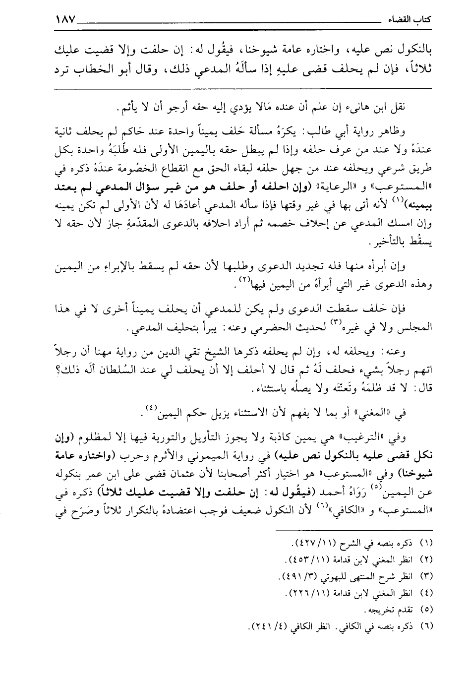 وَفِي التَّرْغِيبِ: هِيَ يَمِينٌ كَاذِبَةٌ، وَلَا يَجُوزُ التَّأْوِيلُ وَالتَّوْرِيَةُ فِيهَا إِلَّا لِمَظْلُومٍ. (وَإِنْ نَكَلَ قَضَى عَلَيْهِ بِالنُّكُولِ. نَصَّ عَلَيْهِ) فِي رِوَايَةِ الْمَيْمُونِيِّ وَالْأَثْرَمِ وَحَرْبٍ. (وَاخْتَارَهُ عَامَّةُ شُيُوخِنَا) وَفِي الْمُسْتَوْعِبِ: هُوَ اخْتِيَارُ أَكْثَرِ أَصْحَابِنَا ; لِأَنَّ عُثْمَانَ قَضَى عَلَى ابْنِ عُمَرَ بِنُكُولِهِ عَنِ الْيَمِينِ. رَوَاهُ أَحْمَدُ. (فَيَقُولُ لَهُ: إِنْ حَلَفْتَ، وَإِلَّا قَضَيْتُ عَلَيْكَ ثَلَاثًا) ذَكَرَهُ فِي الْمُسْتَوْعِبِ وَالْكَافِي لِأَنَّ النُّكُولَ ضَعِيفٌ، فَوَجَبَ اعْتِضَادُهُ بِالتَّكْرَارِ ثَلَاثًا، وَصَرَّحَ فِي