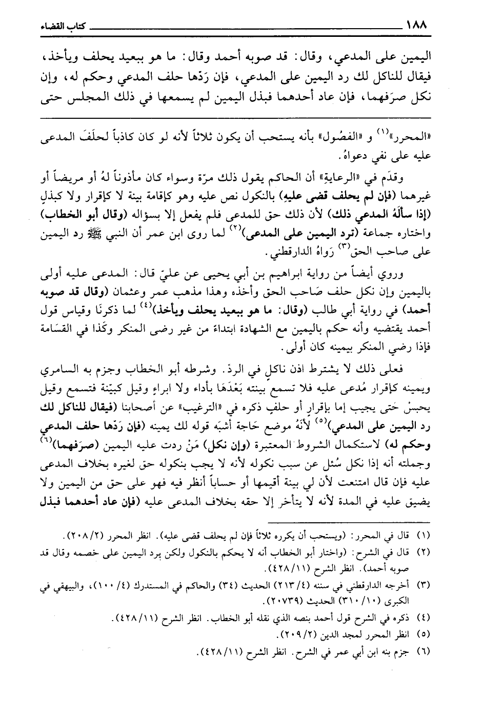 وَقَدَّمَ فِي الرِّعَايَةِ: أَنَّ الْحَاكِمَ يَقُولُ ذَلِكَ مَرَّةً، وَسَوَاءٌ كَانَ مَأْذُونًا لَهُ أَوْ مَرِيضًا أَوْ غَيْرَهُمَا. (فَإِنْ لَمْ يَحْلِفْ قَضَى عَلَيْهِ) بِالنُّكُولِ، نَصَّ عَلَيْهِ. وَهُوَ كَإِقَامَةِ بَيِّنَةٍ، لَا كَإِقْرَارٍ وَلَا كَبَذْلٍ. (إِذَا سَأَلَهُ الْمُدَّعِي ذَلِكَ) لِأَنَّ ذَلِكَ حَقٌّ لِلْمُدَّعِي فَلَمْ يُفْعَلْ إِلَّا بِسُؤَالِهِ. (وقال أبو الْخَطَّابِ) وَاخْتَارَهُ جَمَاعَةٌ (تُرَدُّ الْيَمِينُ عَلَى الْمُدَّعِي) لِمَا رَوَى ابْنُ عُمَرَ «أَنَّ النَّبِيَّ - صَلَّى اللَّهُ عَلَيْهِ وَسَلَّمَ - رَدَّ الْيَمِينَ عَلَى صَاحِبِ الْحَقِّ» رَوَاهُ الدَّارَقُطْنِيُّ.