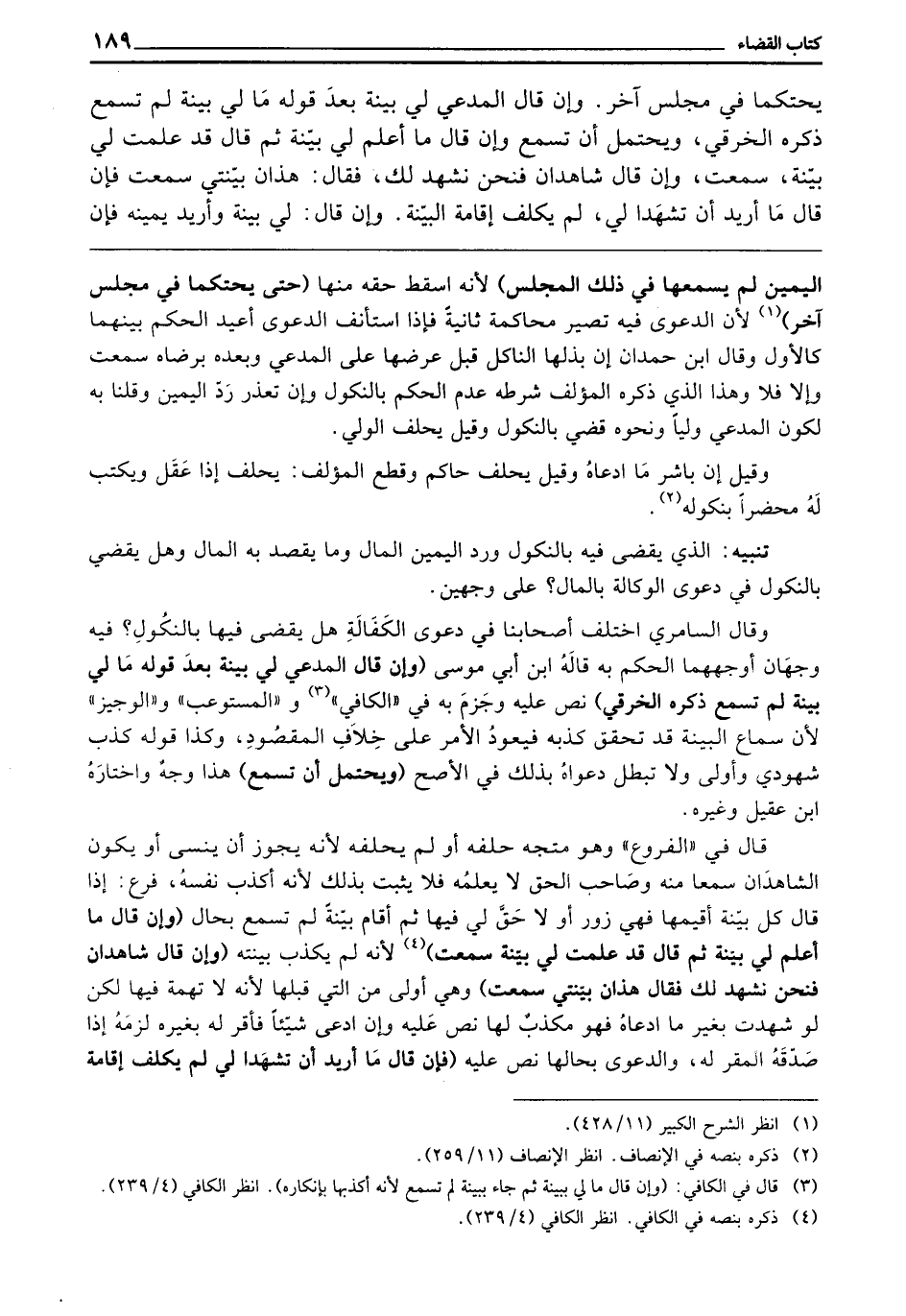 وَقِيلَ: إِنْ بَاشَرَ مَا ادَّعَاهُ. وَقِيلَ: يُحَلِّفُ حَاكِمٌ. وَقَطَعَ الْمُؤَلِّفُ: يَحْلِفُ إِذَا عَقَلَ وَيَكْتُبُ لَهُ مَحْضَرًا بِنُكُولِهِ. تَنْبِيهٌ: الَّذِي يُقْضَى فِيهِ بِالنُّكُولِ وَرَدِّ الْيَمِينِ الْمَالُ، وَمَا يُقْصَدُ بِهِ الْمَالُ. وَهَلْ يُقْضَى بِالنُّكُولِ فِي دَعْوَى الْوِكَالَةِ بِالْمَالِ؛ عَلَى وَجْهَيْنِ.