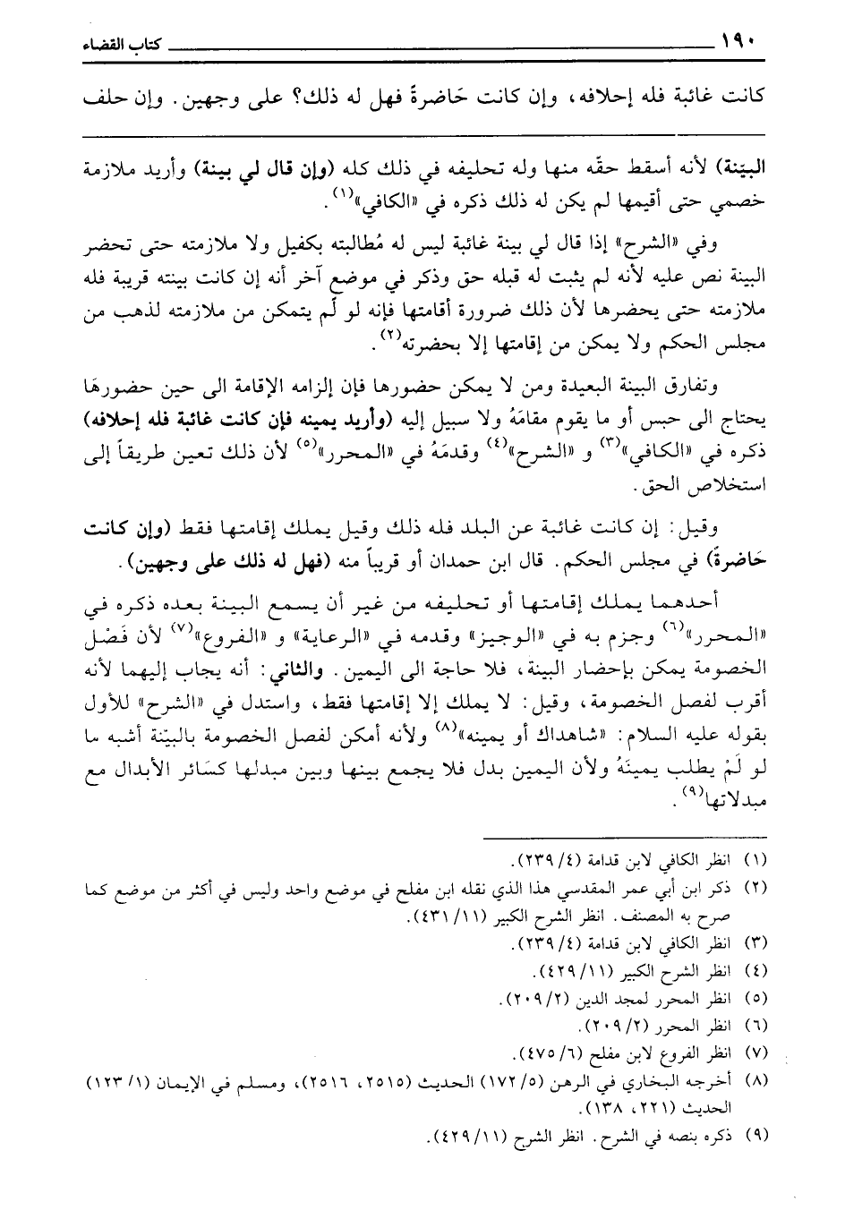 وَتُفَارَقُ الْبَيِّنَةُ الْبَعِيدَةُ وَمَنْ لَا يُمْكِنُ حُضُورُهَا. فَإِنَّ إِلْزَامَهُ الْإِقَامَةَ إِلَى حِينِ حُضُورِهَا يَحْتَاجُ إِلَى حَبْسٍ، أَوْ مَا يَقُومُ مَقَامَهُ وَلَا سَبِيلَ إِلَيْهِ. (وَأُرِيدُ يَمِينَهُ. فَإِنْ كَانَتْ غَائِبَةً فَلَهُ إِحْلَافُهُ) ذَكَرَهُ فِي الْكَافِي وَالشَّرْحِ، وَقَدَّمَهُ فِي الْمُحَرَّرِ، لِأَنَّ ذَلِكَ تَعَيَّنَ طَرِيقًا إِلَى اسْتِخْلَاصِ الْحَقِّ. وَقِيلَ: إِنْ كَانَتْ غَائِبَةً عَنِ الْبَلَدِ فَلَهُ ذَلِكَ. وَقِيلَ: يَمْلِكُ إِقَامَتَهَا فَقَطْ. (وَإِنْ كَانَتْ حَاضِرَةً) فِي مَجْلِسِ الْحُكْمِ. قَالَ ابْنُ حَمْدَانَ: أَوْ قَرِيبًا مِنْهُ. (فَهَلْ لَهُ ذَلِكَ؛ عَلَى وَجْهَيْنِ) :