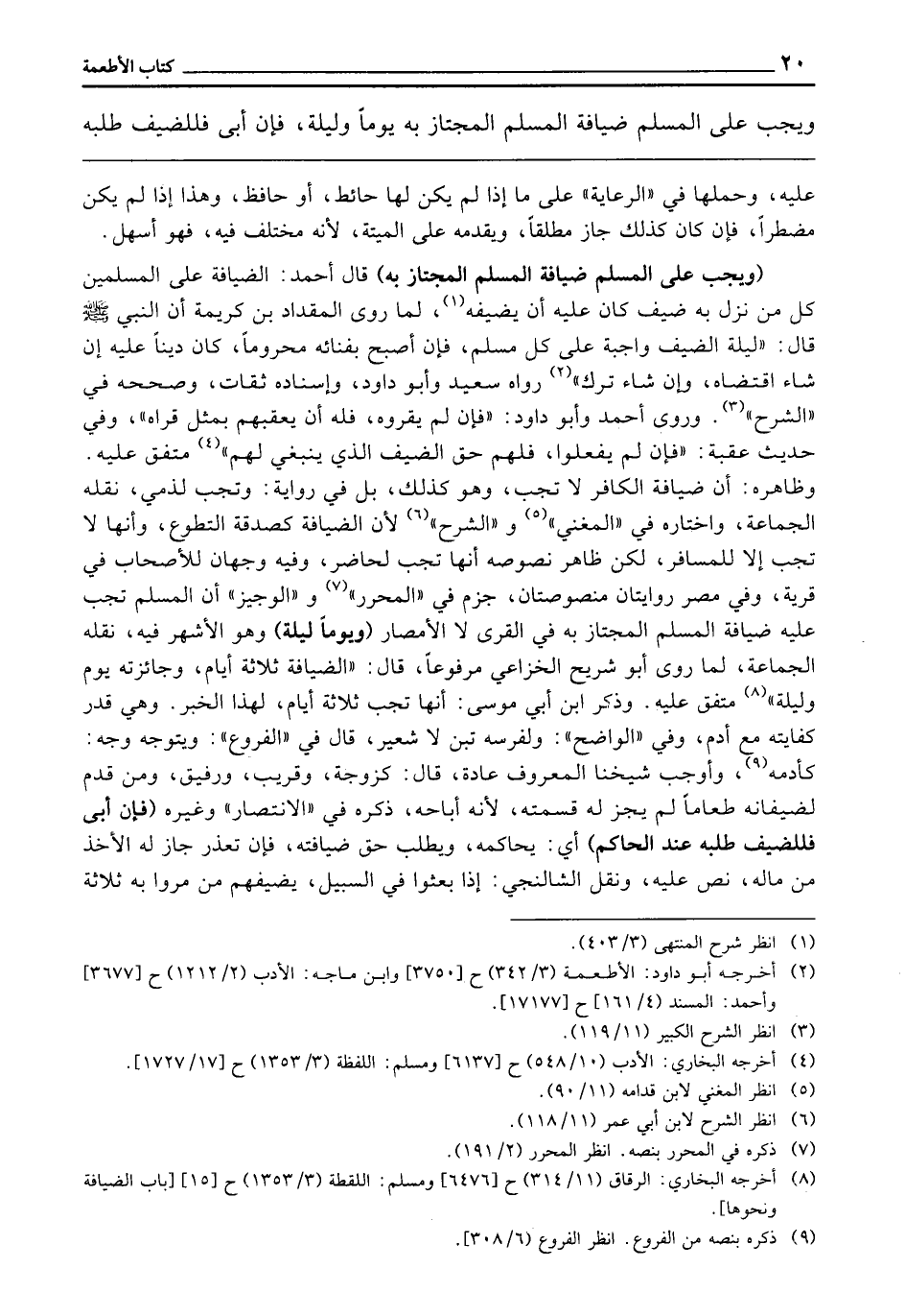 (وَيَجِبُ عَلَى الْمُسْلِمِ ضِيَافَةُ الْمُسْلِمِ الْمُجْتَازِ بِهِ) قَالَ أَحْمَدُ: الضِّيَافَةُ عَلَى الْمُسْلِمِينَ، كُلُّ مَنْ نَزَلَ بِهِ ضَيْفٌ كَانَ عَلَيْهِ أَنْ يُضَيِّفَهُ، لِمَا رَوَى الْمِقْدَادُ بْنُ كَرِيمَةَ أَنَّ النَّبِيَّ - صَلَّى اللَّهُ عَلَيْهِ وَسَلَّمَ - قَالَ: «لَيْلَةُ الضَّيْفِ وَاجِبَةٌ عَلَى كُلِّ مُسْلِمٍ فَإِنْ أَصْبَحَ بِفِنَائِهِ مَحْرُومًا كَانَ دَيْنًا عَلَيْهِ إِنْ شَاءَ اقْتَضَاهُ، وَإِنْ شَاءَ تَرَكَ.» رَوَاهُ سَعِيدٌ وَأَبُو دَاوُدَ، وَإِسْنَادُهُ ثِقَاتٌ، وَصَحَّحَهُ فِي الشَّرْحِ، وَرَوَى أَحْمَدُ وَأَبُو دَاوُدَ: «فَإِنْ لَمْ يُقْرُوهُ فَلَهُ أَنْ يُعْقِبَهُمْ بِمِثْلِ قِرَاهُ.» وَفِي حَدِيثِ عُقْبَةَ: «فَإِنْ لَمْ يَفْعَلُوا فَلَهُمْ حَقُّ الضَّيْفِ الَّذِي يَنْبَغِي لَهُمْ» . مُتَّفَقٌ عَلَيْهِ. وَظَاهِرُهُ: أَنَّ ضِيَافَةَ الْكَافِرِ لَا تَجِبُ، وَهُوَ كَذَلِكَ، بَلْ فِي رِوَايَةٍ: وَتَجِبُ لِذِمِّيٍّ، نَقَلَهُ الْجَمَاعَةُ، وَاخْتَارَهُ فِي الْمُغْنِي، وَالشَّرْحِ، لِأَنَّ الضِّيَافَةَ كَصَدَقَةِ التَّطَوُّعِ، وَأَنَّهَا لَا تَجِبُ إِلَّا لِلْمُسَافِرِ، لَكِنَّ ظَاهِرَ نُصُوصِهِ أَنَّهَا تَجِبُ لِحَاضِرٍ، وَفِيهِ وَجْهَانِ لِلْأَصْحَابِ، في قرية، وَفِي مِصْرَ رِوَايَتَانِ مَنْصُوصَتَانِ، جَزَمَ فِي الْمُحَرَّرِ، وَالْوَجِيزِ أَنَّ الْمُسْلِمَ تَجِبُ عَلَيْهِ ضِيَافَةُ الْمُسْلِمِ الْمُجْتَازِ بِهِ فِي الْقُرَى لَا الْأَمْصَارِ (يَوْمًا وَلَيْلَةً) وَهُوَ الْأَشْهَرُ فِيهِ، نَقَلَهُ الْجَمَاعَةُ، لِمَا رَوَى أَبُو شُرَيْحٍ الْخُزَاعِيُّ مَرْفُوعًا، قَالَ: «الضِّيَافَةُ ثَلَاثَةُ أَيَّامٍ، وَجَائِزَتُهُ يَوْمٌ وَلَيْلَةٌ» . مُتَّفَقٌ عَلَيْهِ. وَذَكَرَ ابْنُ أَبِي مُوسَى أَنَّهَا تَجِبُ ثَلَاثَةَ أَيَّامٍ لِهَذَا الْخَبَرِ، وَهِيَ قَدْرُ كِفَايَتِهِ مَعَ أُدُمٍ، وَفِي الْوَاضِحِ، وَلِفَرَسِهِ تِبْنٌ لَا شَعِيرٌ، قَالَ فِي الْفُرُوعِ: وَيَتَوَجَّهُ وَجْهٌ: كَأُدُمِهِ، وَأَوْجَبَ شَيْخُنَا الْمَعْرُوفُ عَادَةً، قَالَ: كَزَوْجَةٍ، وَقَرِيبٍ، وَرَفِيقٍ، وَمَنْ قَدَّمَ لِضِيفَانِهِ طَعَامًا لَمْ يَجُزْ لَهُ قِسْمَتُهُ، لِأَنَّهُ أَبَاحَهُ، ذَكَرَهُ فِي الِانْتِصَارِ وَغَيْرِهِ، (فَإِنْ أَبَى فَلِلضَّيْفِ طَلَبُهُ عِنْدَ الْحَاكِمِ) أَيْ: يُحَاكِمُهُ وَيَطْلُبُ حَقَّ ضِيَافَتِهِ، فَإِنْ تَعَذَّرَ جَازَ لَهُ الْأَخْذُ مِنْ مَالِهِ، نَصَّ عَلَيْهِ، وَنَقَلَ الشَّالَنْجِيُّ: إِذَا بُعِثُوا فِي السَّبِيلِ يُضَيِّفُهُمْ مَنْ مَرُّوا بِهِ ثَلَاثَةَ