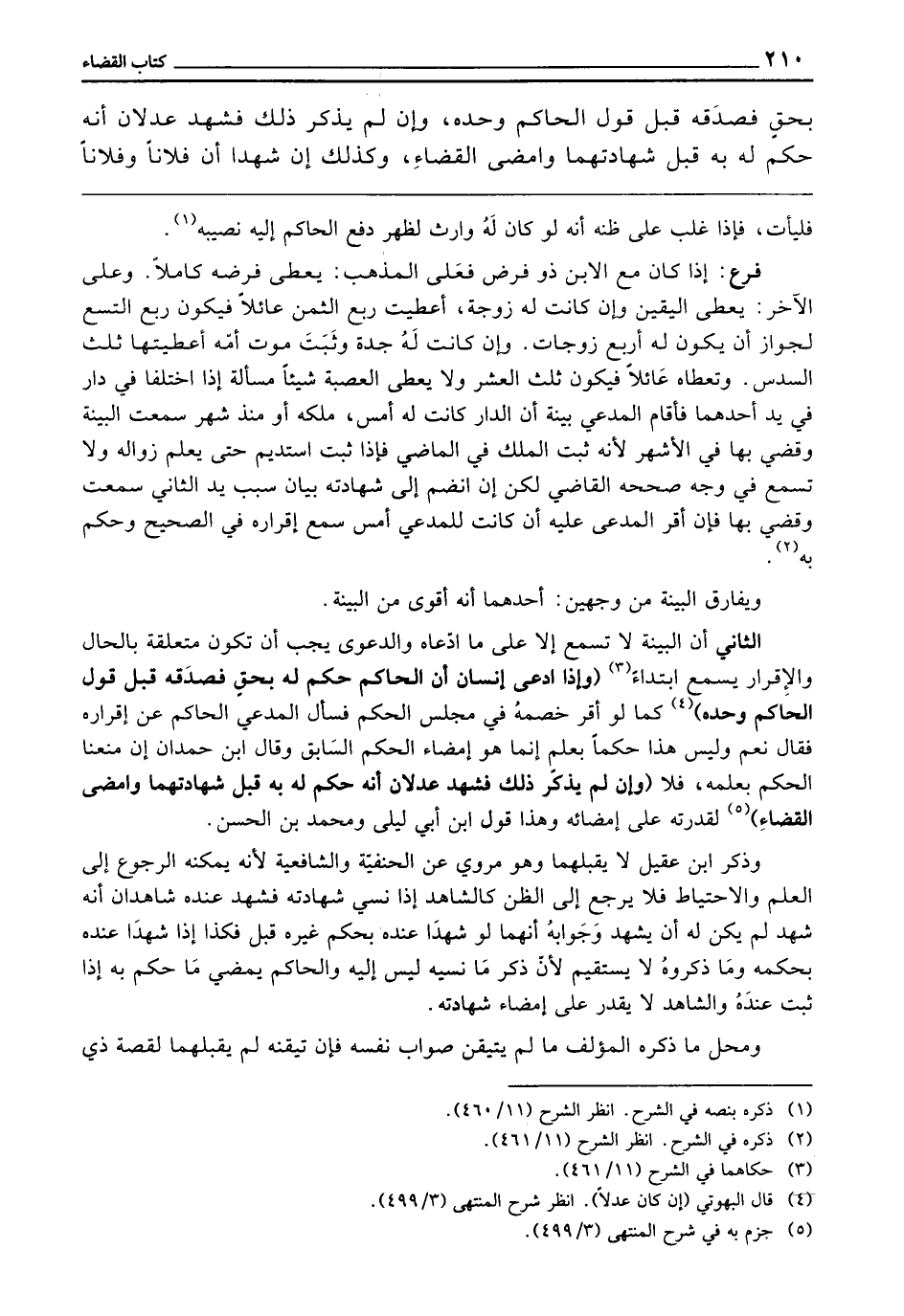 الثَّانِي: أَنَّ الْبَيِّنَةَ لَا تُسْمَعُ إِلَّا عَلَى مَا ادَّعَاهُ، وَالدَّعْوَى يَجِبُ أَنْ تَكُونَ مُتَعَلِّقَةً بِالْحَالِ، وَالْإِقْرَارُ يُسْمَعُ ابْتِدَاءً. (وَإِنِ ادَّعَى إِنْسَانٌ أَنَّ الْحَاكِمَ حَكَمَ لَهُ بِحَقٍّ فَصَدَّقَهُ، قَبِلَ قَوْلَ الْحَاكِمِ وَحْدَهُ) كَمَا لَوْ أَقَرَّ خَصْمُهُ فِي مَجْلِسِ الْحُكْمِ، فَسَأَلَ الْمُدَّعِي الْحَاكِمَ عَنْ إِقْرَارِهِ، فَقَالَ: نَعَمْ. وَلَيْسَ هَذَا حُكْمًا بِعِلْمٍ، إِنَّمَا هُوَ إِمْضَاءُ الْحُكْمِ السَّابِقِ. وَقَالَ ابْنُ حَمْدَانَ: إِنْ مَنَعَنَا الْحُكْمَ بِعِلْمِهِ، فَلَا. (وَإِنْ لَمْ يَذْكُرِ ذَلِكَ، فَشَهِدَ عَدْلَانِ أَنَّهُ حَكَمَ لَهُ بِهِ قَبْلَ شَهَادَتِهِمَا وَأَمْضَى الْقَضَاءَ) ، لِقُدْرَتِهِ عَلَى إِمْضَائِهِ. وَهَذَا قَوْلُ ابْنِ أَبِي لَيْلَى، وَمُحَمَّدِ بْنِ الْحَسَنِ.