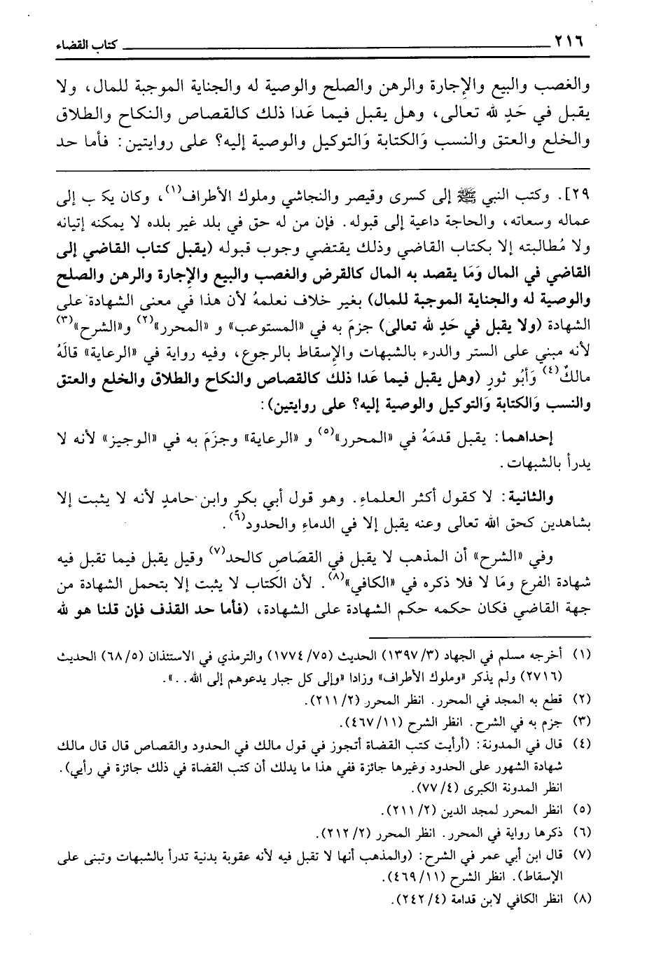 ـــــــــــــــــــــــــــــQوَكُتُبُ النَّبِيِّ - صَلَّى اللَّهُ عَلَيْهِ وَسَلَّمَ - إِلَى كِسْرَى وَقَيْصَرَ وَالنَّجَاشِيِّ وَمُلُوكِ الْأَطْرَافِ، وَكَانَ يَكْتُبُ إِلَى عُمَّالِهِ وَسُعَاتِهِ، وَالْحَاجَةُ دَاعِيَةٌ إِلَى قَبُولِهِ. فَإِنَّ مَنْ لَهُ حَقٌّ فِي بَلَدٍ غَيْرِ بَلَدِهِ لَا يُمْكِنُهُ إِتْيَانُهُ وَلَا مُطَالَبَتُهُ إِلَّا بِكِتَابِ الْقَاضِي، وَذَلِكَ يَقْتَضِي وُجُوبَ قَبُولِهِ.