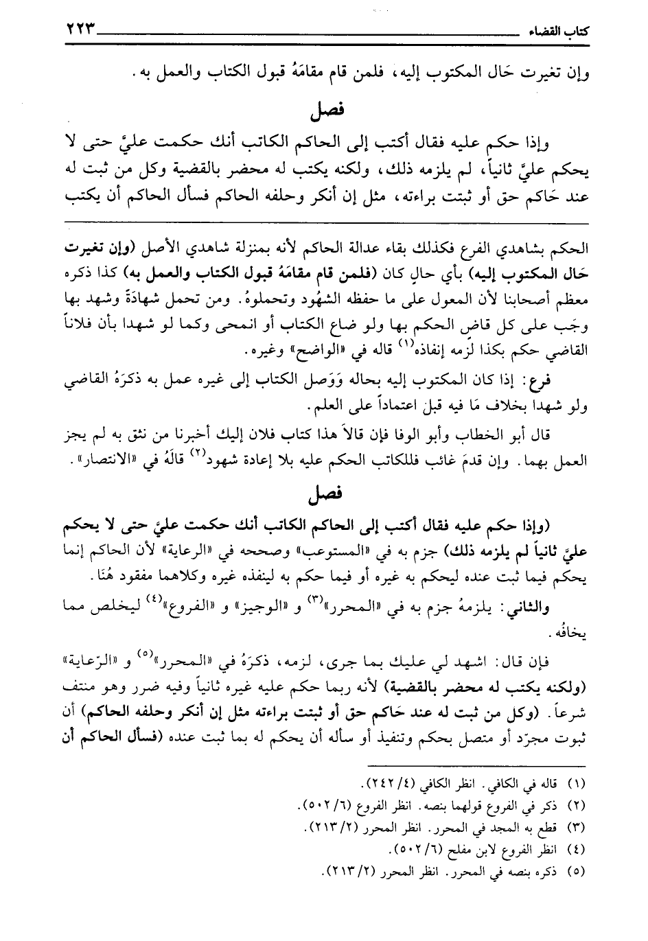 ـــــــــــــــــــــــــــــQالْحُكْمِ بِشَاهِدَيِ الْفَرْعِ، فَكَذَلِكَ بَقَاءُ عَدَالَةِ الْحَاكِمِ ; لِأَنَّهُ بِمَنْزِلَةِ شَاهِدَيِ الْأَصْلِ. (وَإِنْ تَغَيَّرَتْ حَالُ الْمَكْتُوبِ إِلَيْهِ) بِأَيِّ حَالٍ كَانَ. (فَلِمَنْ قَامَ مَقَامَهُ قَبُولُ الْكِتَابِ وَالْعَمَلُ بِهِ) كَذَا ذَكَرَهُ مُعْظَمُ أَصْحَابِنَا ; لِأَنَّ الْمُعَوَّلَ عَلَى مَا حَفِظَهُ الشُّهُودُ وَتَحَمَّلُوهُ. وَمَنْ تَحَمَّلَ شَهَادَةً وَشَهِدَ بِهَا وَجَبَ عَلَى كُلِّ قَاضٍ الْحُكْمُ بِهَا، وَلَوْ ضَاعَ الْكِتَابُ أَوِ انْمَحَى. وَكَمَا لَوْ شَهِدَا بِأَنَّ فُلَانًا الْقَاضِيَ حَكَمَ بِكَذَا، لَزِمَهُ إِنْفَاذُهُ، قَالَهُ فِي الْوَاضِحِ وَغَيْرِهِ.