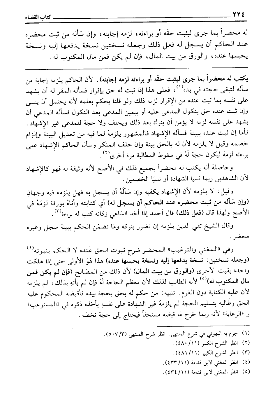 وَفِي الْمُغْنِي وَالتَّرْغِيبِ: الْمَحْضَرُ: شَرْحُ ثُبُوتِ الْحَقِّ عِنْدَهُ، لَا الْحُكْمُ بِثُبُوتِهِ. (وَجَعَلَهُ نُسْخَتَيْنِ: نُسْخَةً يَدْفَعُهَا إِلَيْهِ، وَنُسْخَةً يَحْبِسُهَا عِنْدَهُ) هَذَا هُوَ الْأَوْلَى، حَتَّى إِذَا هَلَكَتْ وَاحِدَةٌ بَقِيَتِ الْأُخْرَى. (وَالْوَرَقُ مِنْ بَيْتِ الْمَالِ) لِأَنَّ ذَلِكَ مِنَ الْمَصَالِحِ. (فَإِنْ لَمْ يَكُنْ، فَمِنْ مَالِ الْمَكْتُوبِ لَهُ) لِأَنَّهُ الطَّالِبُ لِذَلِكَ، لِأَنَّ مُعْظَمَ الْحَاجَةِ لَهُ. فَإِنْ لَمْ يَأْتِهِ بِذَلِكَ لَمْ يَلْزَمْهُ ; لِأَنَّ عَلَيْهِ الْكِتَابَةَ دُونَ الْغُرْمِ.