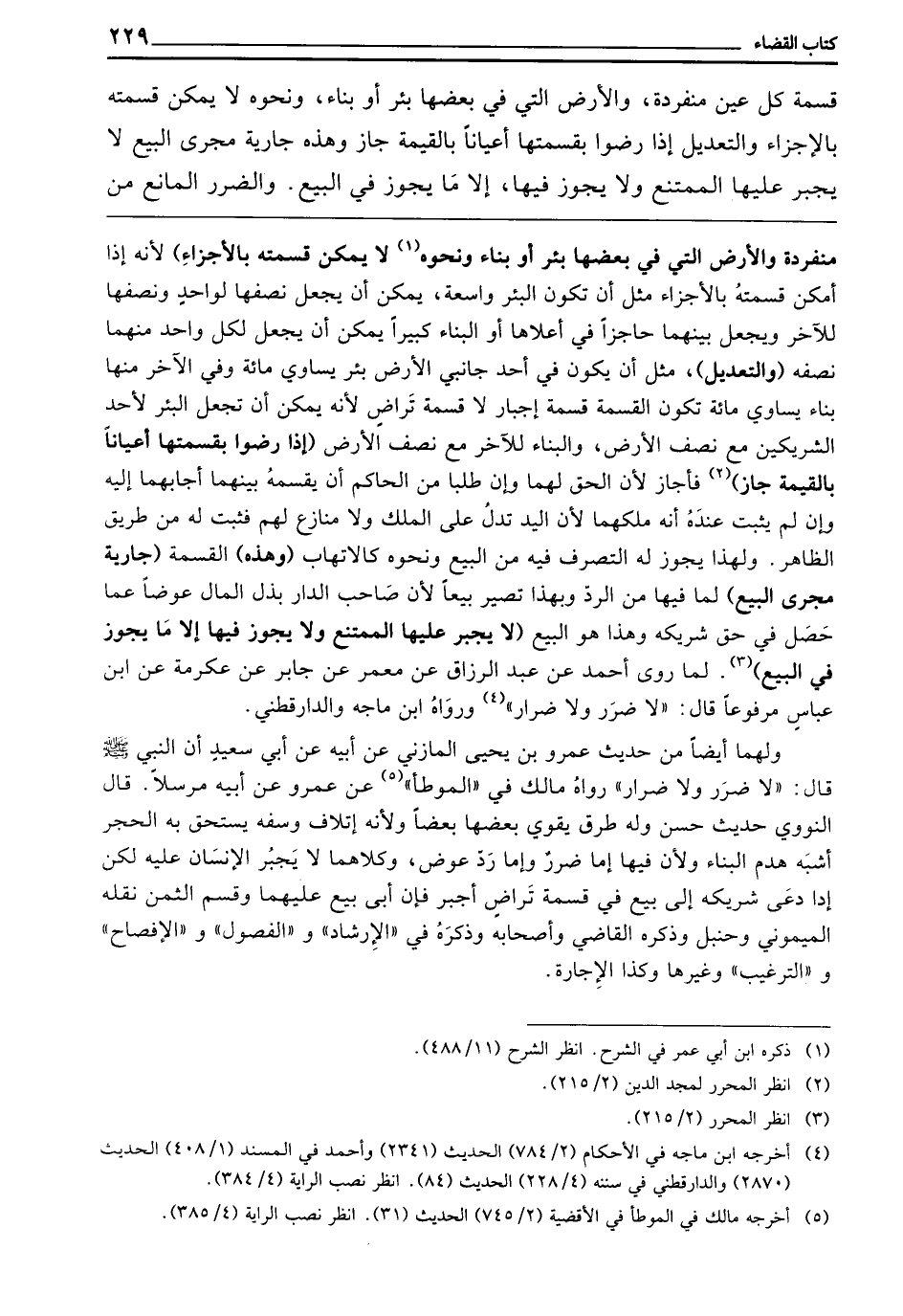 ـــــــــــــــــــــــــــــQمُنْفَرِدَةً، وَالْأَرْضِ الَّتِي فِي بَعْضِهَا بِئْرٌ أَوْ بِنَاءٌ، وَنَحْوُهُ. لَا يُمْكِنُ قِسْمَتُهُ بِالْأَجْزَاءِ) لِأَنَّهُ إِذَا أَمْكَنَ قِسْمَتُهُ بِالْأَجْزَاءِ مِثْلَ: أَنْ تَكُونَ الْبِئْرُ وَاسِعَةً، يُمْكِنُ أَنْ يَجْعَلَ نِصْفَهَا لِوَاحِدٍ وَنِصْفَهَا لِلْآخَرِ، وَيَجْعَلُ بَيْنَهُمَا حَاجِزًا فِي أَعْلَاهَا. أَوِ الْبِنَاءُ كَبِيرًا يُمْكِنُ أَنْ يُجْعَلَ لِكُلِّ وَاحِدٍ مِنْهُمَا نِصْفُهُ. (وَالتَّعْدِيلِ) مِثْلُ أَنْ يَكُونَ فِي أَحَدِ جَانِبَيِ الْأَرْضِ بِئْرٌ يُسَاوِي مِائَةً، وَفِي الْآخَرِ مِنْهَا بِنَاءٌ يُسَاوِي مِائَةً، تَكُونُ الْقِسْمَةُ قِسْمَةَ إِجْبَارٍ لَا قِسْمَةَ تَرَاضٍ ; لِأَنَّهُ يُمْكِنُ أَنْ تُجْعَلَ الْبِئْرُ لِأَحَدِ الشَّرِيكَيْنِ مَعَ نِصْفِ الْأَرْضِ، وَالْبِنَاءُ لِلْآخَرِ مَعَ نِصْفِ الْأَرْضِ. (إِذَا رَضُوا بِقِسْمَتِهَا أَعْيَانًا بِالْقِيمَةِ جَازَ) فَأَجَازَ ; لِأَنَّ الْحَقَّ لَهُمَا، وَإِنْ طَلَبَا مِنَ الْحَاكِمِ أَنْ يُقَسِّمَهُ بَيْنَهُمَا أَجَابَهُمَا إِلَيْهِ، وَإِنْ لَمْ يَثْبُتْ عِنْدَهُ أَنَّهُ مِلْكُهُمَا ; لِأَنَّ الْيَدَ تَدُلُّ عَلَى الْمِلْكِ وَلَا مُنَازِعَ لَهُمْ، فَثَبَتَ لَهُ مِنْ طَرِيقِ الظَّاهِرِ. وَلِهَذَا يَجُوزُ لَهُ التَّصَرُّفُ فِيهِ مِنَ الْبَيْعِ وَنَحْوِهِ كَالِاتِّهَابِ. (وَهَذِهِ) الْقِسْمَةُ. (جَارِيَةٌ مَجْرَى الْبَيْعِ) لِمَا فِيهَا مِنَ الرَّدِّ، وَبِهَذَا تَصِيرُ بَيْعًا ; لِأَنَّ صَاحِبَ الدَّارِ بَذَلَ الْمَالَ عِوَضًا عَمَّا حَصَلَ فِي حَقِّ شَرِيكِهِ، وَهَذَا هُوَ الْبَيْعُ. (لَا يُجْبَرُ عَلَيْهَا الْمُمْتَنِعُ، وَلَا يَجُوزُ فِيهَا إِلَّا مَا يَجُوزُ فِي الْبَيْعِ) لِمَا رَوَى أَحْمَدُ، عَنْ عَبْدِ الرَّزَّاقِ، عَنْ مَعْمَرٍ، عَنْ جَابِرٍ، عَنْ عِكْرِمَةَ، عَنِ ابْنِ عَبَّاسٍ مَرْفُوعًا، قَالَ: «لَا ضَرَرَ وَلَا ضِرَارَ» وَرَوَاهُ ابْنُ مَاجَهْ وَالدَّارَقُطْنِيُّ.
