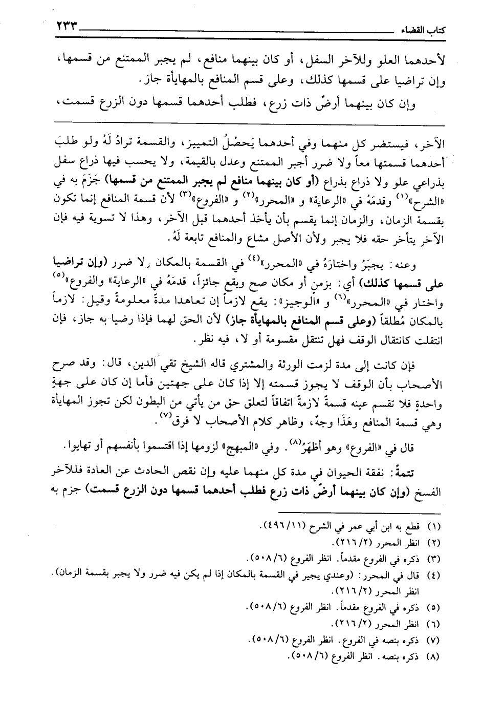 ـــــــــــــــــــــــــــــQالْآخَرِ، فَيُسْتَضَرُّ كُلٌّ مِنْهُمَا، وَفِي أَحَدِهِمَا يَحْصُلُ التَّمْيِيزُ، وَالْقِسْمَةُ تُرَادُ لَهُ. وَلَوْ طَلَبَ أَحَدُهُمَا قِسْمَتَهَا مَعًا وَلَا ضَرَرَ، أُجْبِرَ الْمُمْتَنِعُ وَعُدِلَ بِالْقِيمَةِ. وَلَا يُحْسَبُ فِيهَا ذِرَاعُ سُفْلٍ بِذِرَاعَيْ عُلُوٍّ، وَلَا ذِرَاعٌ بِذِرَاعٍ. (أَوْ كَانَ بَيْنَهُمَا مَنَافِعُ لَمْ يُجْبَرِ الْمُمْتَنِعُ مِنْ قَسْمِهَا) جَزَمَ بِهِ فِي الشَّرْحِ، وَقَدَّمَهُ فِي الرِّعَايَةِ وَالْمُحَرَّرِ وَالْفُرُوعِ ; لِأَنَّ قِسْمَةَ الْمَنَافِعِ إِنَّمَا تَكُونُ بِقِسْمَةِ الزَّمَانِ، وَالزَّمَانُ إِنَّمَا يُقْسَمُ بِأَنْ يَأْخُذَ أَحَدُهُمَا قَبْلَ الْآخَرِ، وَهَذَا لَا تَسْوِيَةَ فِيهِ، فَإِنَّ الْآخَرَ يَتَأَخَّرُ حَقُّهُ فَلَا يُجْبَرُ، وَلِأَنَّ الْأَصْلَ مُشَاعٌ وَالْمَنَافِعَ تَابِعَةٌ لَهُ.