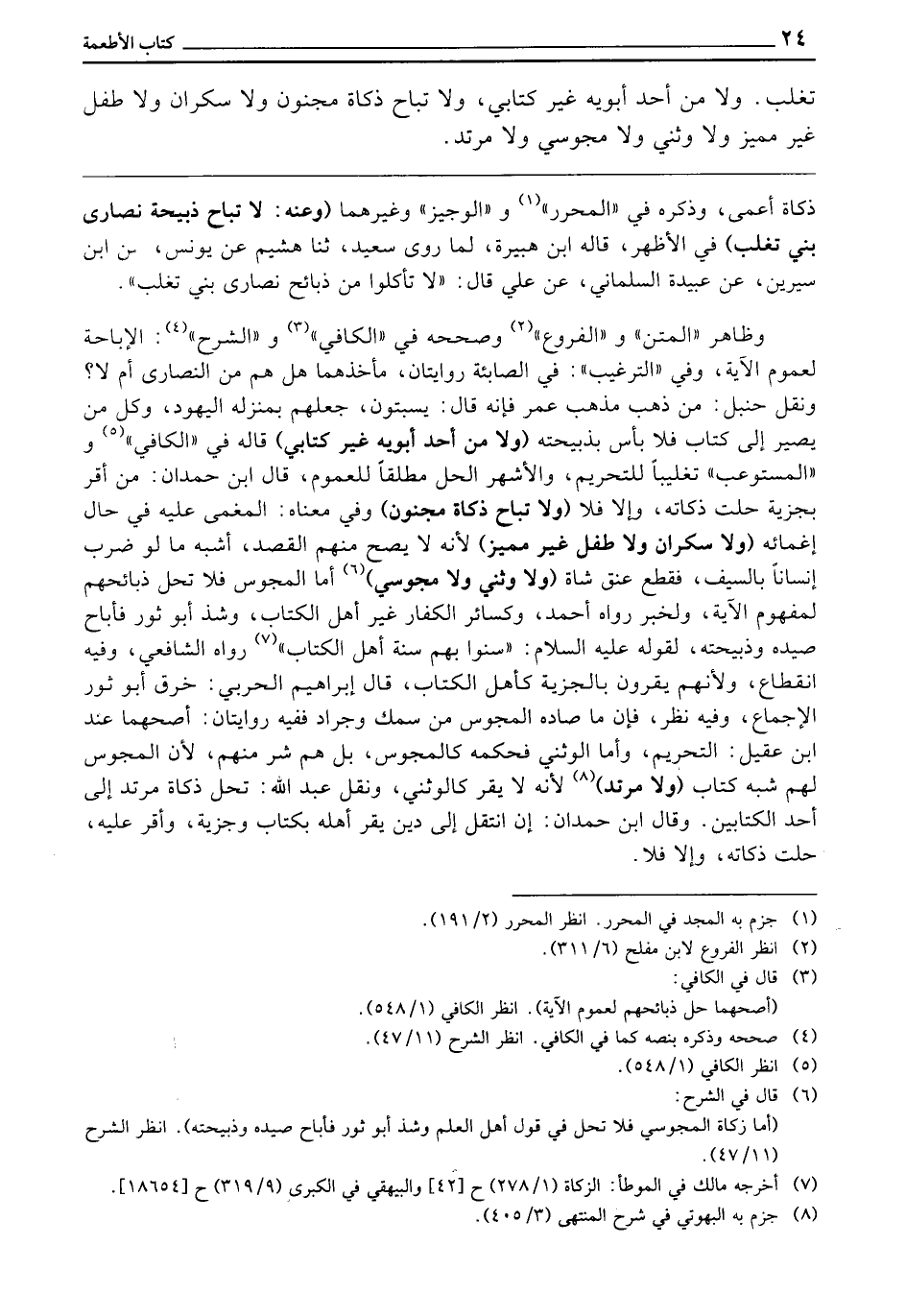 وَظَاهِرُ الْمَتْنِ وَالْفُرُوعِ وَصَحَّحَهُ فِي الْكَافِي وَالشَّرْحِ: الْإِبَاحَةُ لِعُمُومِ الْآيَةِ، وَفِي التَّرْغِيبِ: فِي الصَّابِئَةِ رِوَايَتَانِ، مَأْخَذُهُمَا هَلْ هُمْ مِنَ النَّصَارَى، أَمْ لَا؟ وَنَقَلَ حَنْبَلٌ: مَنْ ذَهَبَ مَذْهَبَ عُمَرَ فَإِنَّهُ قَالَ: يَسْبِتُونَ، جَعَلَهُمْ بِمَنْزِلَةِ الْيَهُودِ، وَكُلُّ مَنْ يَصِيرُ إِلَى كِتَابٍ فَلَا بَأْسَ بِذَبِيحَتِهِ، (وَلَا مَنْ أَحَدُ أَبَوَيْهِ غير كِتَابِيٌّ) قَالَهُ فِي الْكَافِي وَالْمُسْتَوْعِبِ: تَغْلِيبًا لِلتَّحْرِيمِ، وَالْأَشْهَرُ الْحِلُّ مُطْلَقًا لِلْعُمُومِ، قَالَ ابْنُ حَمْدَانَ: مَنْ أَقَرَّ بِجِزْيَةٍ حَلَّتْ ذَكَاتُهُ، وَإِلَّا فَلَا. (وَلَا تُبَاحُ ذَكَاةُ مَجْنُونٍ) وَفِي مَعْنَاهُ: الْمَغْمِيٌّ عَلَيْهِ فِي حَالِ إِغْمَائِهِ، (وَلَا سَكْرَانَ وَلَا طِفْلٍ غَيْرِ مُمَيِّزٍ) لِأَنَّهُ لَا يَصِحُّ مِنْهُمُ الْقَصْدُ، أَشْبَهَ مَا لَوْ ضَرَبَ إِنْسَانًا بِالسَّيْفِ، فَقَطَعَ عُنُقَ شَاةٍ (وَلَا وَثَنِيٍّ، وَلَا مَجُوسِيٍّ) أَمَّا الْمَجُوسُ فَلَا تَحِلُّ ذَبَائِحُهُمْ، لِمَفْهُومِ الْآيَةِ، وَلِخَبَرٍ رَوَاهُ أَحْمَدُ، وَكَسَائِرِ الكفار غير أَهْلِ الْكِتَابِ، وَشَذَّ أَبُو ثَوْرٍ، فَأَبَاحَ صَيْدَهُ وَذَبِيحَتَهُ، لِقَوْلِهِ - عَلَيْهِ السَّلَامُ -: «سُنُّوا بِهِمْ سُنَّةَ أَهْلِ الْكِتَابِ» . رَوَاهُ الشَّافِعِيُّ. وَفِيهِ انْقِطَاعٌ، وَلِأَنَّهُمْ يُقِرُّونَ بِالْجِزْيَةِ كَأَهْلِ الْكِتَابِ، قَالَ إِبْرَاهِيمُ الْحَرْبِيُّ: خَرَقَ أَبُو ثَوْرٍ الْإِجْمَاعَ، وَفِيهِ نَظَرٌ، فَإِنْ مَا صَادَهُ الْمَجُوسُ مِنْ سَمَكٍ وَجَرَادٍ، فَفِيهِ رِوَايَتَانِ: أَصَحُّهُمَا عِنْدَ ابْنِ عَقِيلٍ التَّحْرِيمُ، وَأَمَّا الْوَثَنِيُّ فَحُكْمُهُ كَالْمَجُوسِ، بَلْ هُمْ شَرٌّ مِنْهُمْ، لِأَنَّ الْمَجُوسَ لَهُمْ شِبْهُ كِتَابٍ، (وَلَا مُرْتَدٍّ) لِأَنَّهُ لَا يُقِرُّ كَالْوَثَنِيِّ، وَنَقَلَ عَبْدُ اللَّهِ تَحِلُّ ذَكَاةُ مُرْتَدٍّ إِلَى أَحَدِ الْكِتَابَيْنِ، وَقَالَ ابْنُ حَمْدَانَ: إِنِ انْتَقَلَ إِلَى دِينٍ يُقِرُّ أَهْلُهُ بِكِتَابٍ وَجِزْيَةٍ، وَأَقَرَّ عَلَيْهِ حَلَّتْ ذَكَاتُهُ، وَإِلَّا فَلَا