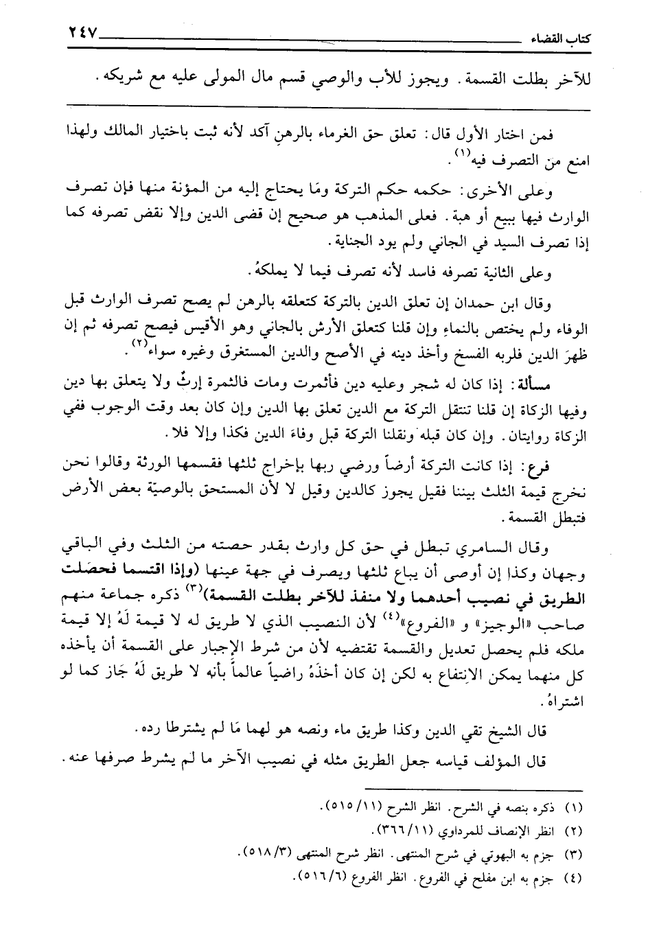 وَقَالَ السَّامَرِّيُّ: تَبْطُلُ فِي حَقِّ كُلِّ وَارِثٍ بِقَدْرِ حِصَّتِهِ مِنَ الثُّلُثِ، وَفِي الْبَاقِي وَجْهَانِ، وَكَذَا إِنْ أَوْصَى أَنْ يُبَاعَ ثُلُثُهَا وَيُصْرَفَ فِي جِهَةِ عَيْنِهَا (وَإِذَا اقْتَسَمَا فَحَصَلَتِ الطَّرِيقُ فِي نَصِيبِ أَحَدِهِمَا، وَلَا مَنْفَذَ لِلْآخَرِ بَطَلَتِ الْقِسْمَةُ) ذَكَرَهُ جَمَاعَةٌ، مِنْهُمْ صَاحِبُ الْوَجِيزِ وَالْفُرُوعِ؛ لِأَنَّ النَّصِيبَ الَّذِي لَا طَرِيقَ لَهُ لَا قِيمَةَ لَهُ إِلَّا قِيمَةُ مِلْكِهِ، فَلَمْ يَحْصُلْ تَعْدِيلٌ، وَالْقِسْمَةُ تَقْتَضِيهِ؛ لِأَنَّ مِنْ شَرْطِ الْإِجْبَارِ عَلَى الْقِسْمَةِ أَنْ يَأْخُذَهُ كُلٌّ مِنْهُمَا يُمْكِنُ الِانْتِفَاعُ بِهِ، لَكِنْ إِنْ كَانَ أَخَذَهُ رَاضِيًا عَالِمًا بِأَنَّهُ لَا طَرِيقَ لَهُ جَازَ، كَمَا لَوِ اشْتَرَاهُ.