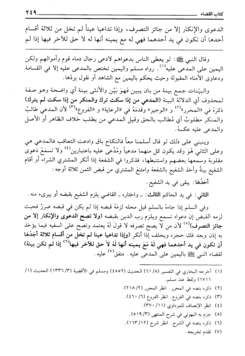 ـــــــــــــــــــــــــــــQوَقَالَ النَّبِيُّ - صَلَّى اللَّهُ عَلَيْهِ وَسَلَّمَ -: «لَوْ يُعْطَى النَّاسُ بِدَعْوَاهُمْ، لَادَّعَى رِجَالٌ دِمَاءَ قَوْمٍ وَأَمْوَالَهُمْ، وَلَكِنَّ الْيَمِينَ عَلَى الْمُدَّعَى عَلَيْهِ» . رَوَاهُ مُسْلِمٌ، وَالْيَمِينُ تَخْتَصُّ بِالْمُدَّعَى عَلَيْهِ إِلَّا فِي الْقَسَامَةِ وَدَعَاوَى الْأُمَنَاءِ الْمَقْبُولَةِ، وَحَيْثُ يَحْكُمُ بِالْيَمِينِ مَعَ الشَّاهِدِ أَوْ نَقُولُ بِرَدِّهَا، وَالْبَيِّنَاتُ: جَمْعُ بَيِّنَةٍ، مِنْ بَانَ يَبِينُ فَهُوَ بَيِّنٌ، وَالْأُنْثَى: بَيِّنَةٌ، أَيْ: وَاضِحَةٌ، وَهُوَ صِفَةٌ لِمَحْذُوفٍ، أَيِ: الدَّلَالَةُ الْبَيِّنَةُ، (الْمُدَّعِي: مَنْ إِذَا سَكَتَ تَرَكَ، وَالْمُنْكِرُ: مَنْ إِذَا سَكَتَ لَمْ يَتْرُكْ) ذَكَرَهُ فِي الْمُحَرَّرِ وَالْوَجِيزِ، وَقَدَّمَهُ فِي الرِّعَايَةِ وَالْفُرُوعِ؛ لِأَنَّ الْمُدَّعِيَ طَالِبٌ وَالْمُنْكِرَ مَطْلُوبٌ؛ أَيْ: مُطَالَبٌ بِالْحَقِّ، وَقِيلَ: الْمُدَّعِي مَنْ يَطْلُبُ خِلَافَ الظَّاهِرِ أَوِ الْأَصْلِ، وَالْمُدَّعَى عَلَيْهِ عَكْسُهُ. / 50 وَيَنْبَنِي عَلَى ذَلِكَ لَوْ قَالَ: أَسْلَمْنَا مَعًا، فَالنِّكَاحُ بَاقٍ، وَادَّعَتِ التَّعَاقُبَ، فَالْمُدَّعِي هِيَ، وَعَلَى الثَّانِي هُوَ، وَقَدْ يَكُونُ كُلٌّ مِنْهُمَا مُدَّعِيًا وَمُدَّعًى عَلَيْهِ بِاعْتِبَارَيْنِ، وَلَا تُسْمَعُ دَعْوَى مَقْلُوبَةٌ وَسَمِعَهَا بَعْضُهُمْ وَاسْتَنْبَطَهَا، فَذَكَرُوا فِي الشُّفْعَةِ إِذَا أَنْكَرَ الْمُشْتَرِي الشِّرَاءَ أَوْ أَقَامَ الشَّفِيعُ بَيِّنَةً، وَأَخَذَ الشَّفِيعُ بِالشُّفْعَةِ وَامْتَنَعَ الْمُشْتَرِي مِنْ قَبْضِ الثَّمَنِ، ثَلَاثَةُ أَوْجُهٍ: