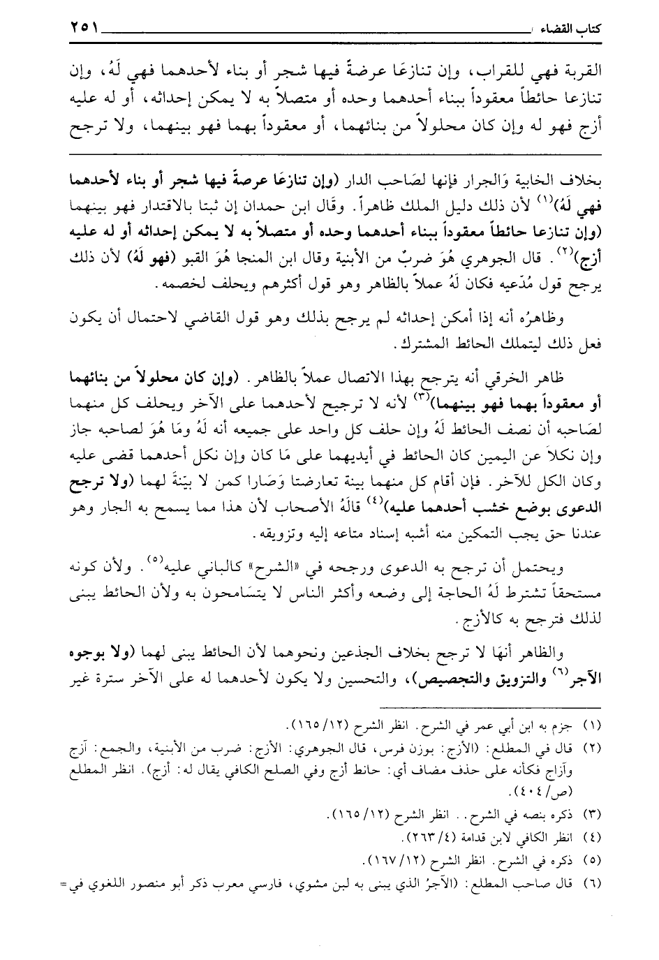 ـــــــــــــــــــــــــــــQبِخِلَافِ الْخَابِيَةِ وَالْجَرَّارِ فَإِنَّهُمَا لِصَاحِبِ الدَّارِ (وَإِنْ تَنَازَعَا عَرْصَةً فِيهَا شَجَرٌ أَوْ بِنَاءً لِأَحَدِهِمَا فَهِيَ لَهُ) لِأَنَّ ذَلِكَ دَلِيلُ الْمِلْكِ ظَاهِرًا، وَقَالَ ابْنُ حَمْدَانَ: إِنْ ثَبَتَا بِالِاقْتِدَارِ فَهُوَ بَيْنَهُمَا (وَإِنْ تَنَازَعَا حَائِطًا مَعْقُودًا بِبِنَاءِ أَحَدِهِمَا وَحْدَهُ، أَوْ مُتَّصِلًا بِهِ لَا يُمْكِنُ إِحْدَاثُهُ، أَوْ لَهُ عَلَيْهِ أَزْجٌ) قَالَ الْجَوْهَرِيُّ: هُوَ ضَرْبٌ مِنَ الْأَبْنِيَةِ، وَقَالَ ابْنُ الْمُنَجَّا: هُوَ الْقَبْوُ (فَهُوَ لَهُ) لِأَنَّ ذَلِكَ يُرَجِّحُ قَوْلَ مُدَّعِيهِ، فَكَانَ لَهُ عَمَلًا بِالظَّاهِرِ، وَهُوَ قَوْلُ أَكْثَرِهِمْ، وَيَحْلِفُ لِخَصْمِهِ.